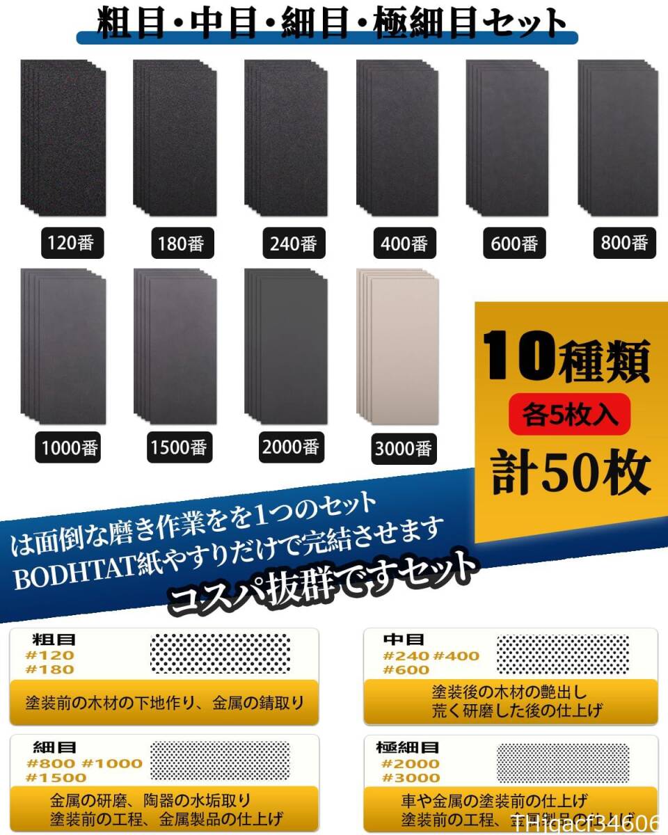 BODHTAT 紙やすり 耐水ペーパー セット 50枚入10種類 #120~3000番 230×93mm サンドペーパー (120