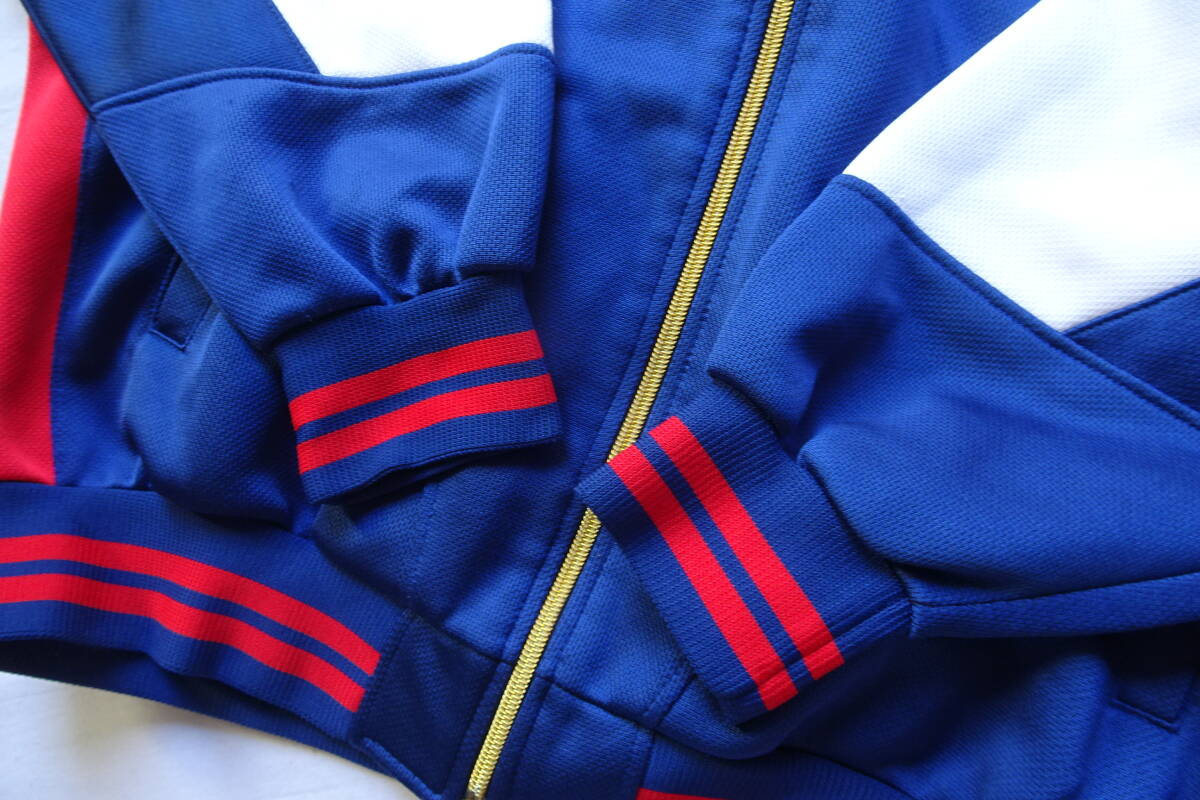 首ぐり、袖口、裾は赤2本ライン入りリブ素材です。