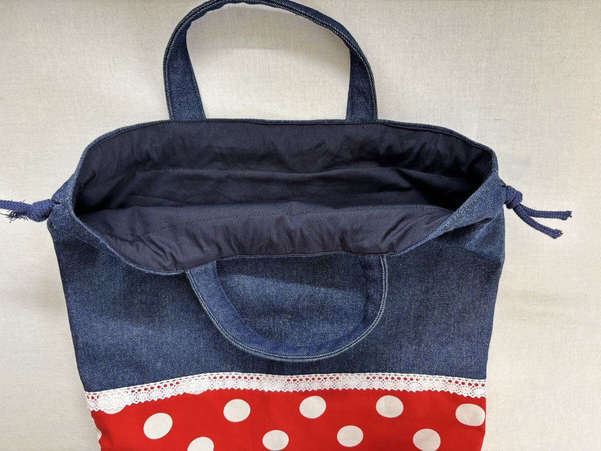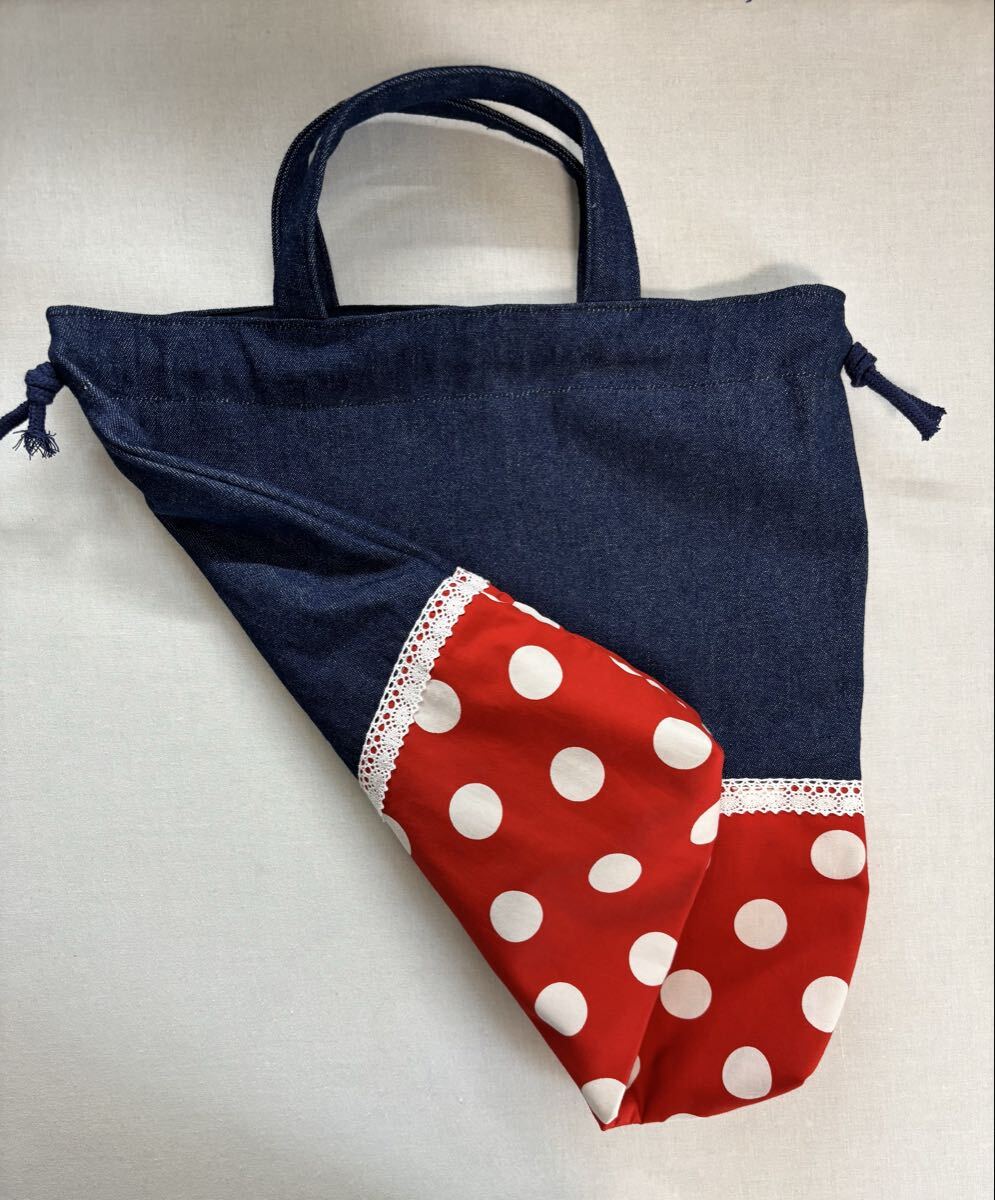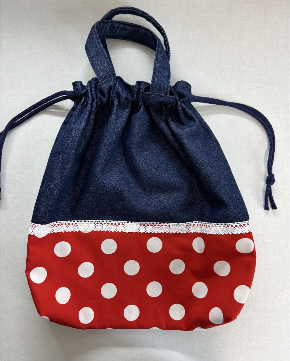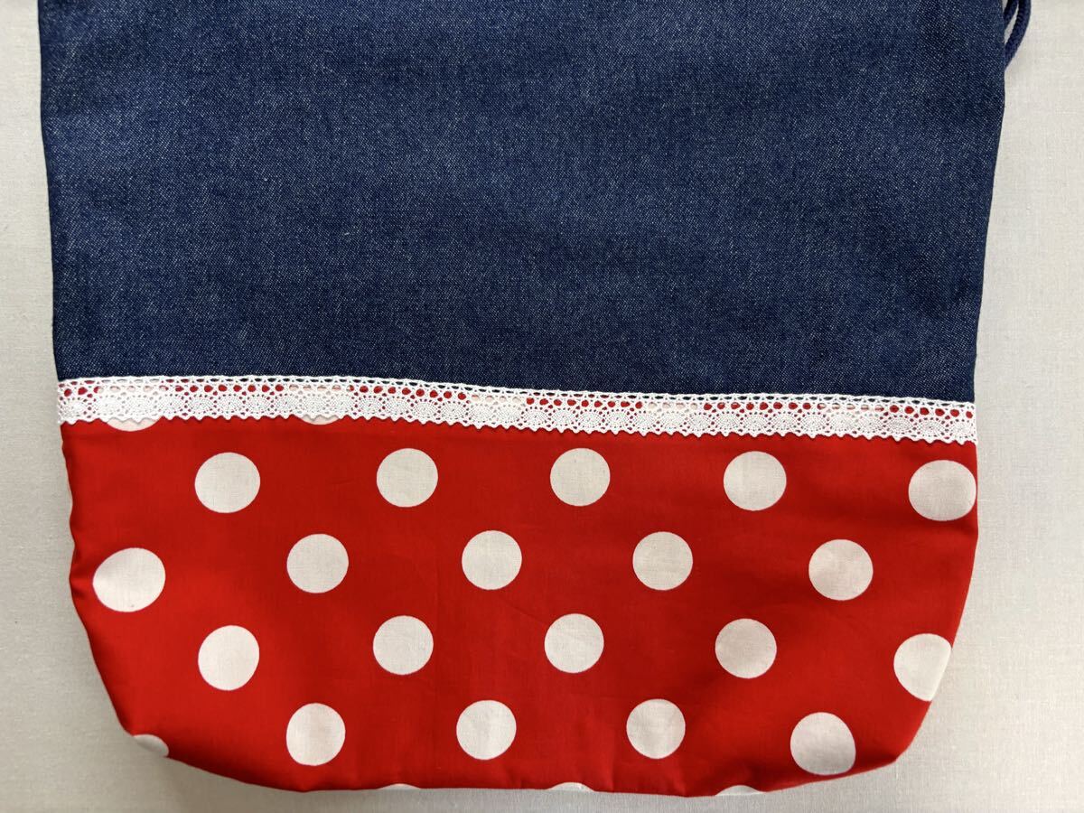 ハンドメイド 体操服入れ【紺デニム×赤白水玉】レースつき