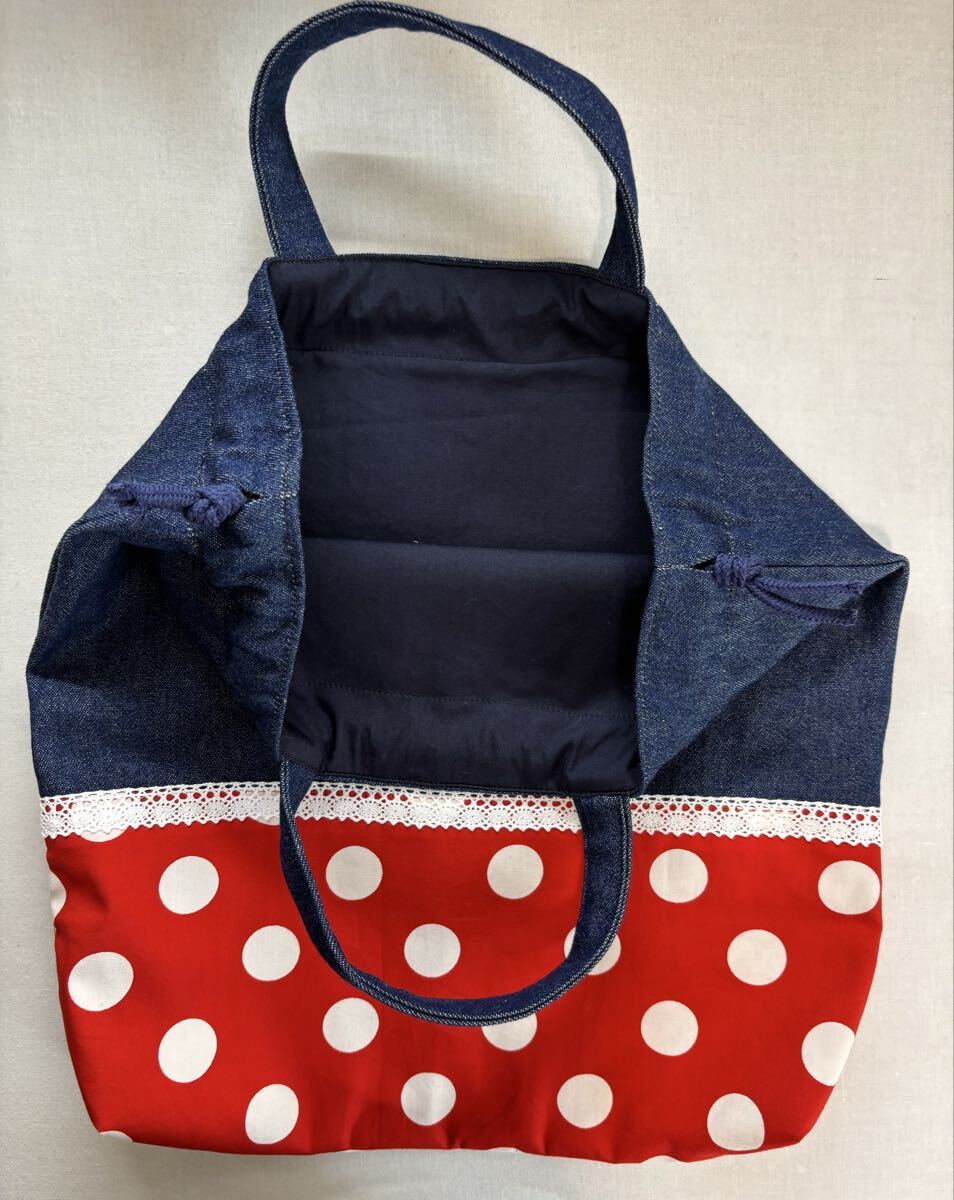 薄手の紺デニム生地に、赤白水玉生地とレースを合わせて作成しました。