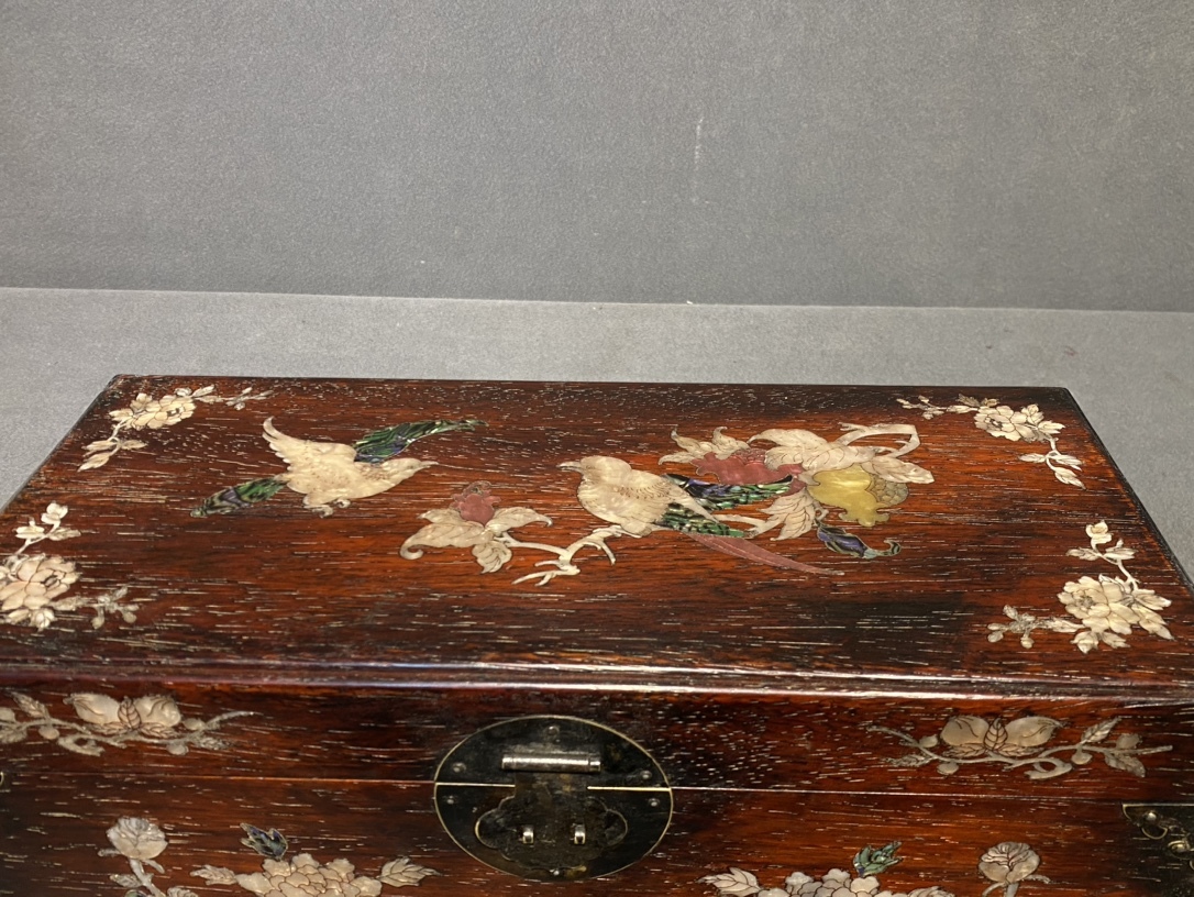 早期收集 旧藏 古紫檀木彫 嵌貝殼 花鳥紋 箱子 收納箱 置物 賞物 時代物 古董品 骨董 旧家蔵出し 唐物 中国古玩 古美術品