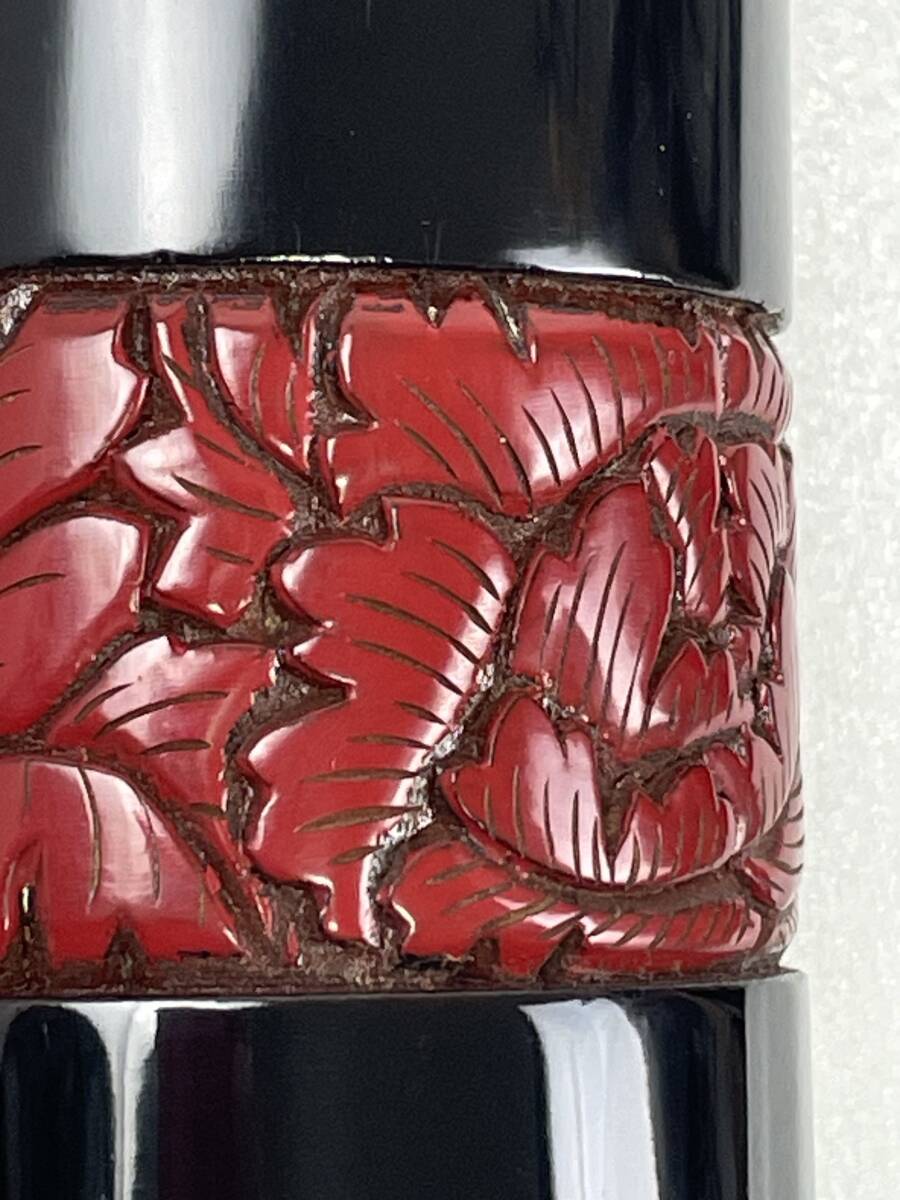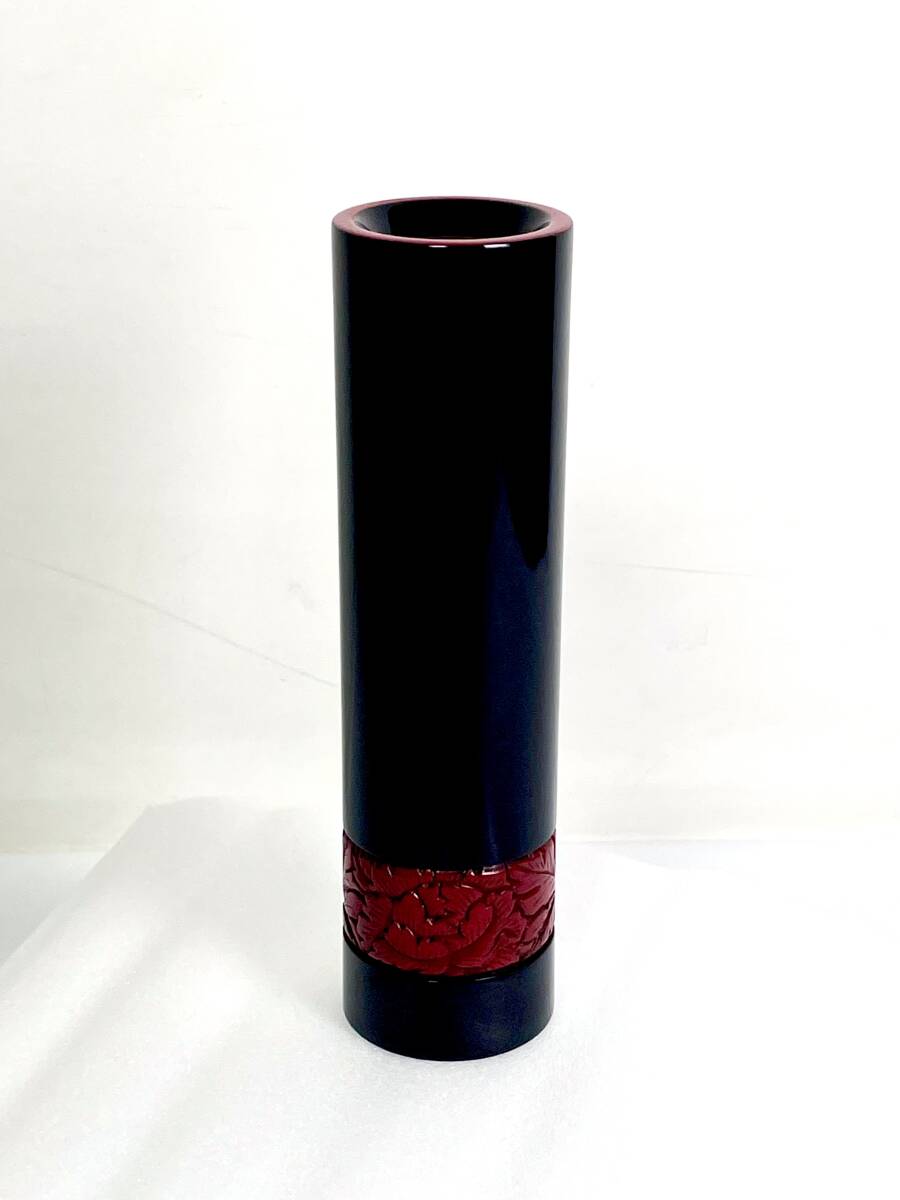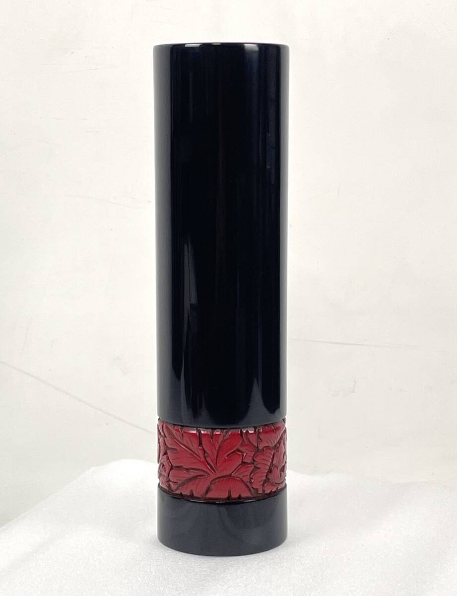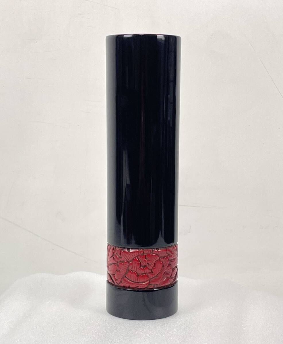 村上堆朱 木彫り 花器 牡丹 筒型 入れ子付 約24㎝ 新潟県無形文化財 中古 現状品 返品不可 花入 花瓶