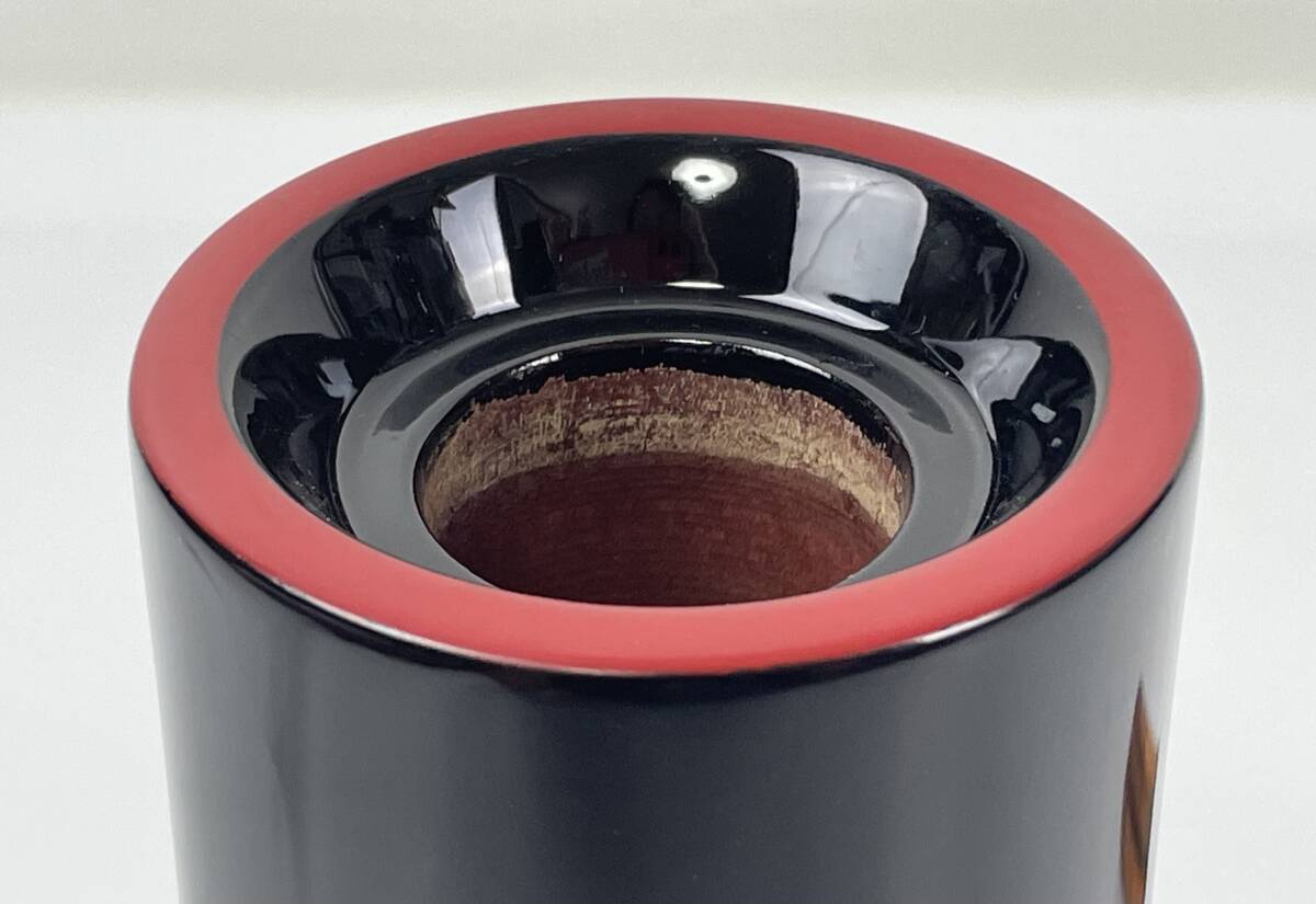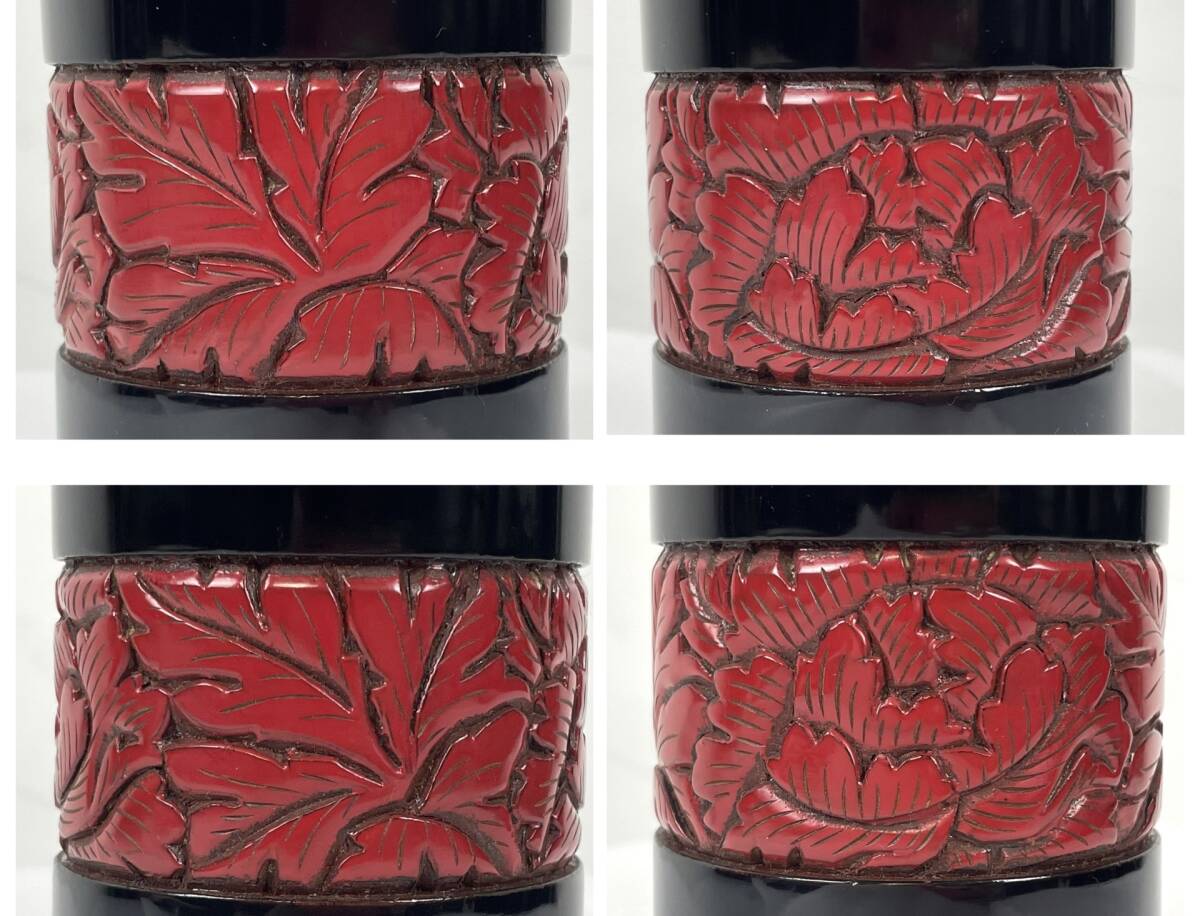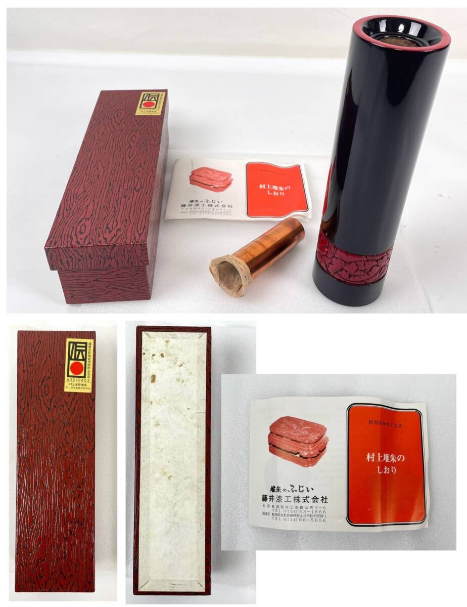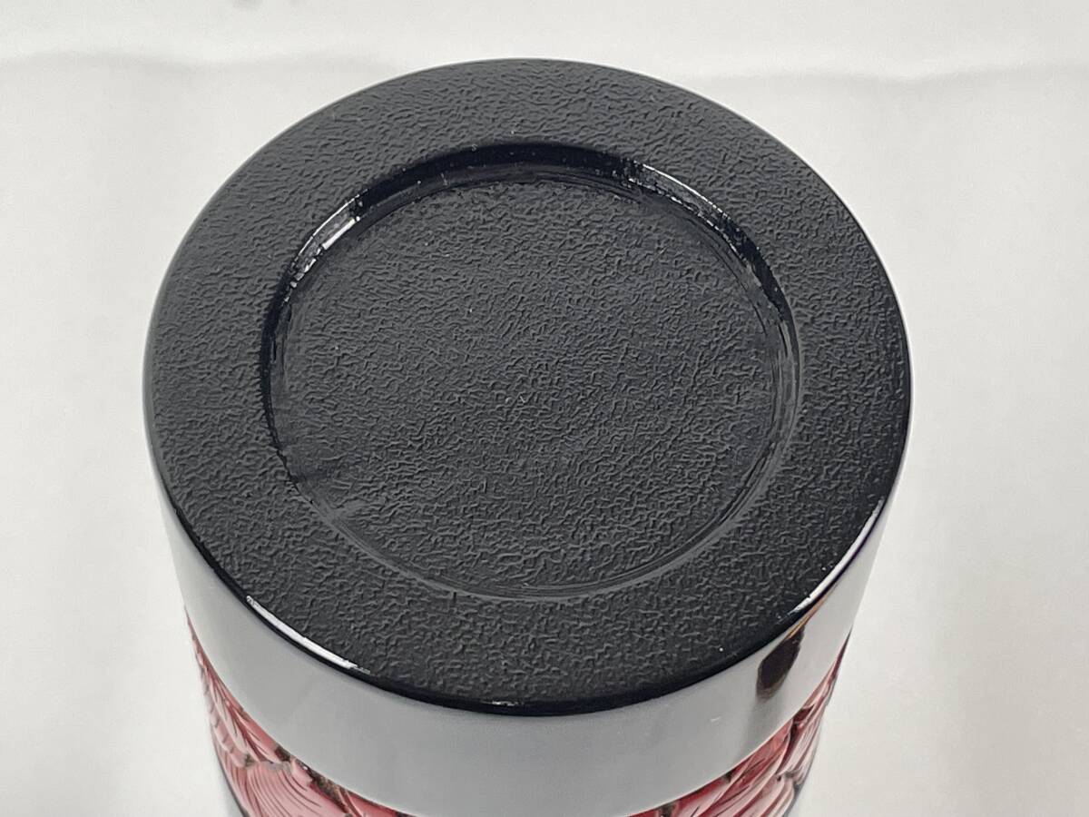 村上堆朱 木彫り 花器 牡丹 筒型 入れ子付 約24㎝ 新潟県無形文化財 中古 現状品 返品不可 花入 花瓶