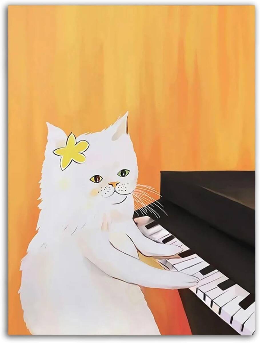 擬人化された猫たちが楽しくピアノを弾いているデザインで、見るだけで思わず笑顔になる絵画。