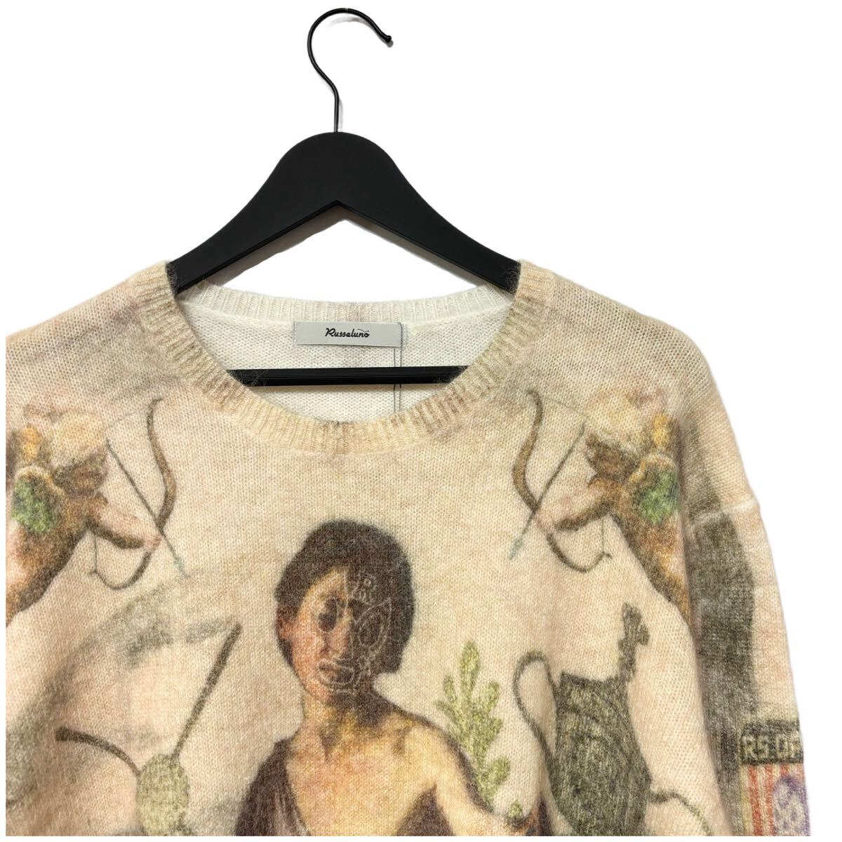 毛足の長い上品なアンゴラニットに大胆なグラフィックをプリントしたクルーネックニット。