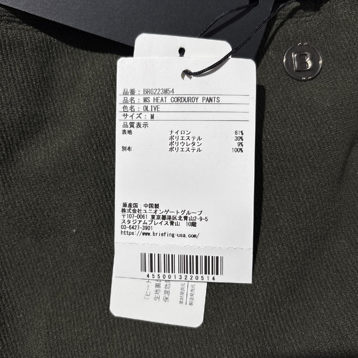 coco 未使用品 ブリーフィング BRIEFING メンズ パンツ M カーキ オリーブ 裏起毛 コーデュロイ 防寒 120373