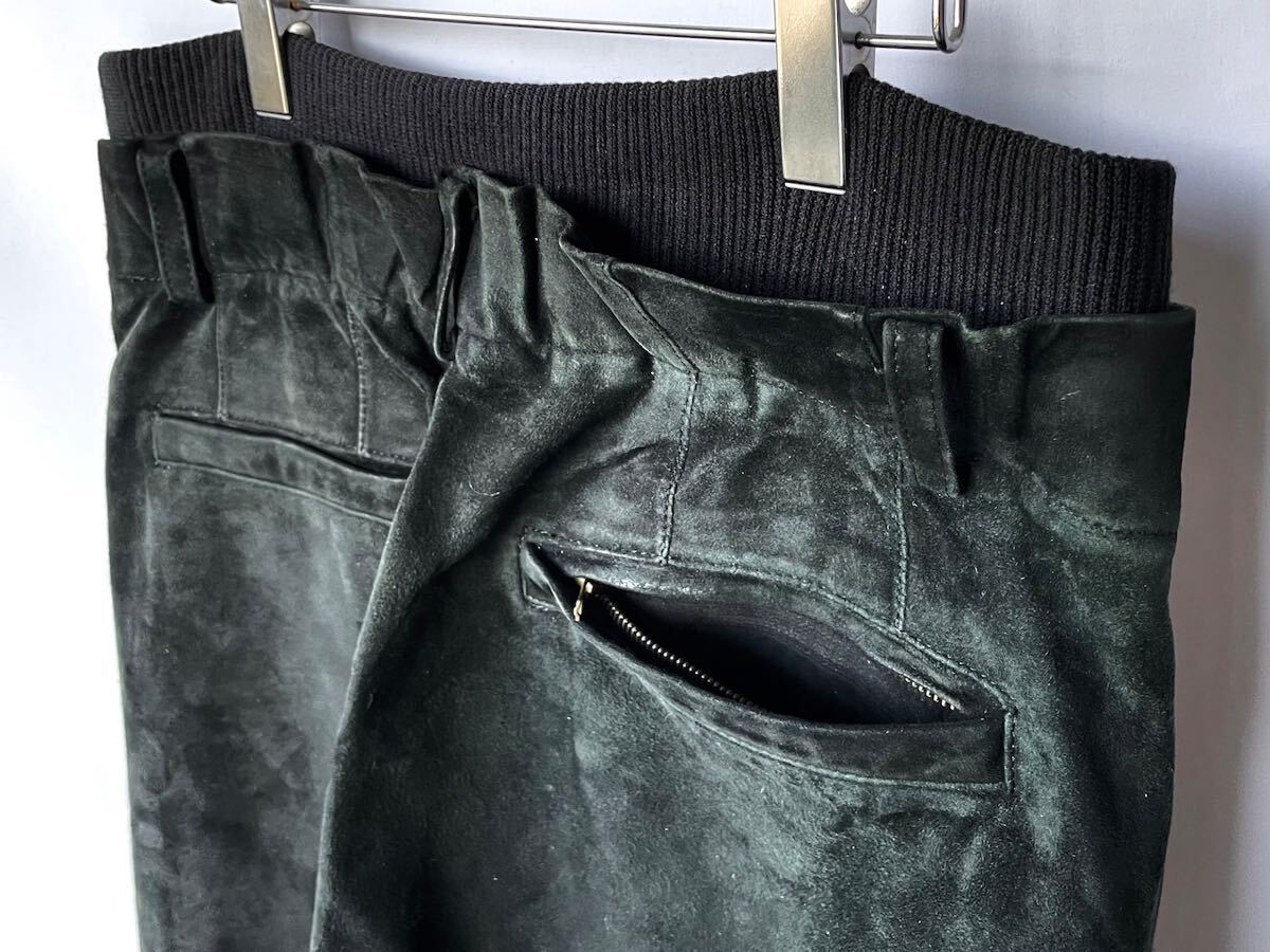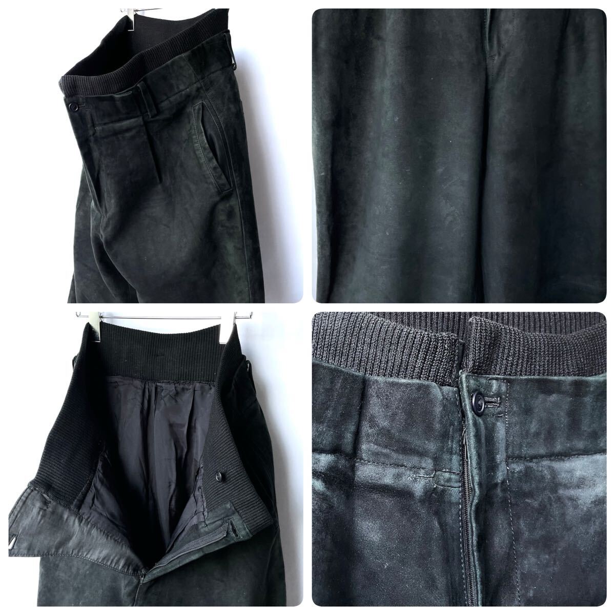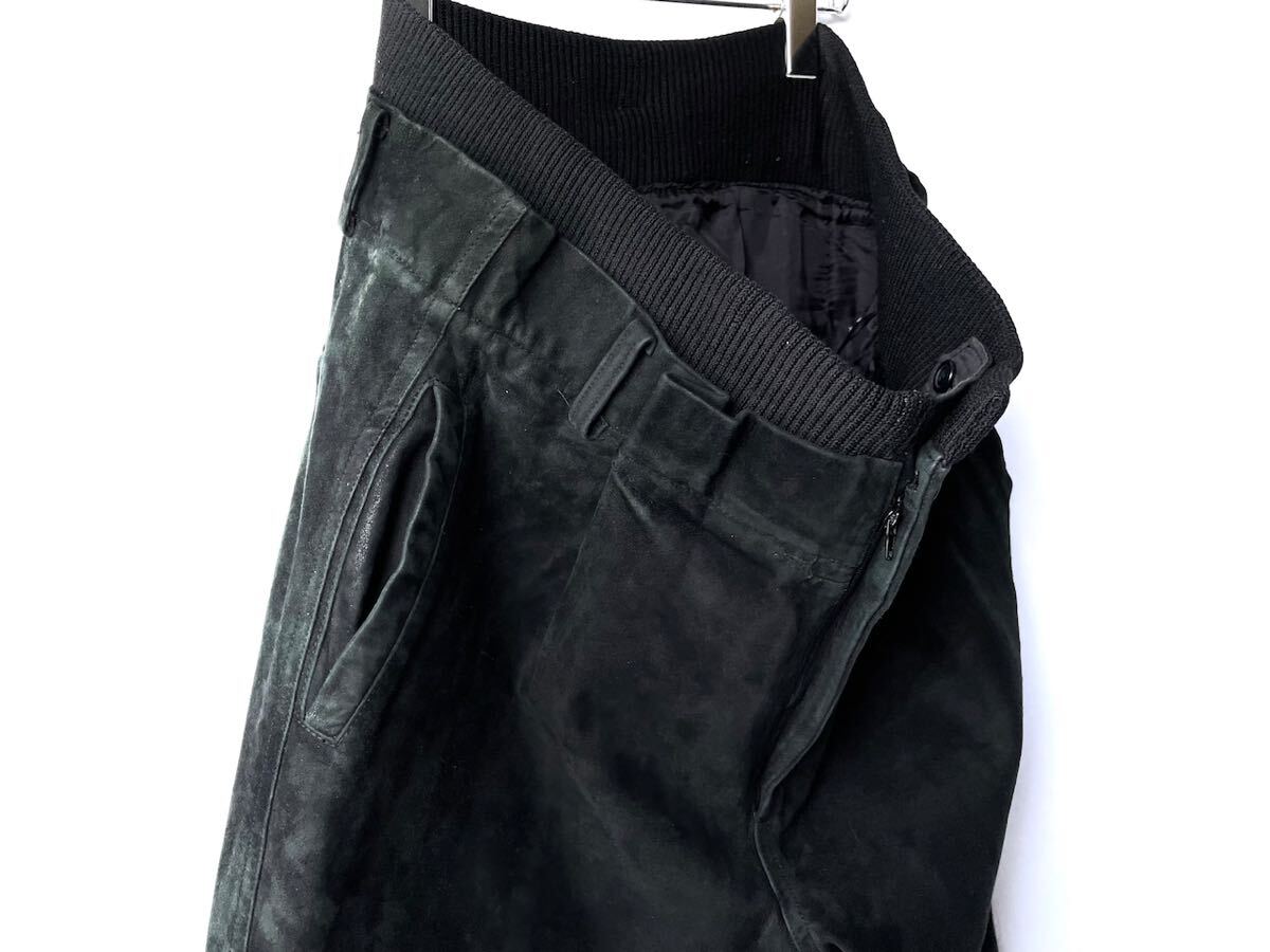 The charcoal to navy-black body features the characteristic leather unevenness, while the waist is lined with pure black wool ribbing.