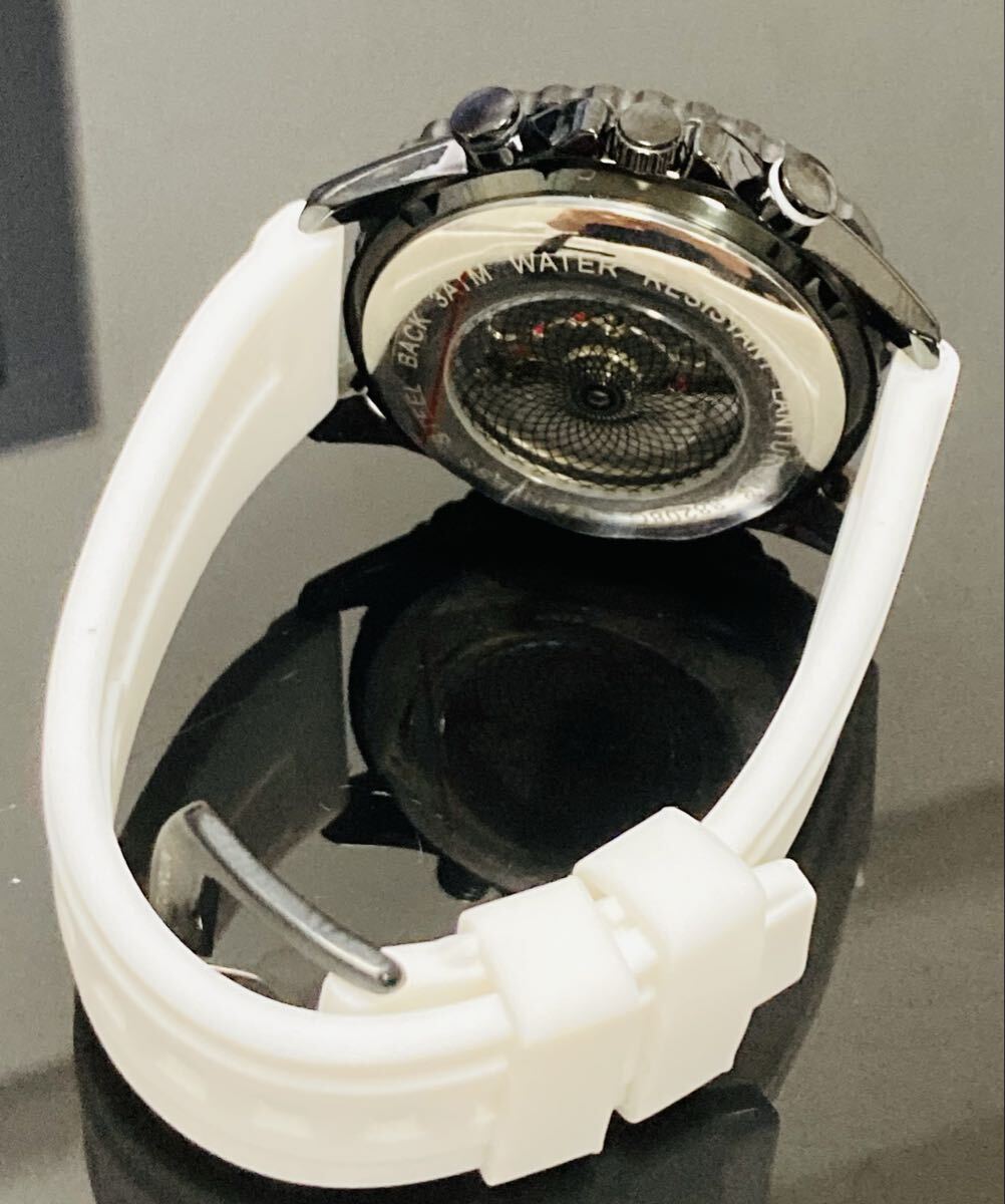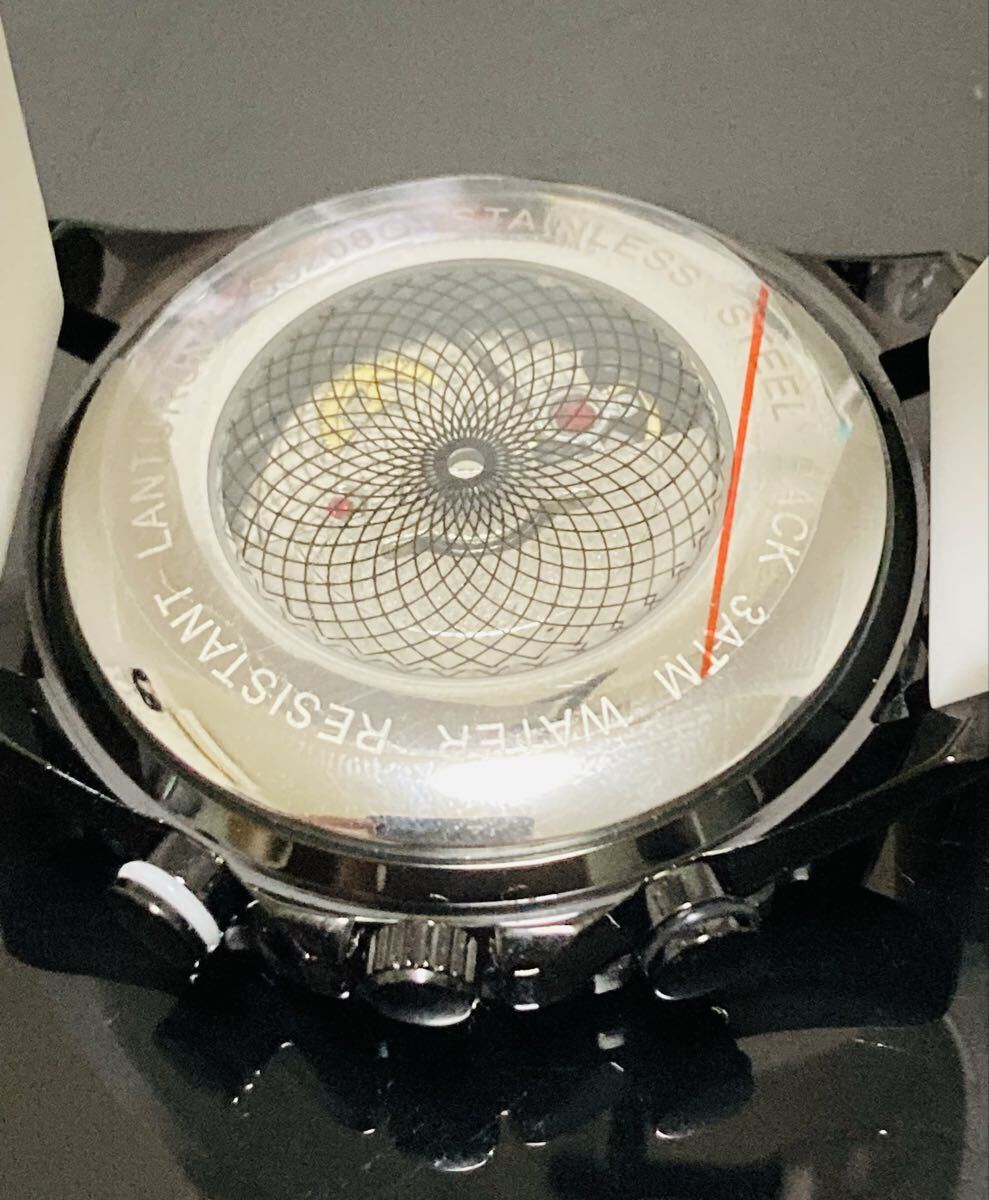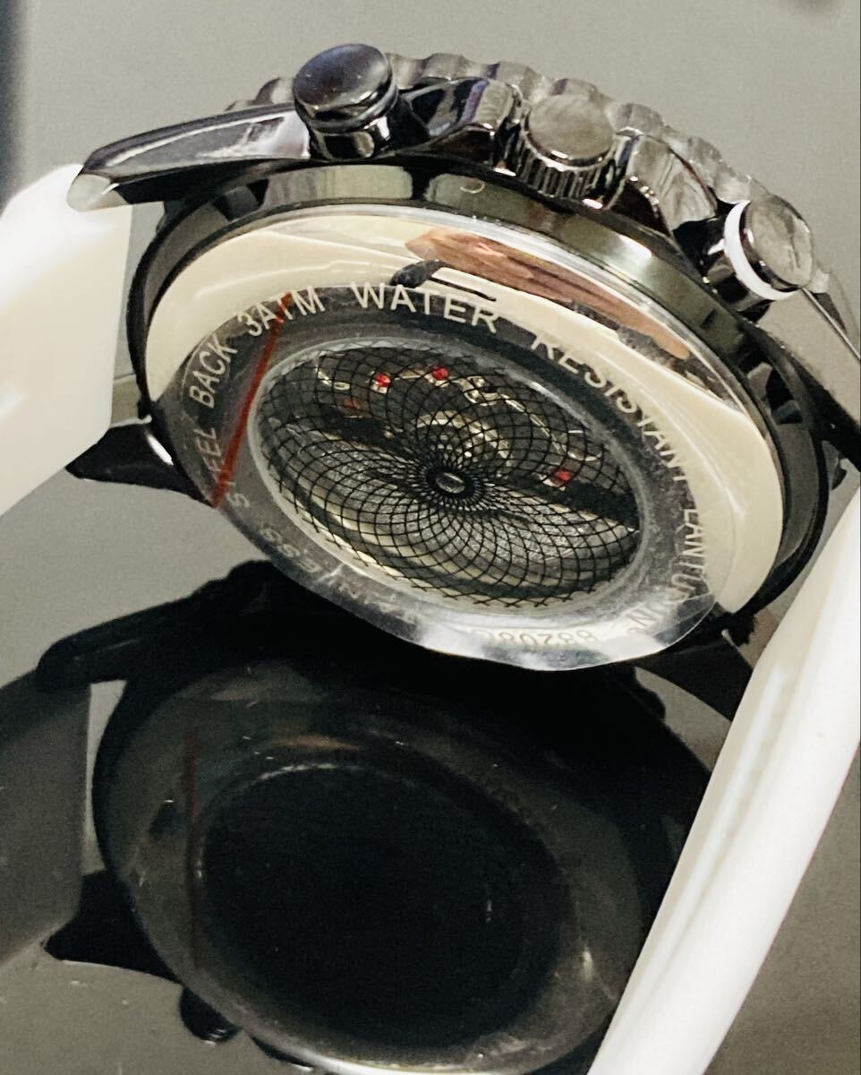 ケース裏は機械式デザインとなっており内部が遠心力でクルクルと音が出て回るモデルとなっております