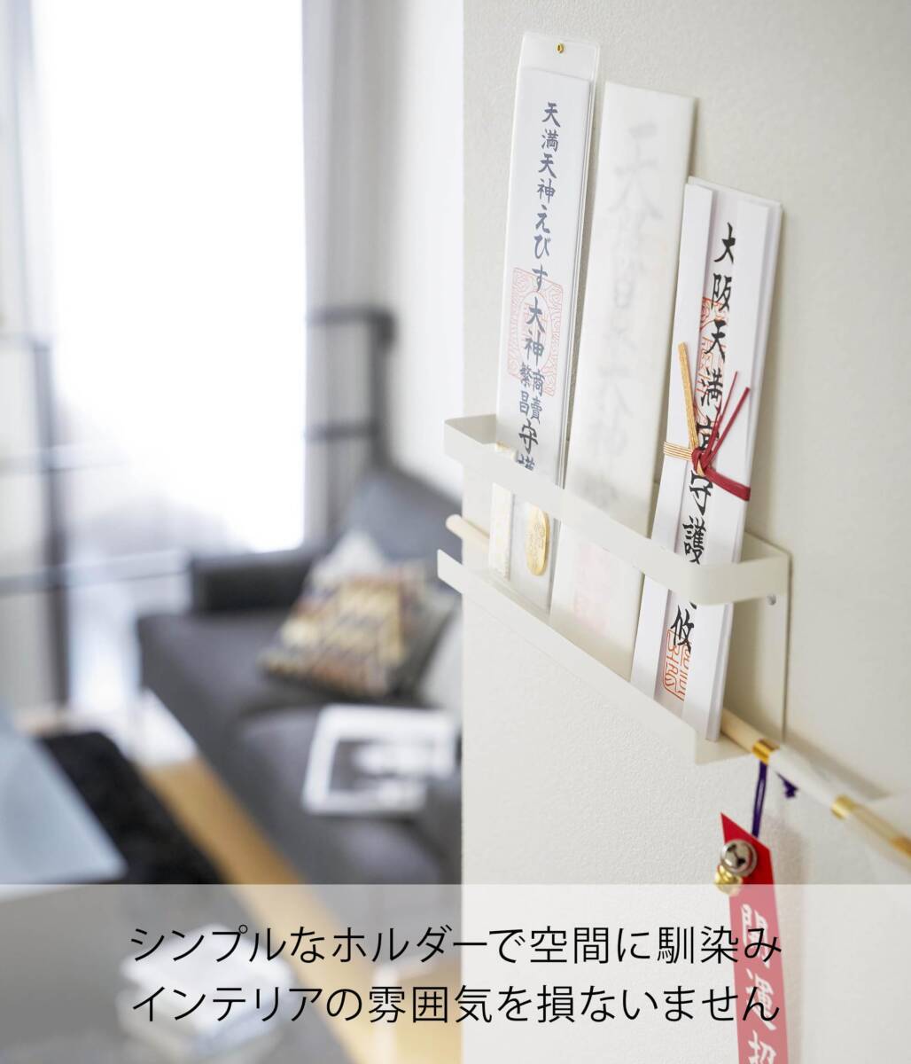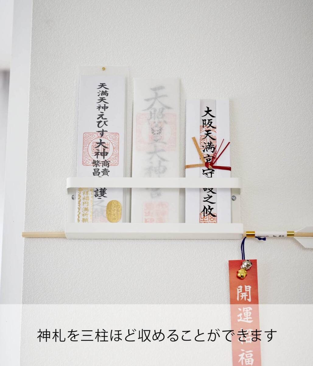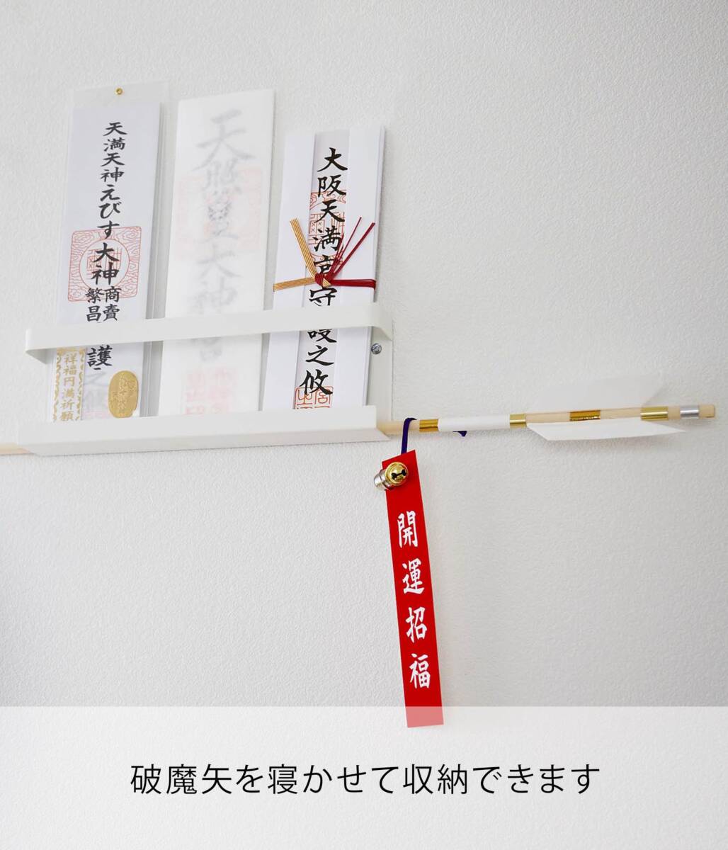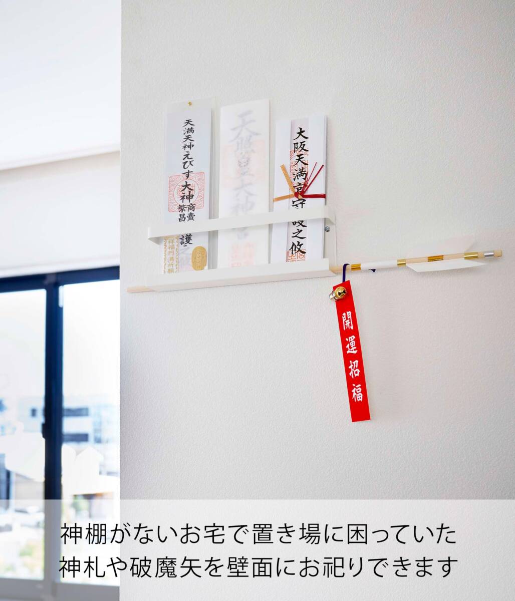 神札や破魔矢の定位置に!壁に付属の 木ネジ 又は 石こうボード用プッシュピンで固定するだけ。神棚がないご家庭で置き場に困っていた神札や破魔矢を一緒に収納することができます。