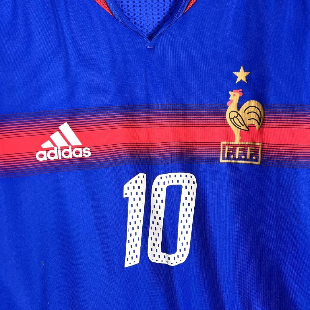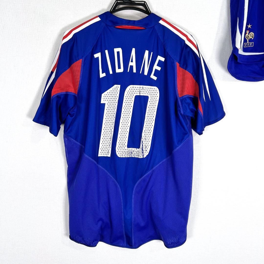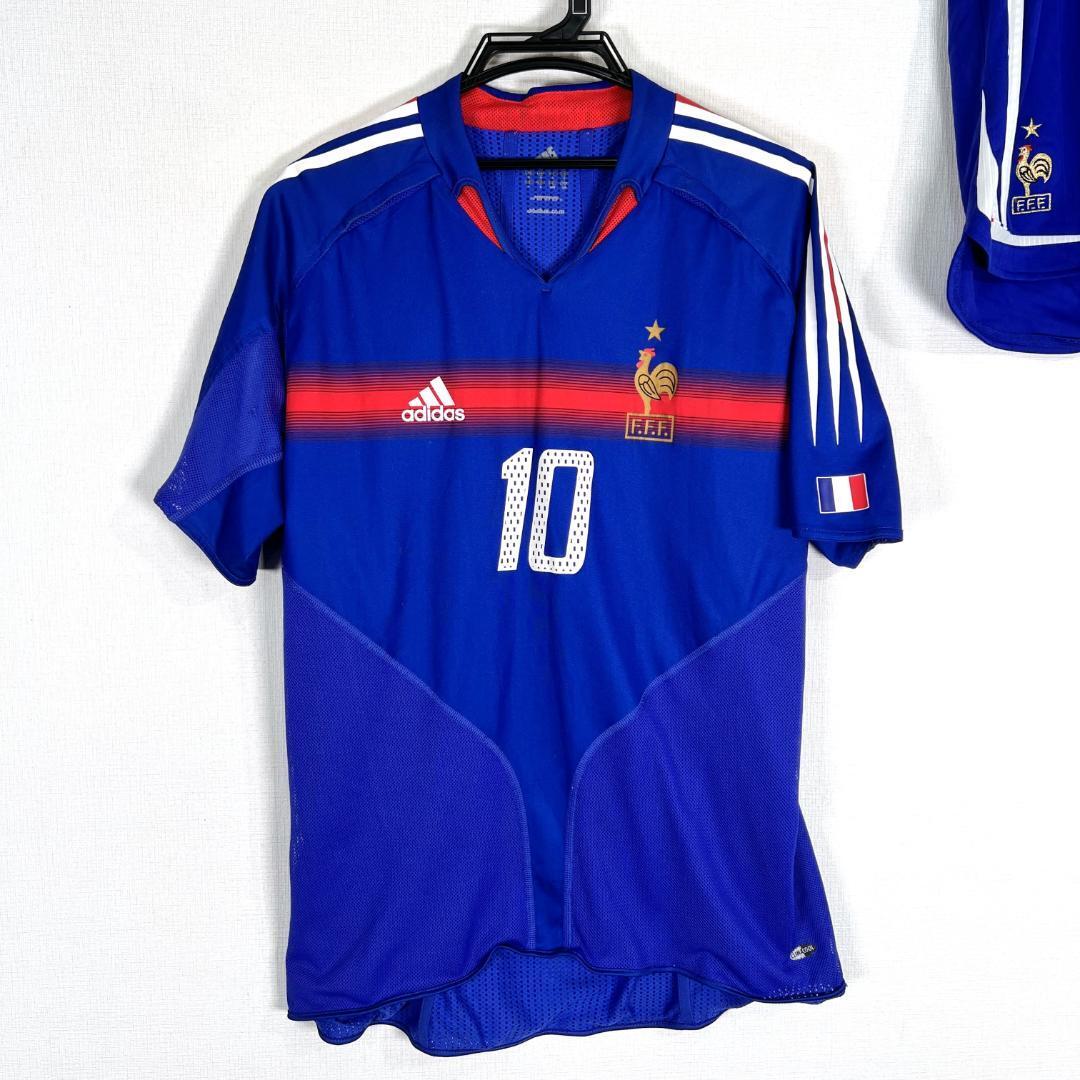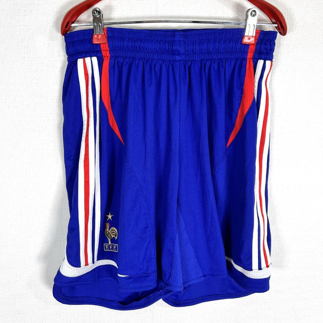 男性用のブルー系のサッカーウェア ユニフォーム サッカーシャツ ハーフパンツ 上下セット 2点セットです。中古品ですが背番号プリント部にひび割れがあります。その他は特に目立つような傷や汚れはありません。古着 アディダス フランス代表サッカーチーム ジネディーヌ・ジダン Zinedine Zidane 背番号: 10 France national football team 2006 FIFAワールドカップ フランス代表ホームユニフォーム(adidas製)