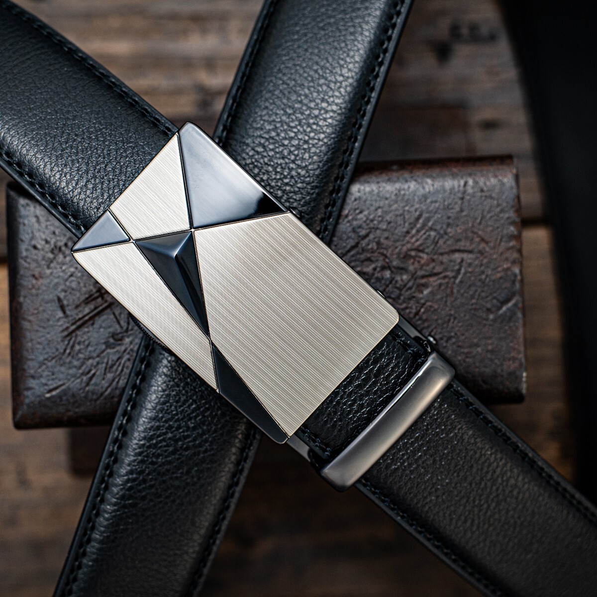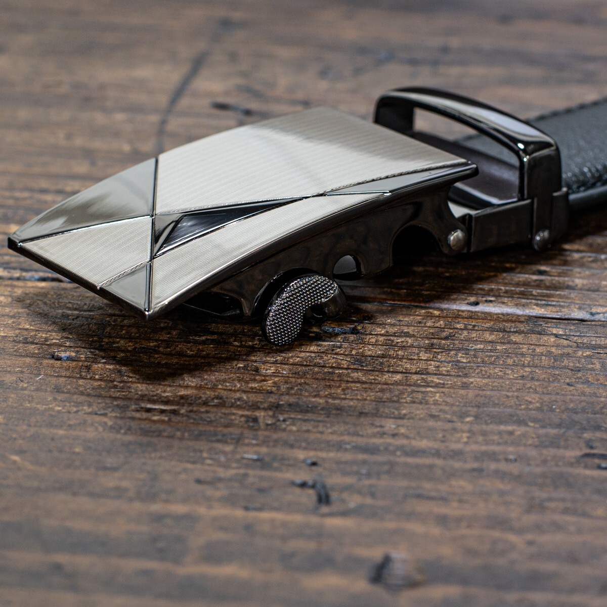 バックルは直線的なラインを強調したメタルデザインで、落ち着いたヘアライン加工の光沢が知的な印象を与えます。