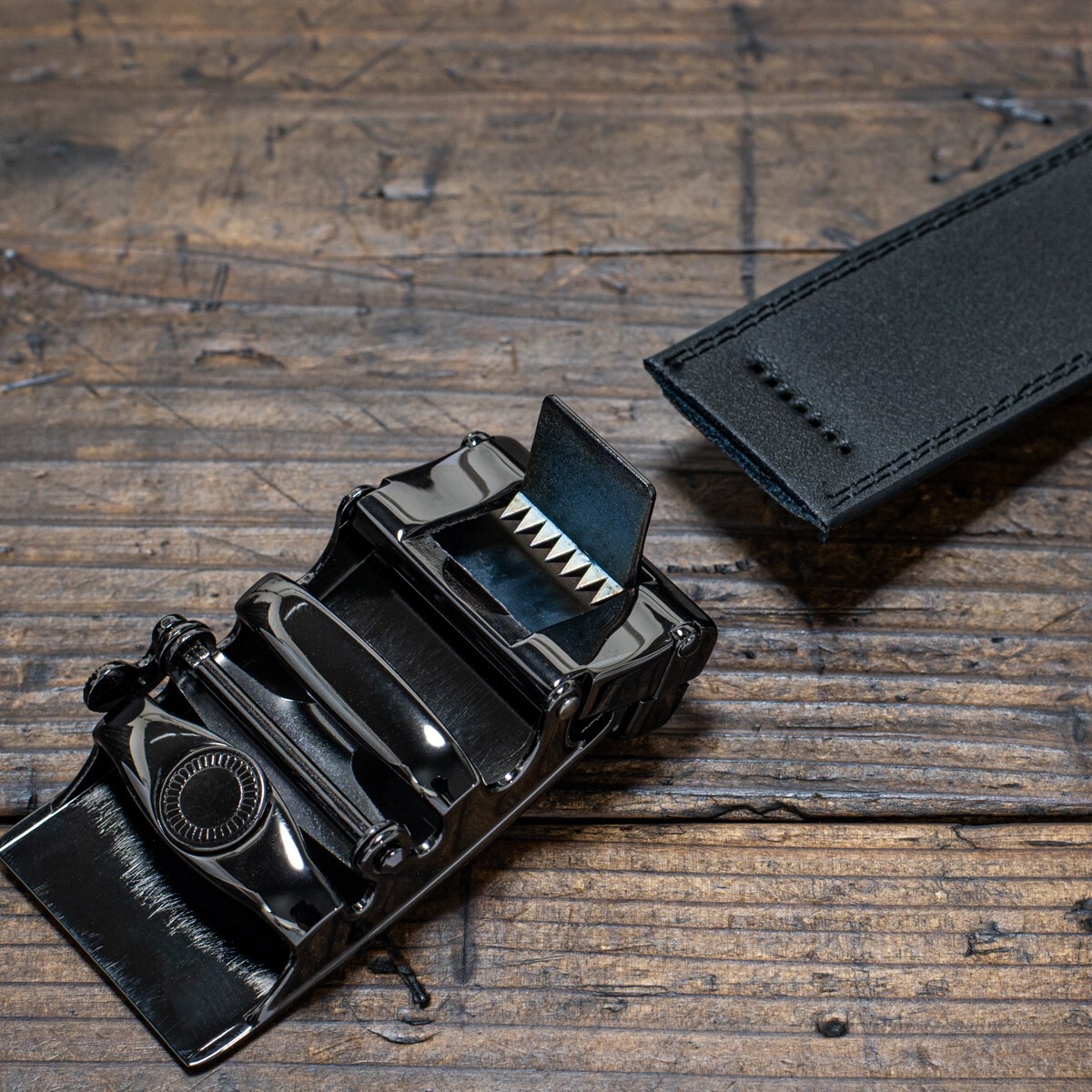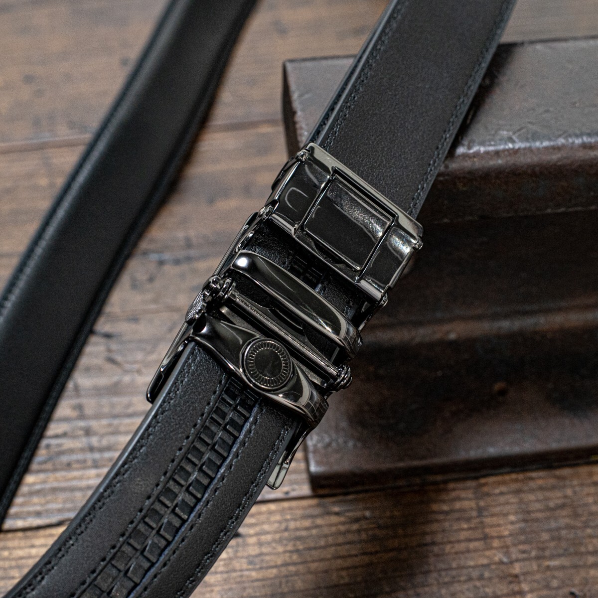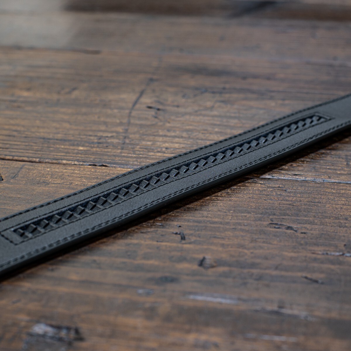 本革を使った無段階調整ベルト(穴なしベルト)です。細かなシボのある革は高級感があり、滑らかな手触りで装着もスムーズです。両サイドをしっかりと縫い付けることで芯材を固定し、強度を高めながら立体感と装飾性も加えています。