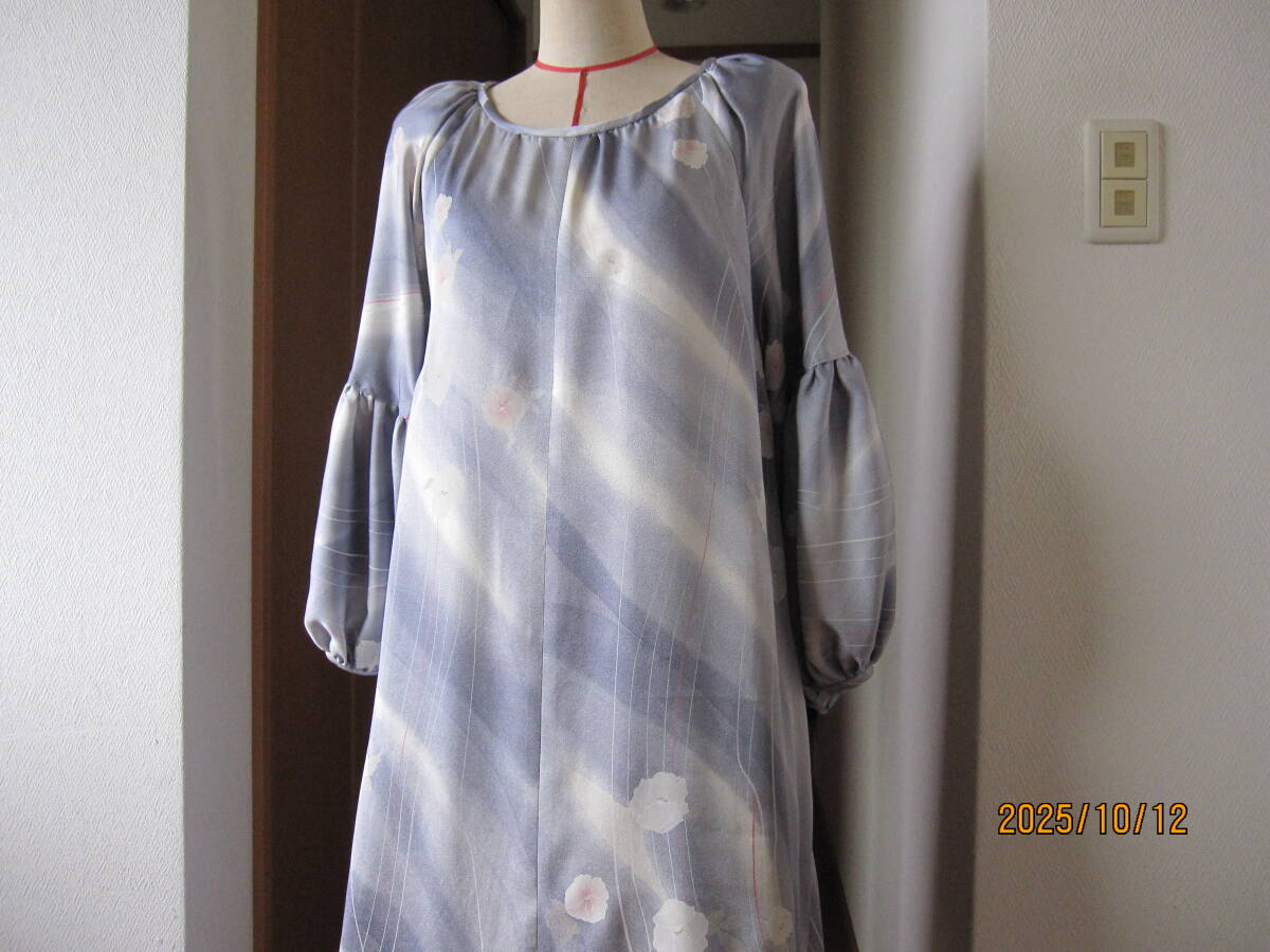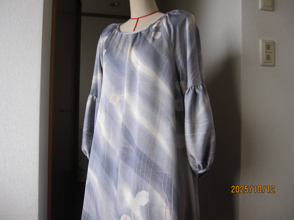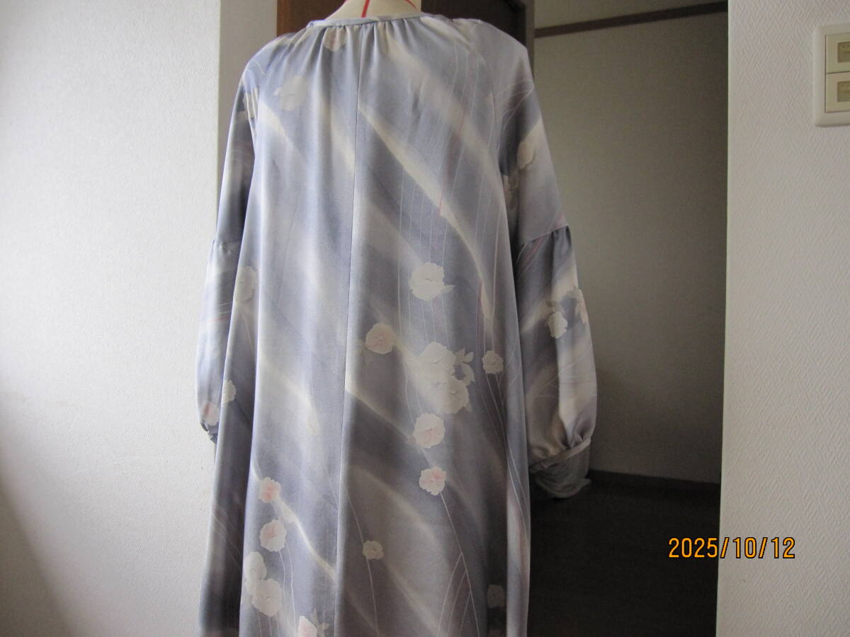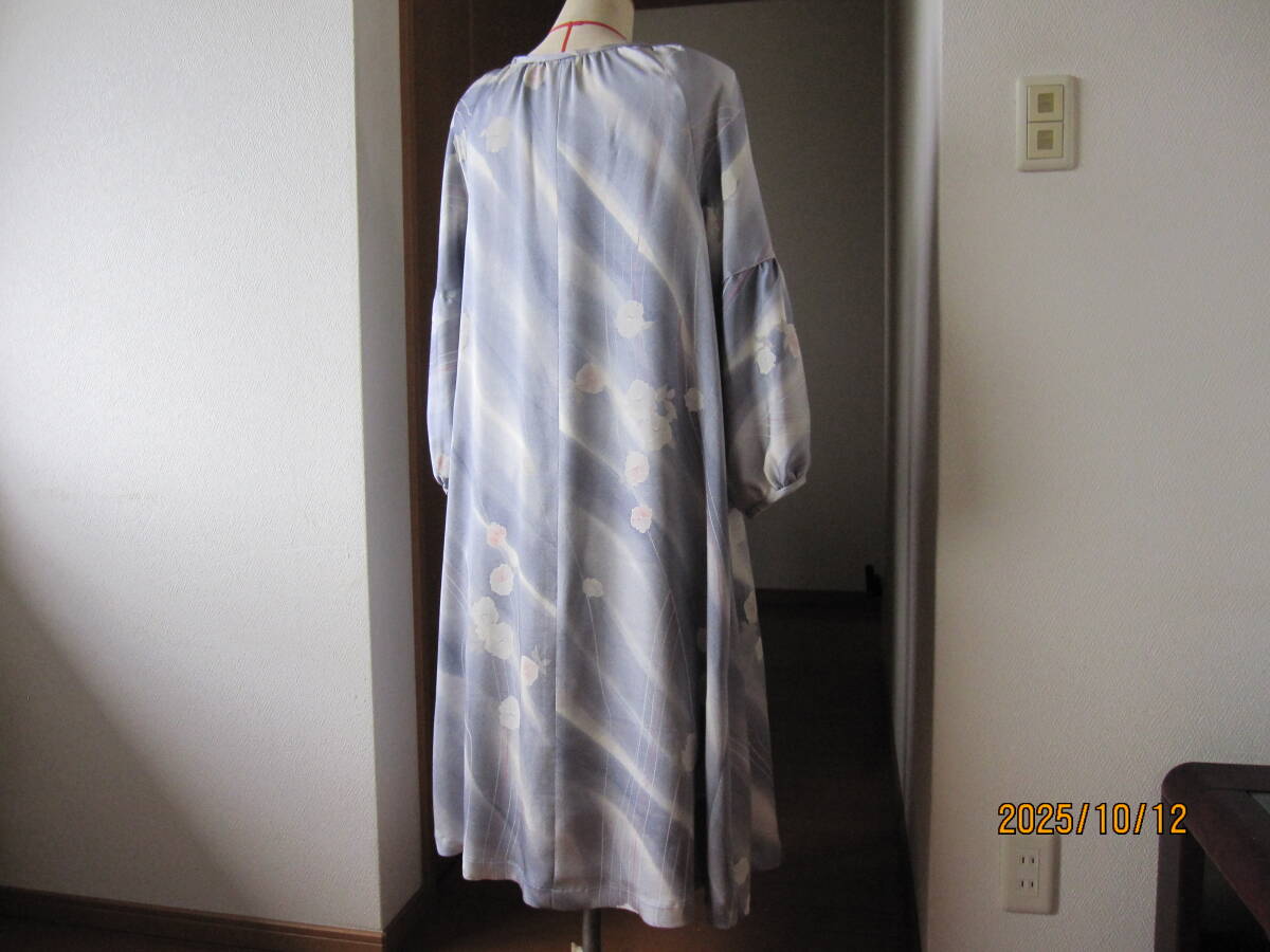 着物リメイク 正絹 グレー地にストライプ 花模様 ゆったりラグランワンピース