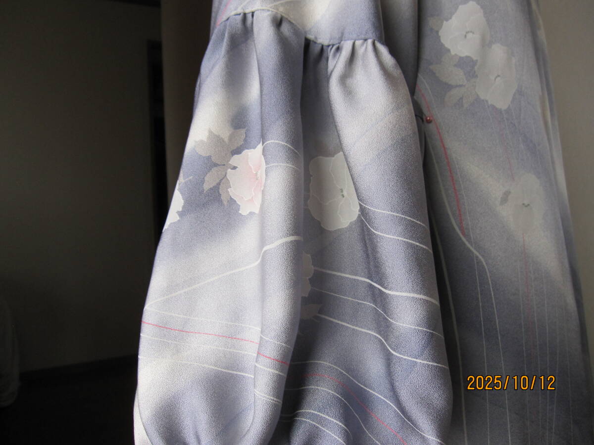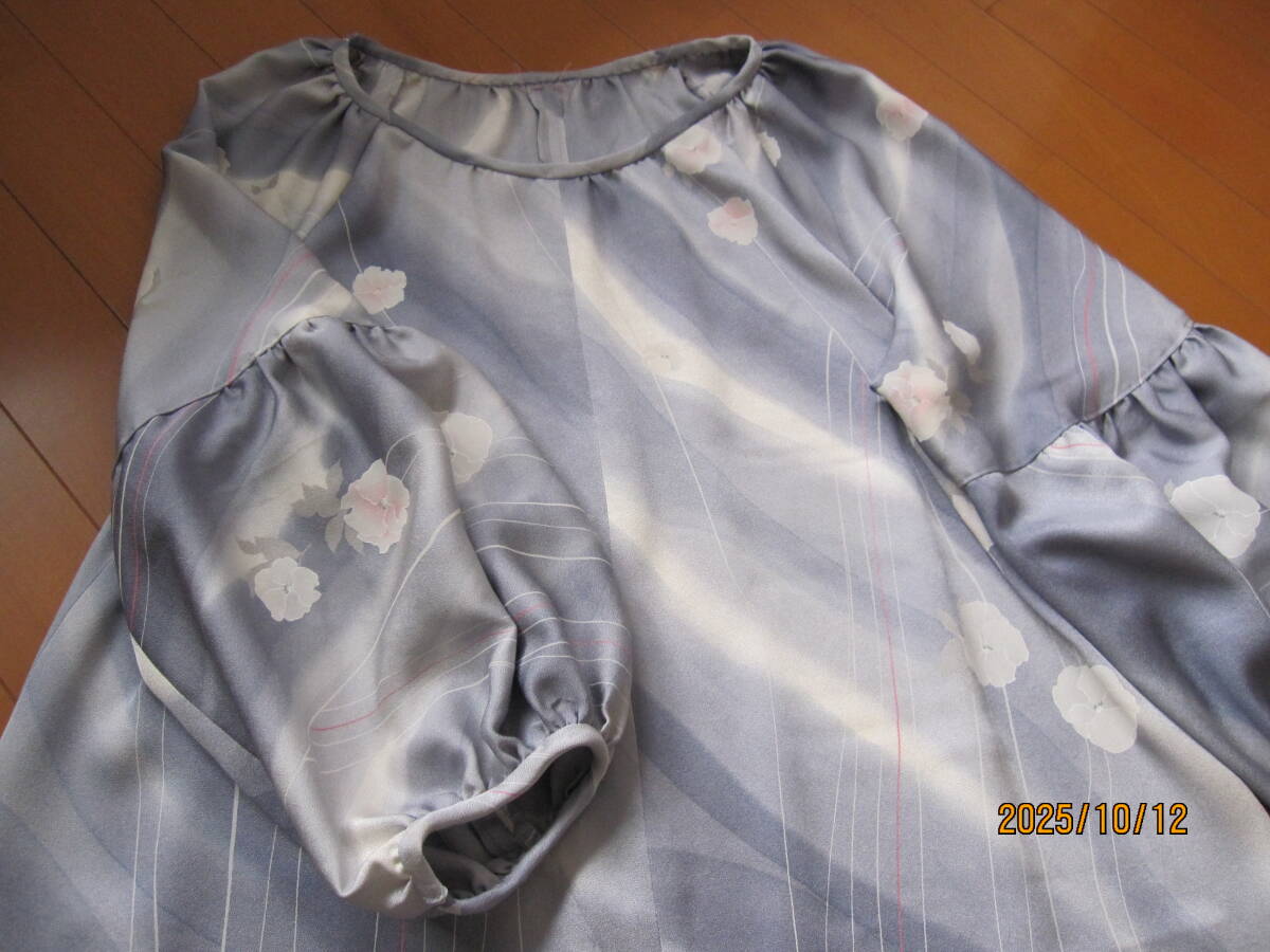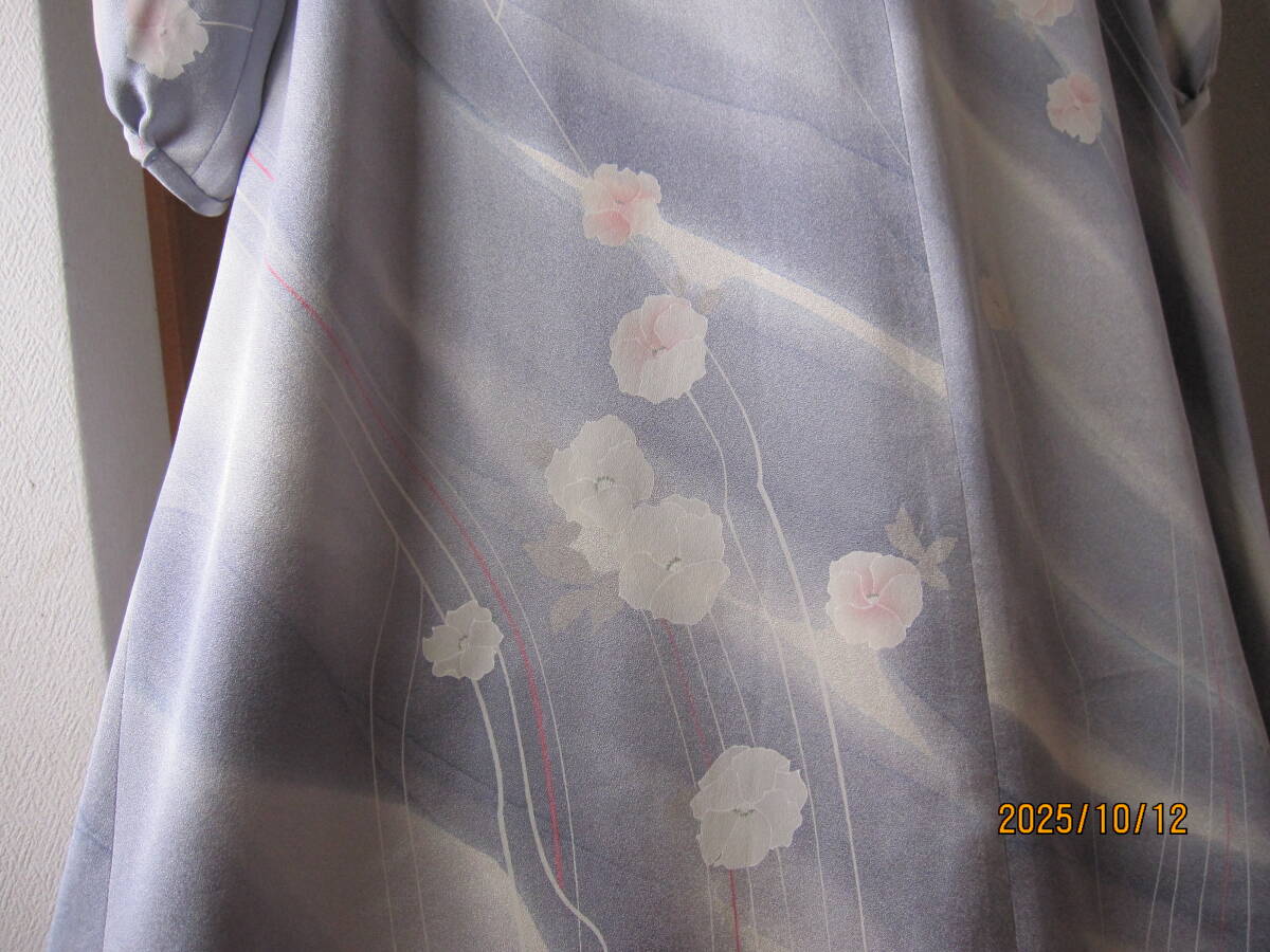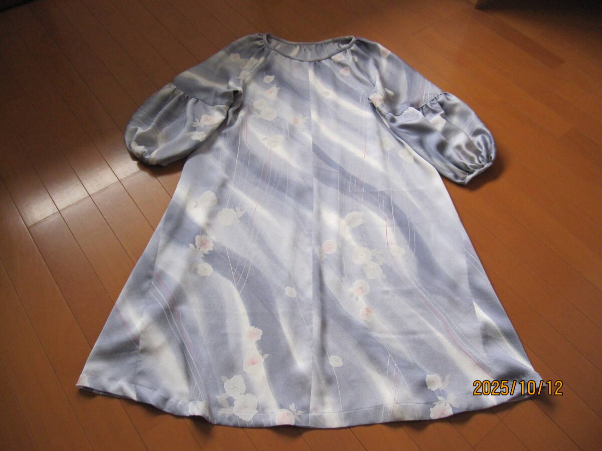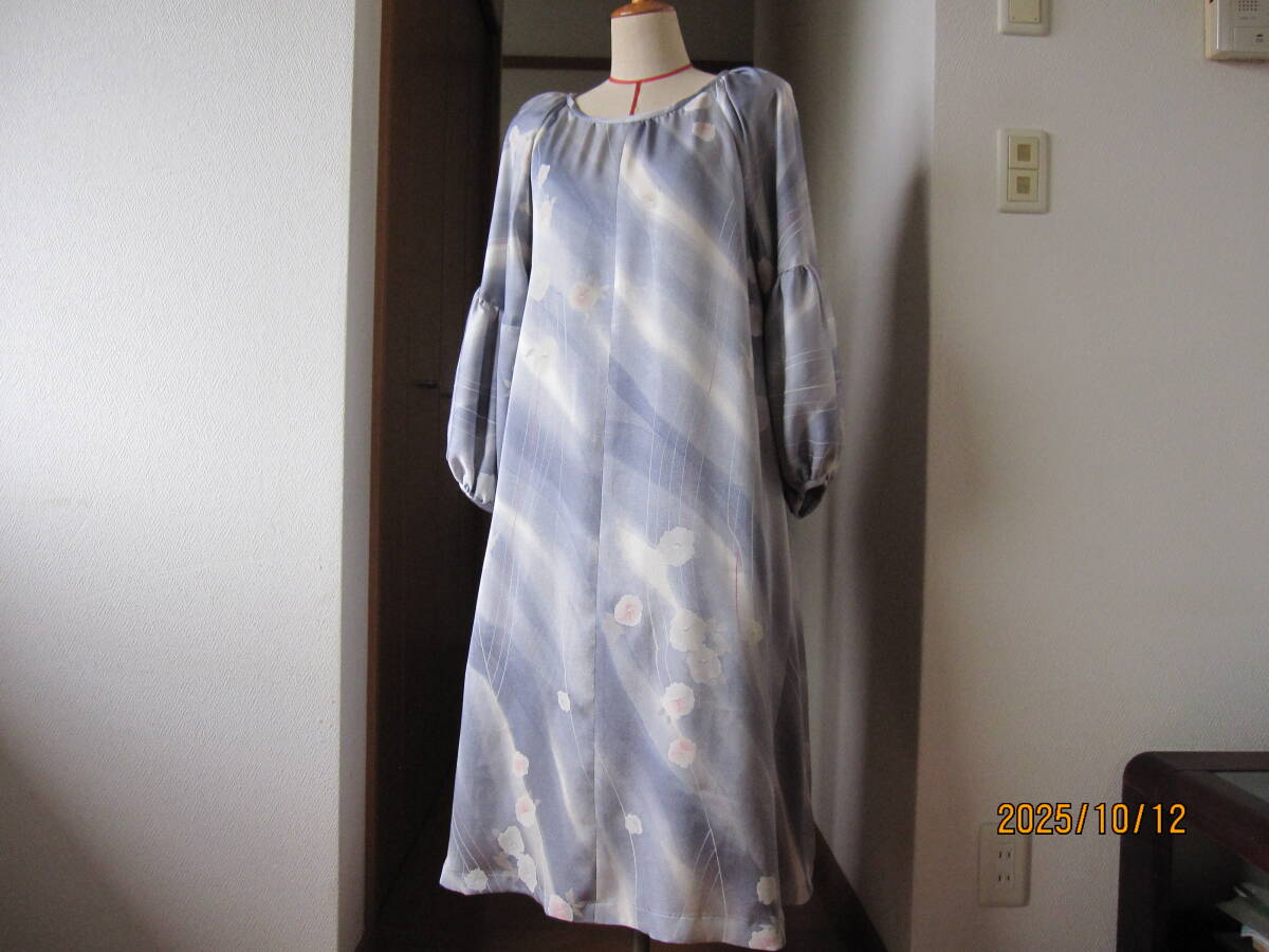 着物リメイク 正絹 グレー地にストライプ 花模様 ゆったりラグランワンピース