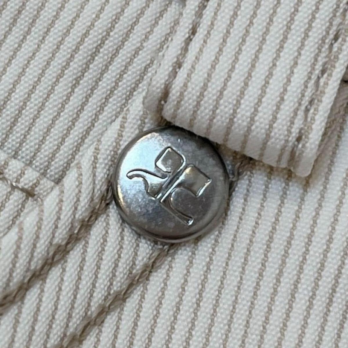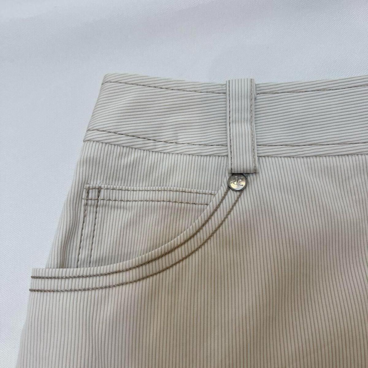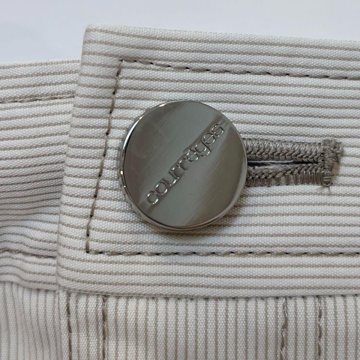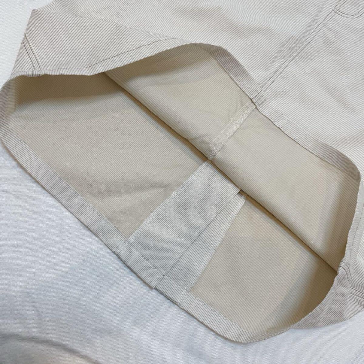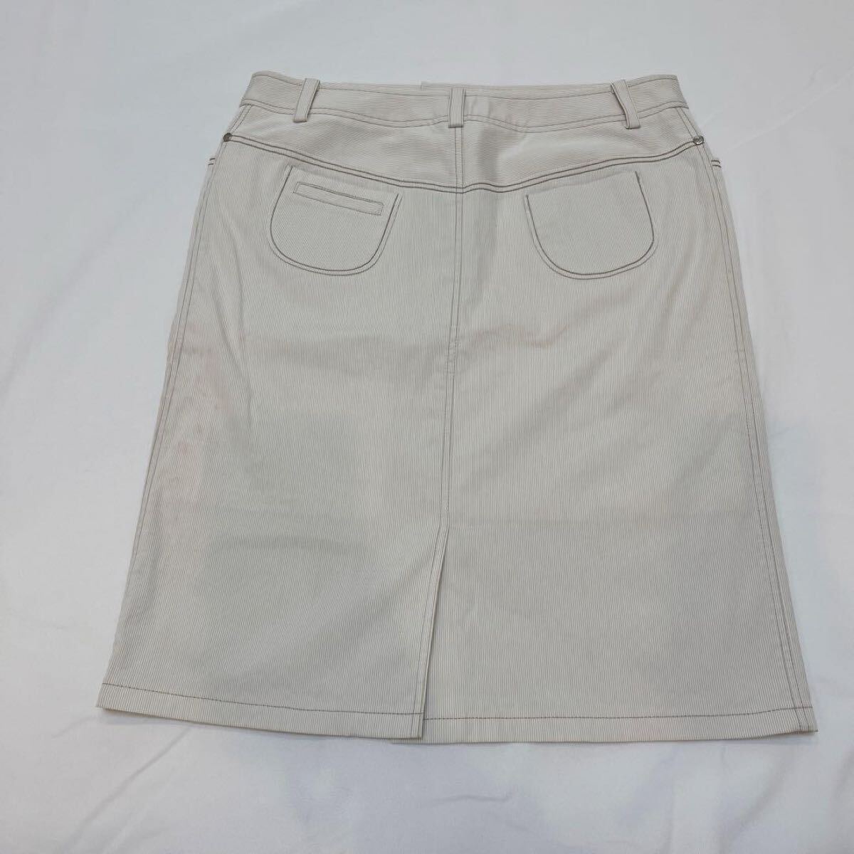 日本製でしっかりとしたコットンベースの生地感に、程よい厚みとハリのある生地感でラインがきれいなスカートです。明るい季節にぴったりなライトベージュのストライプ柄で、カジュアルにもきれいめにも使える万能アイテム!央ボタンとポケットの金具のモチーフには、クレージュのロゴ入り◎