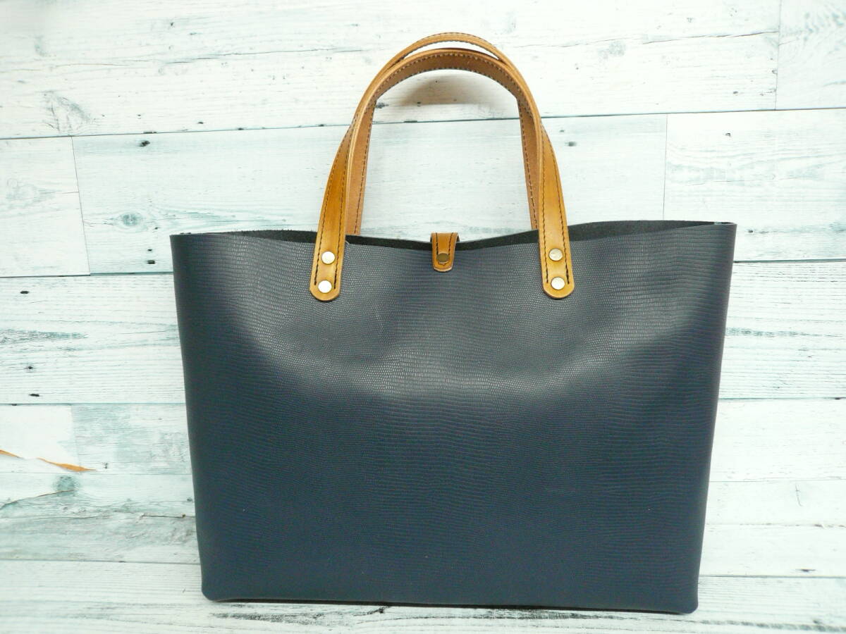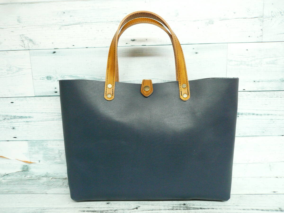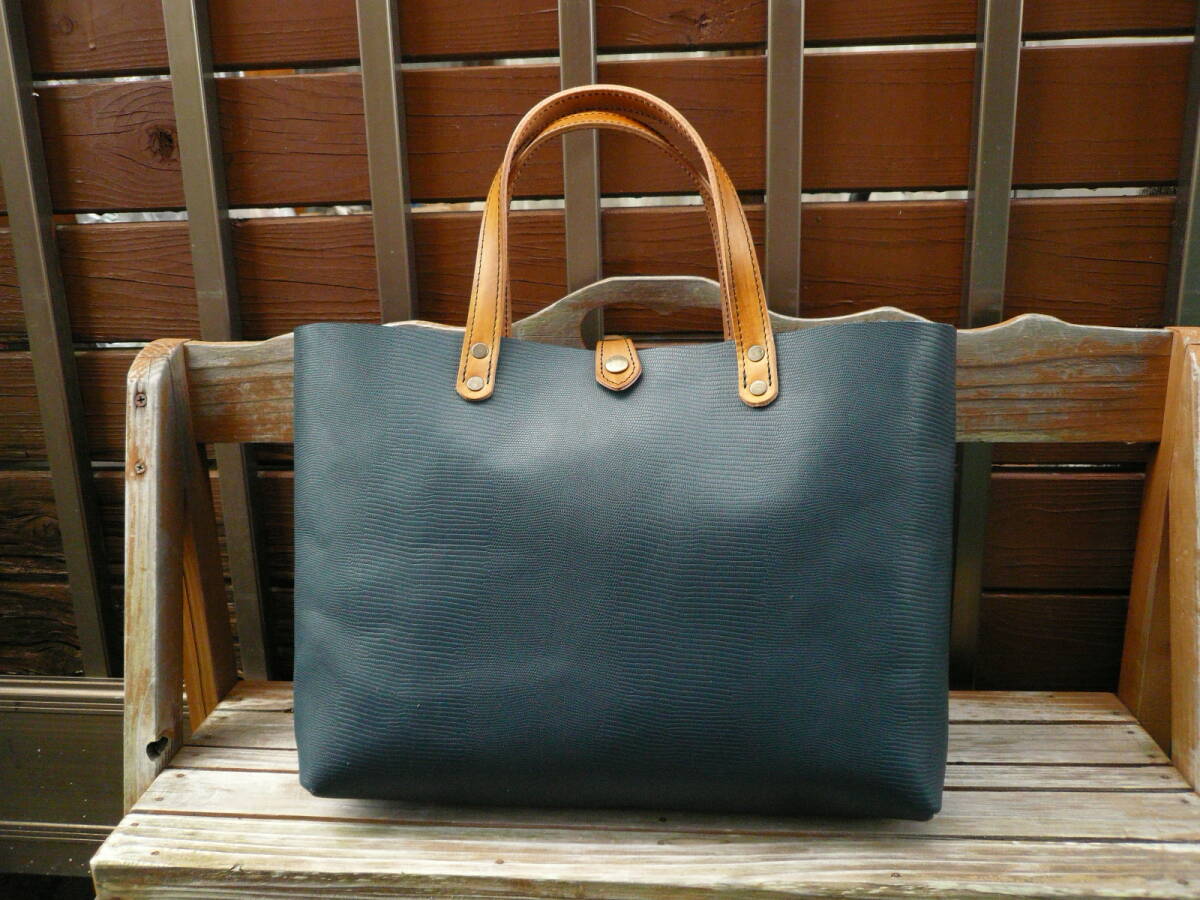 贅沢厚め硬めシュリンクネイビーブルー系 トートバッグ ハンドバッグ牛革 持ち手留め部分ヌメ革 ハンドメイド作家手作り日本製鞄 478