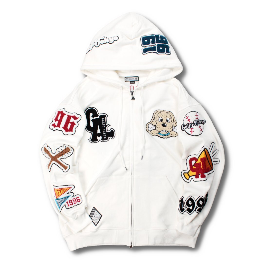 | 【商品名】 | GALFY スウェット パーカー 153024 サガラ刺繍 復活わんわん大学 フルジップパーカー 裏毛素材 カレッジ ストリート B系 犬 ロゴ ホワイト |