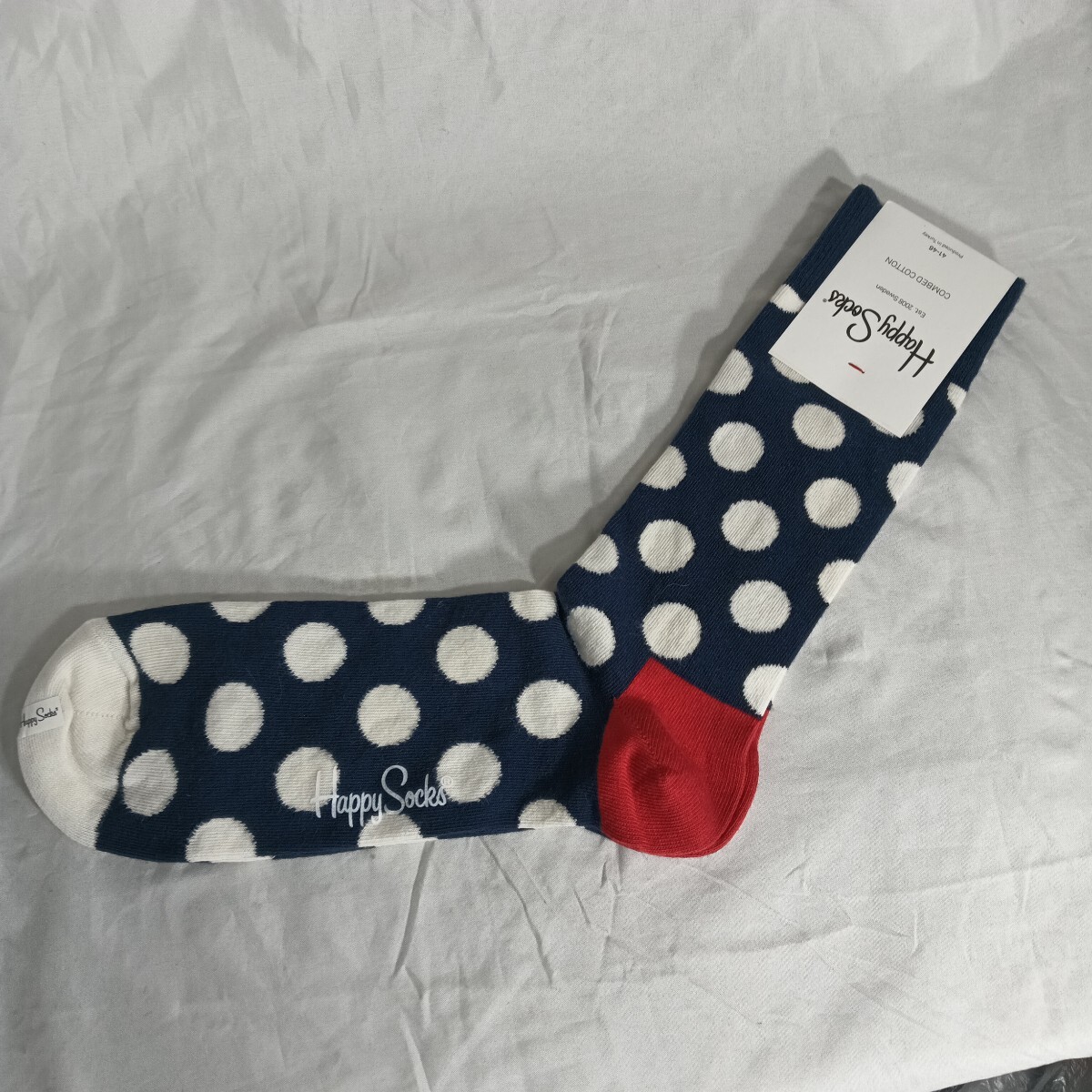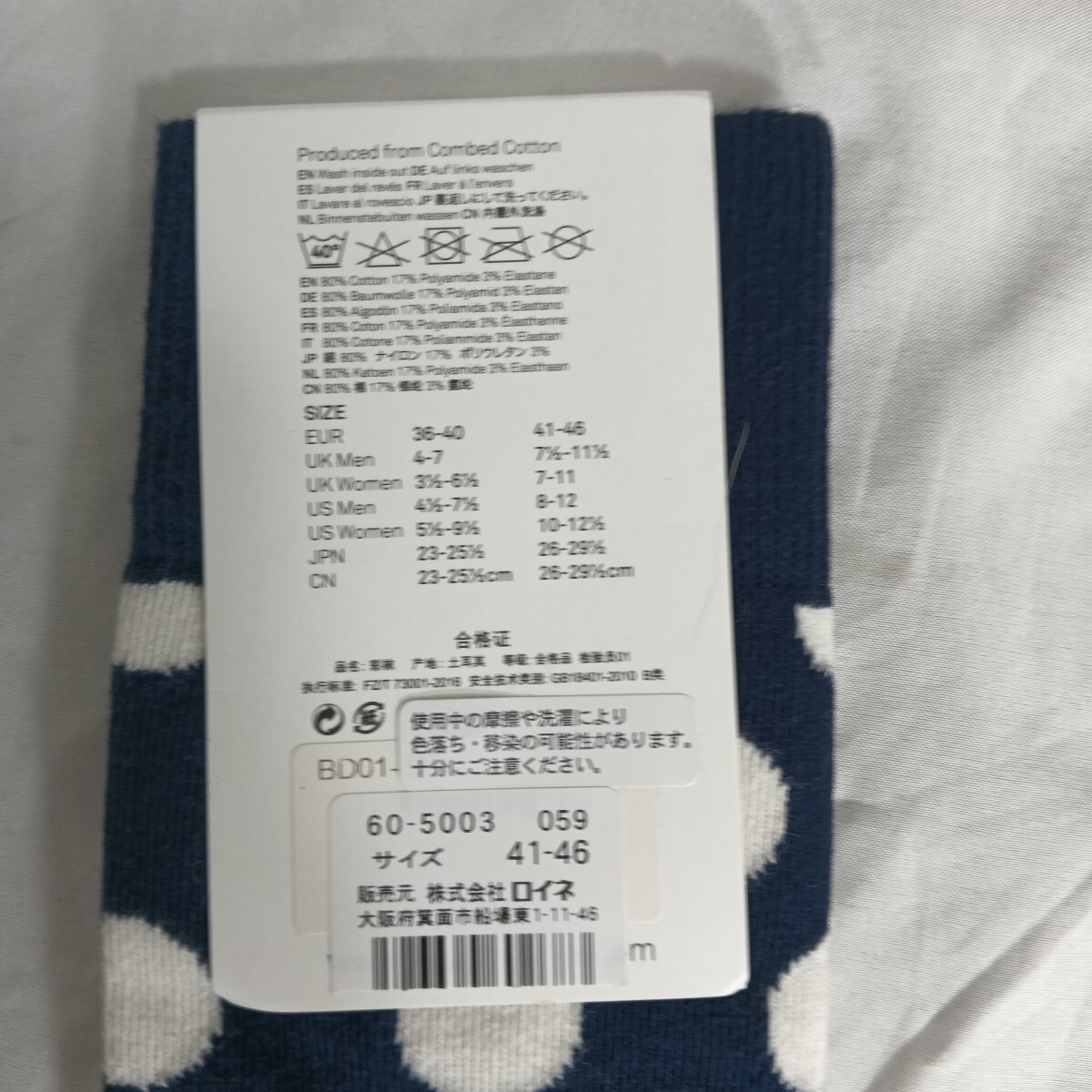 ハッピーソックス(ロイネ)の靴下です。サイズは41〜46で、26〜29.5センチです。水玉模様です。未使用ですが自宅保管品です。
