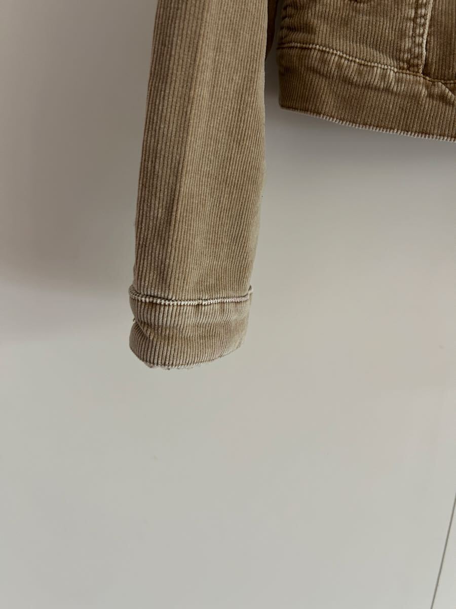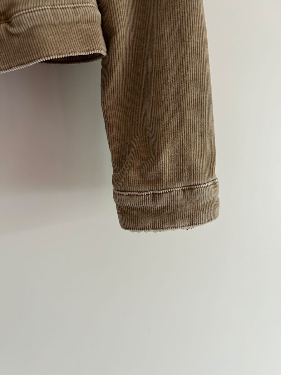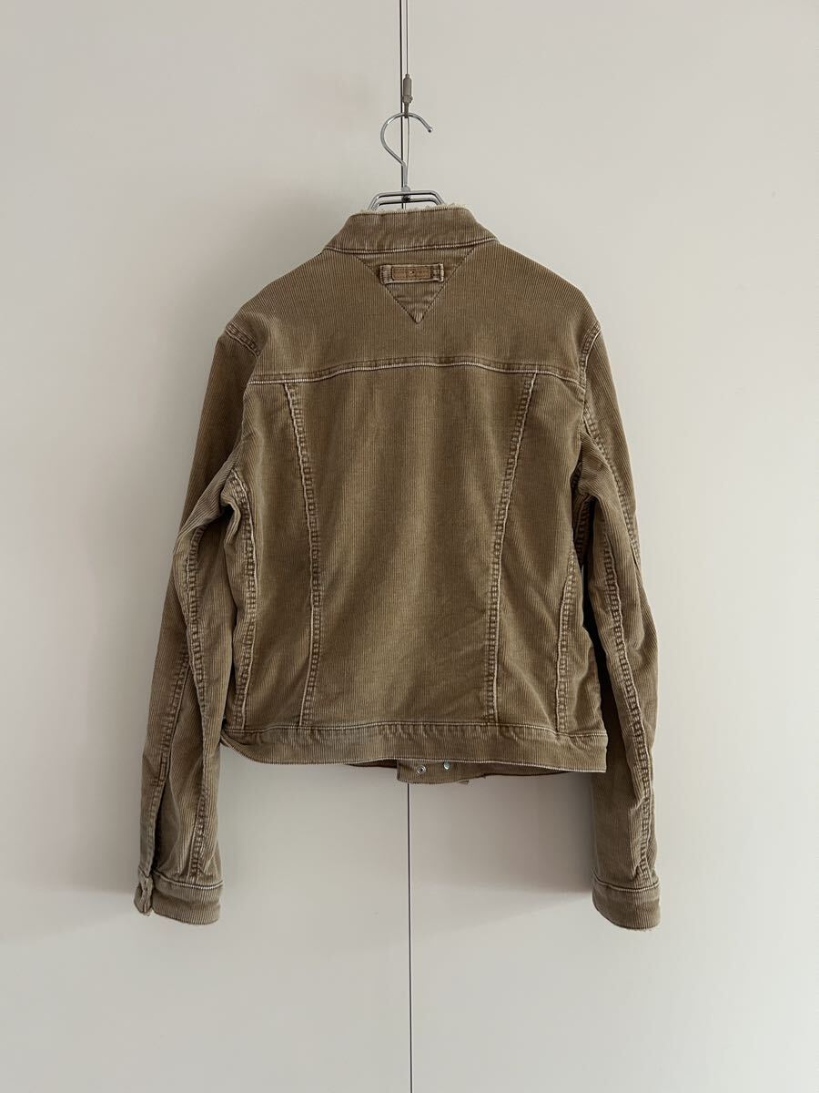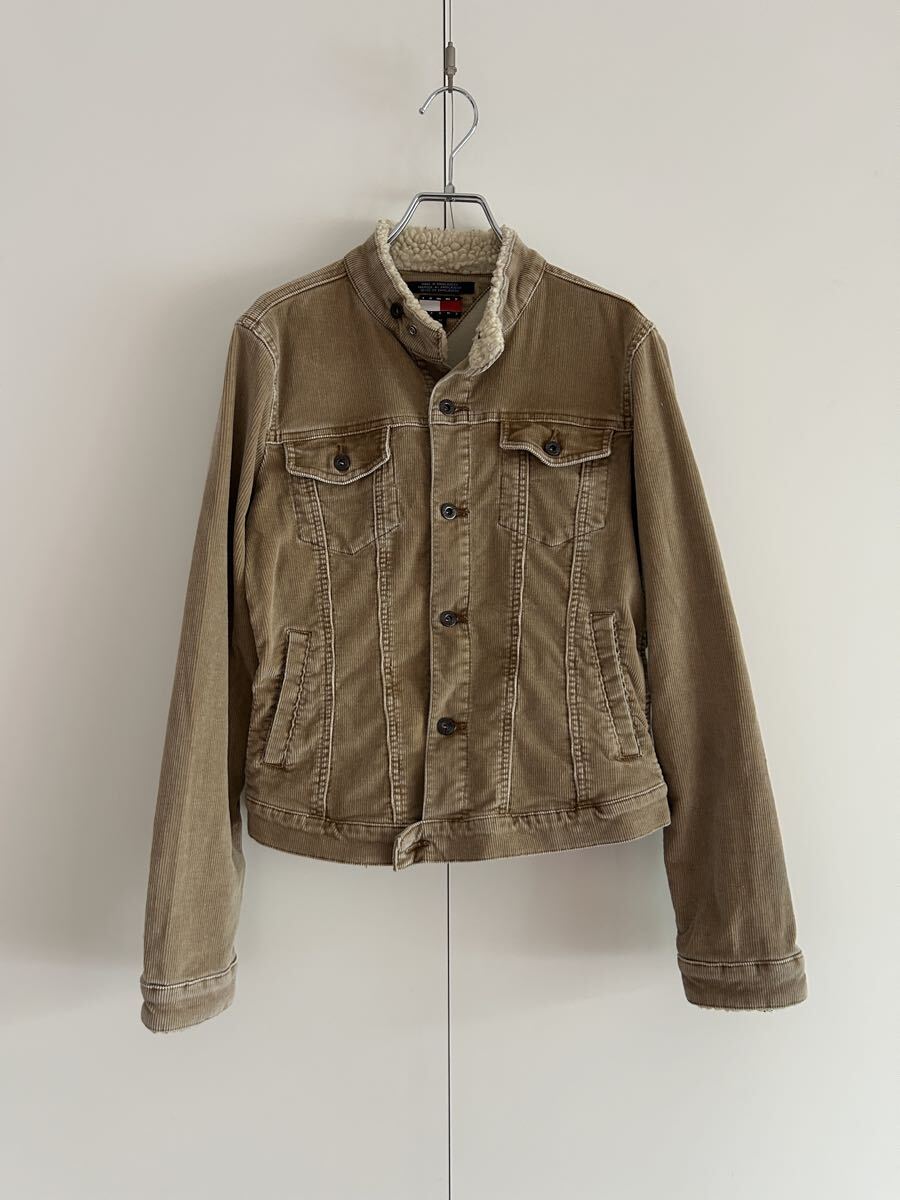 クラシックなトラッカースタイルをベースに、太畝コーデュロイで仕立てられたトミージーンズのジャケット。中綿入りのキルティングライナー仕様で、見た目以上に保温性の高い一着。ベージュトーンで統一された落ち着いた雰囲気が魅力です。