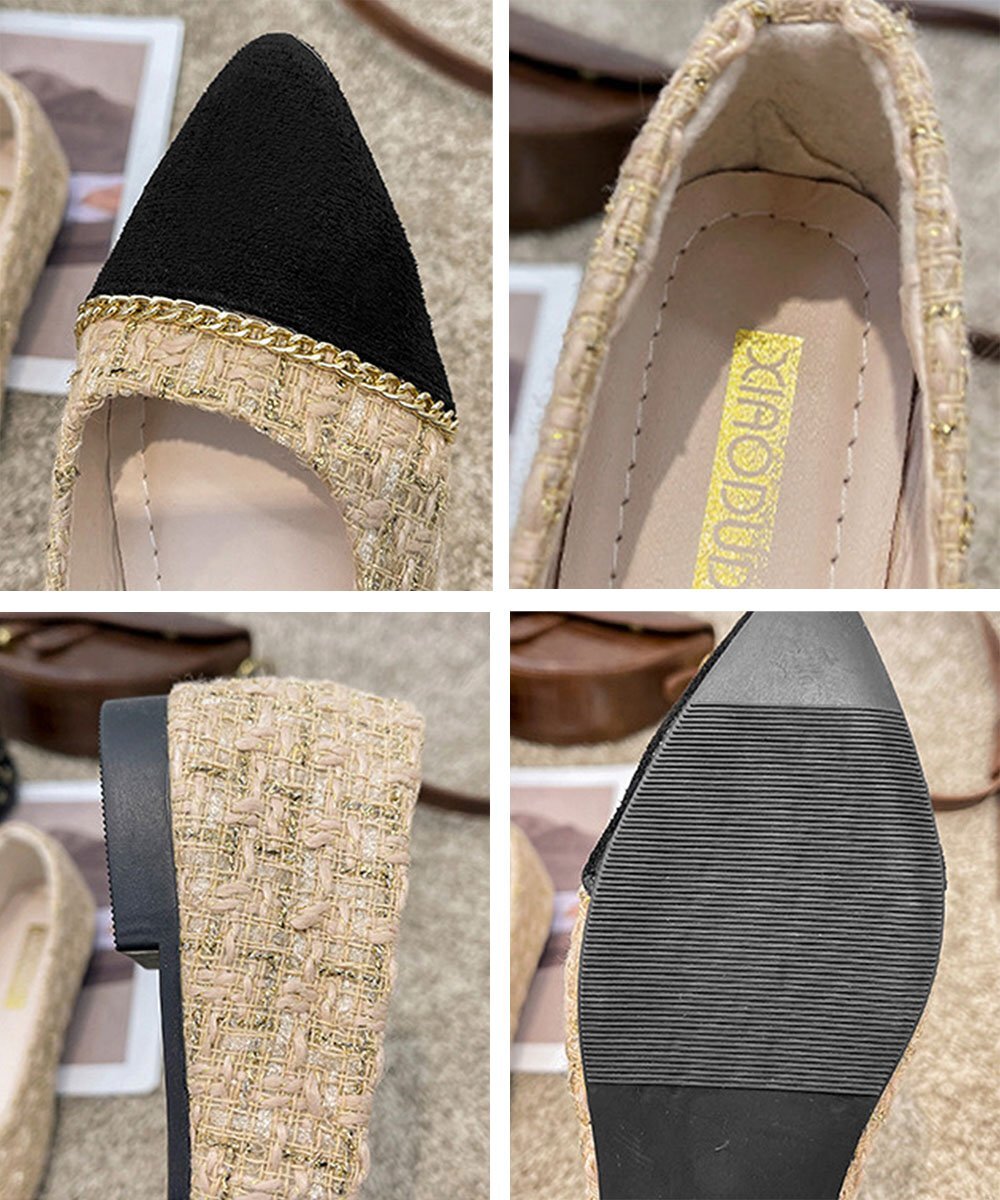 スエード生地とツイード風生地に合金チェーン、上品でお洒落な異素材mixパンプス