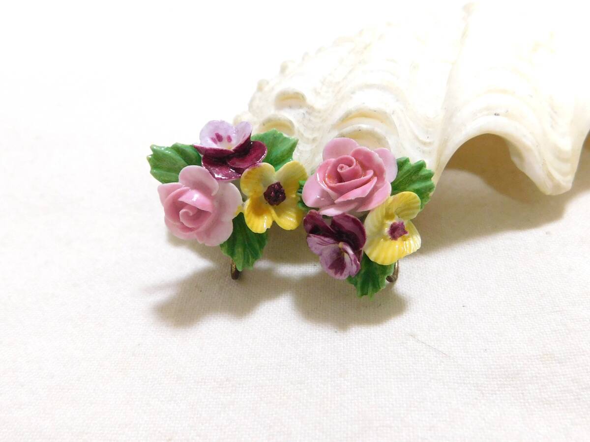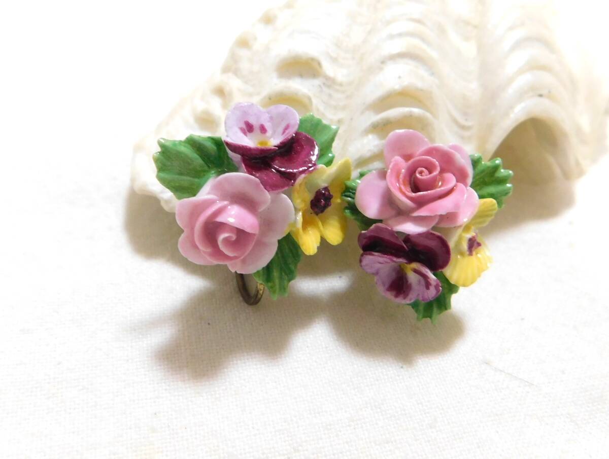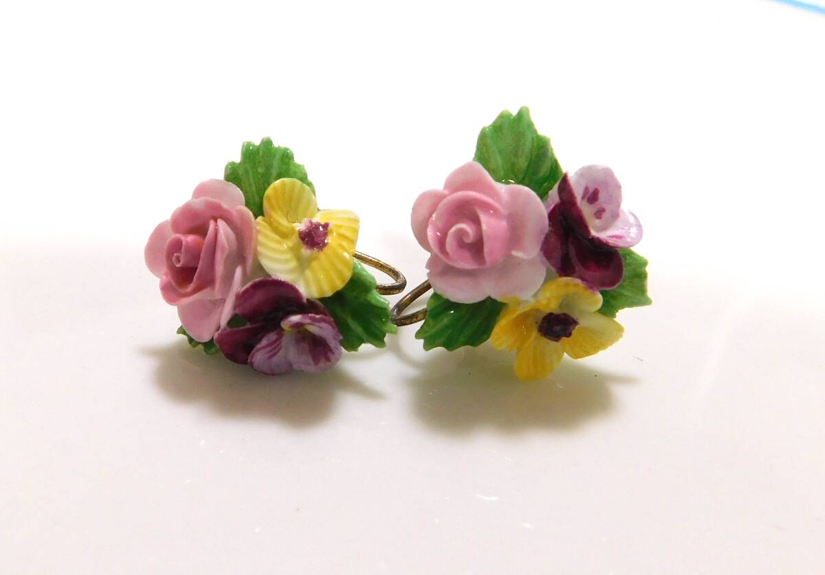 バラ、スミレ、アネモネ、小さな陶器製のお花が飾られた古いイギリス製のかわいらしイヤリングです。
