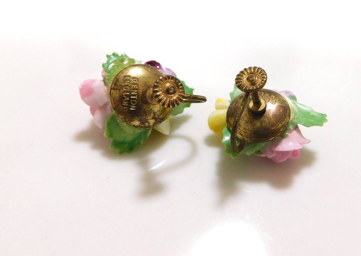 ヴィンテージ DENTON ENGLAND刻印 古い英国製 陶器製のお花のイヤリング スミレ バラ アネモネ ビンテージ イギリス製