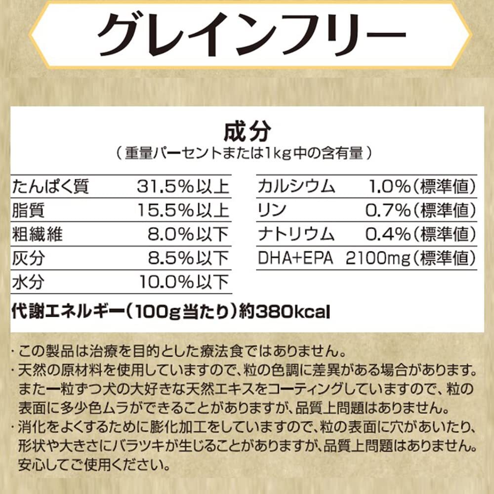 商品紹介 穀類を含まず、動物性たんぱく質を第一原材料に設計。愛犬の栄養バランスに徹底的にこだわる国産のグレインフリーフード 原材料・成分 たんぱく質31.5%以上 脂質15.5%以上 粗繊維8.0%以下 灰分8.5%以下 水分10.0%以下