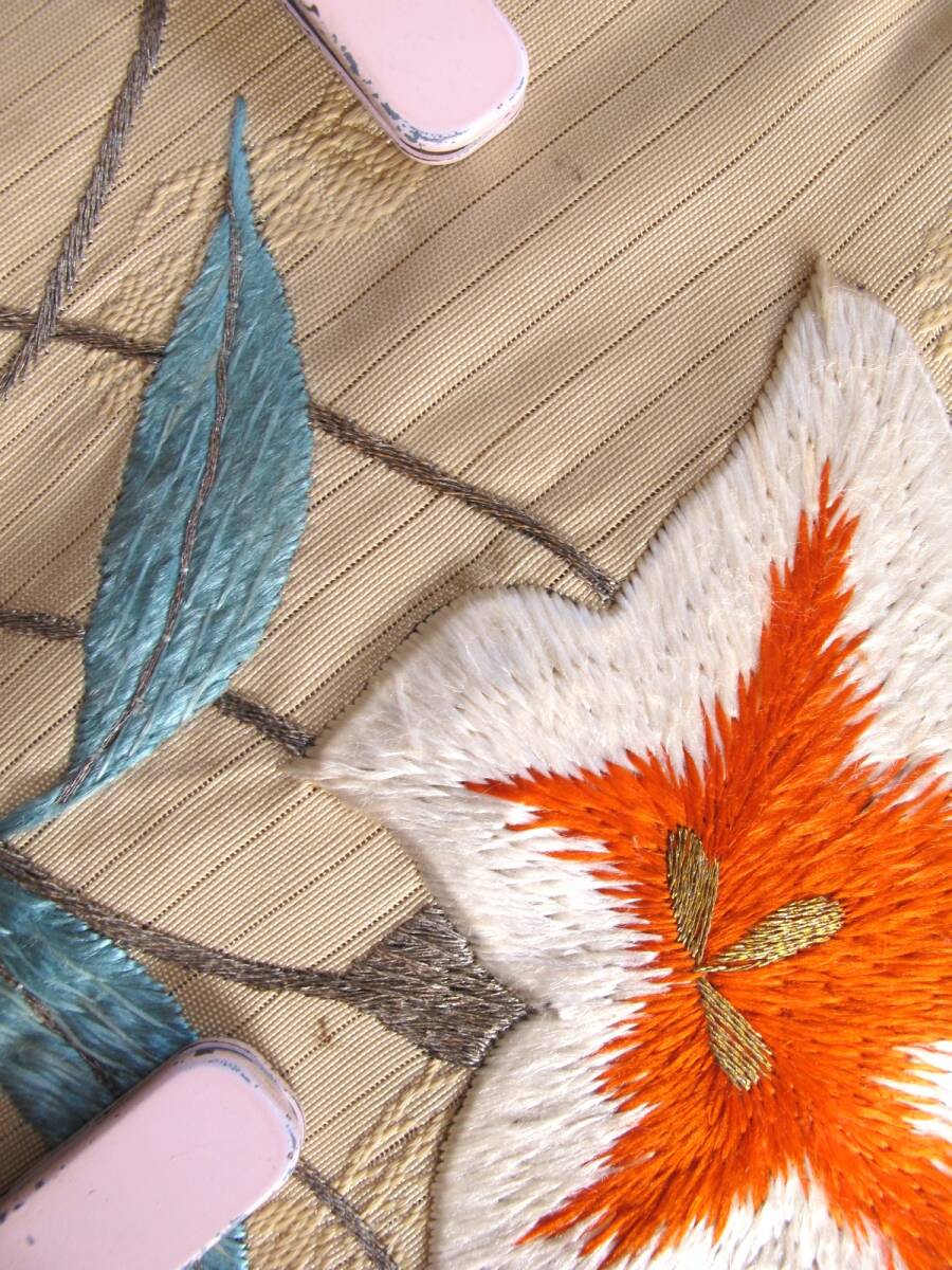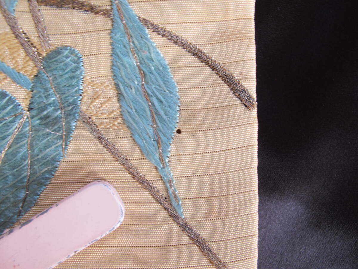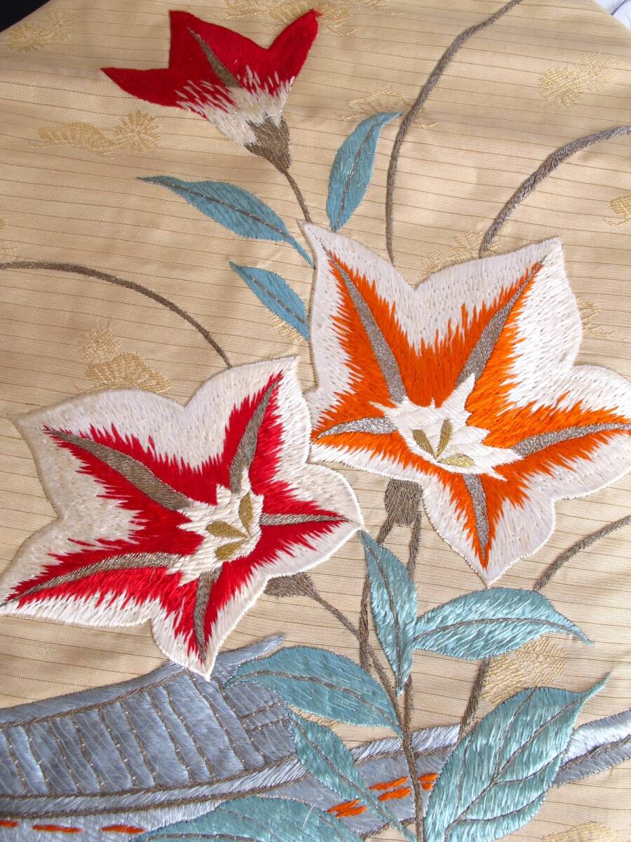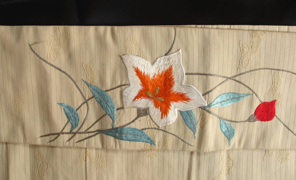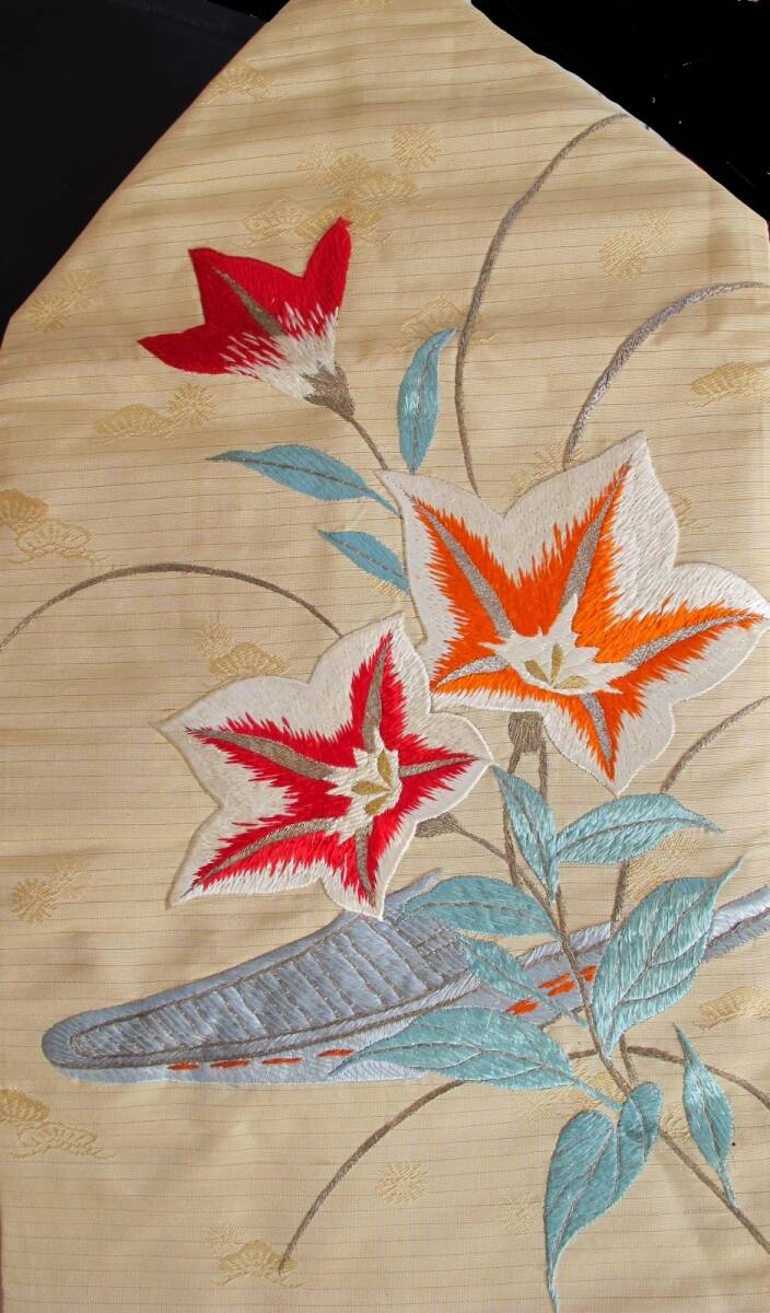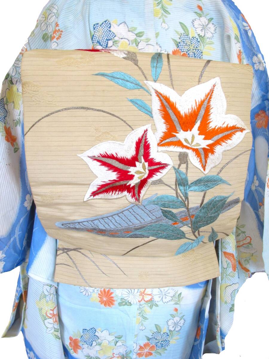 桔梗の花の小舟が風情ある、アンティーク絽の総刺繍名古屋帯です。 地紋入りです。 |