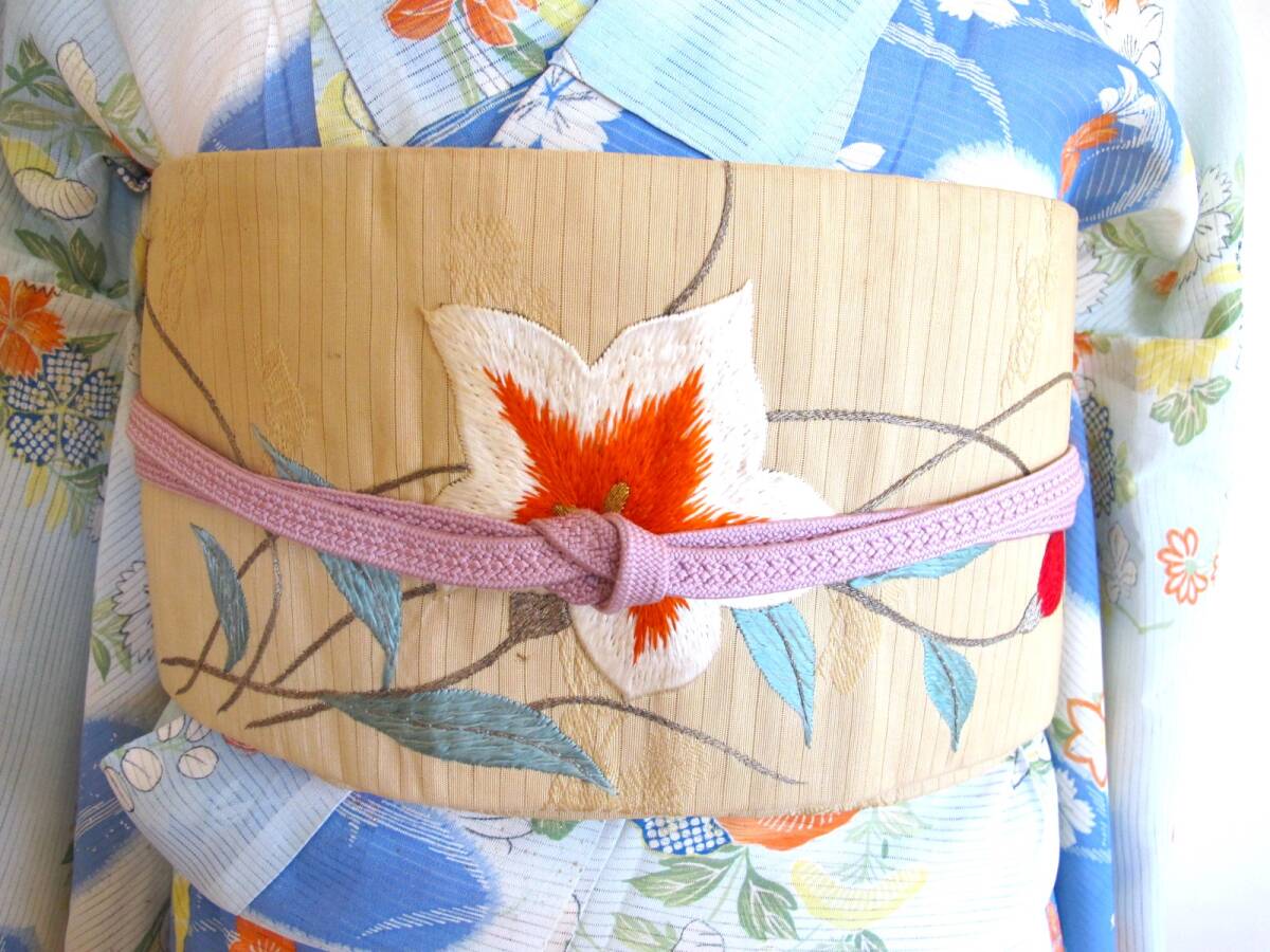 おおよその丈:幅30.3×332.5(たれ100.5+胴332 )cm 素材:正絹 お色:薄黄 |