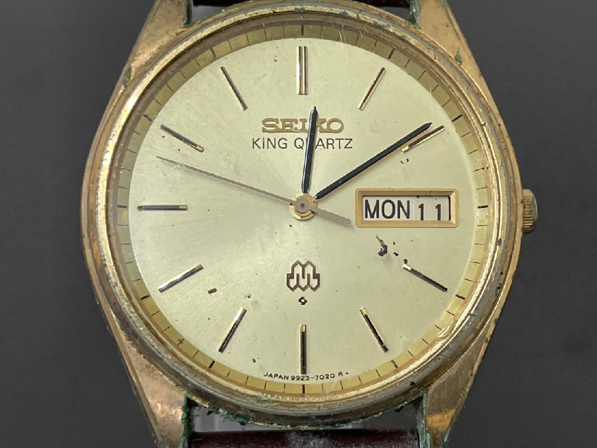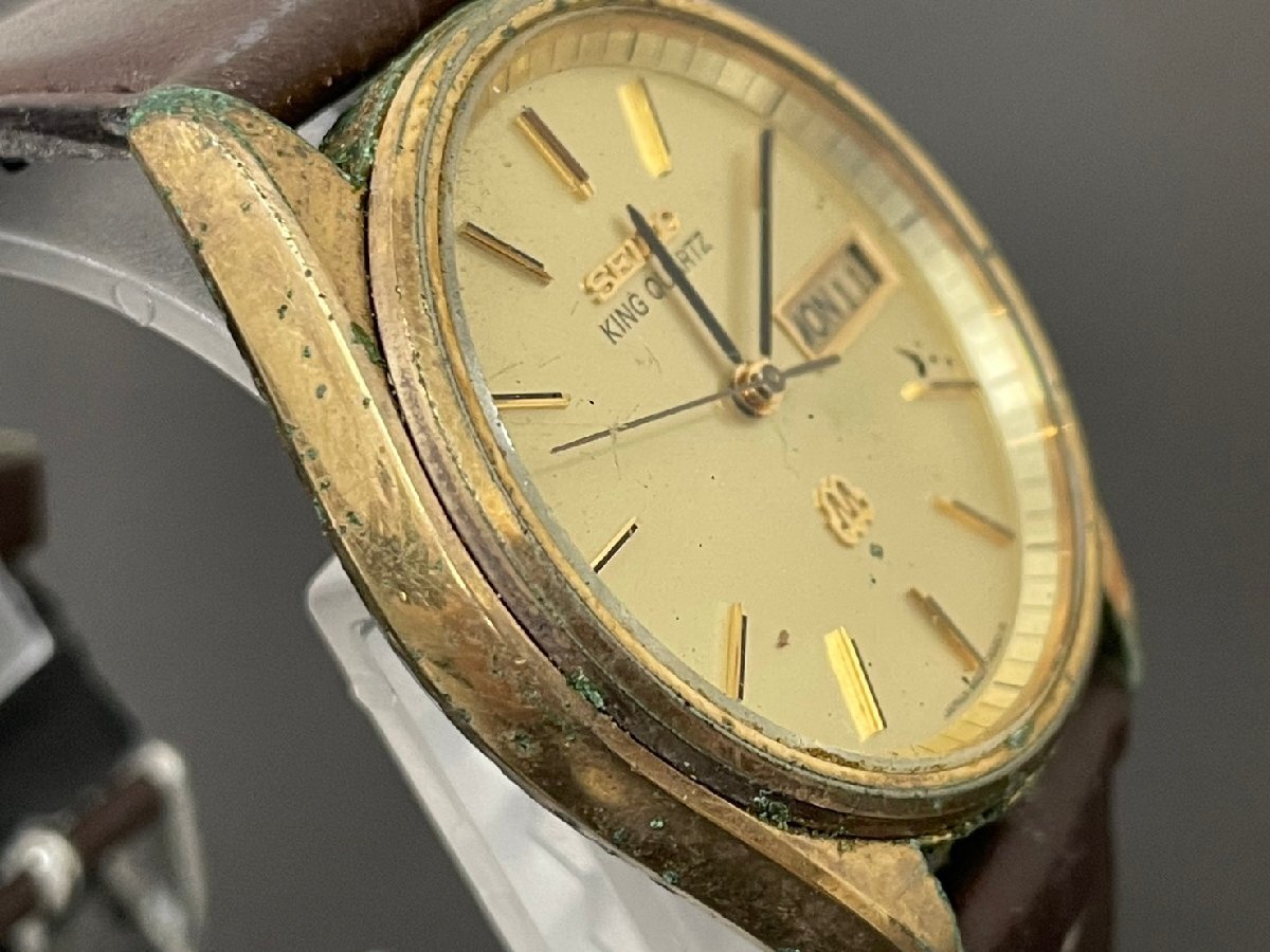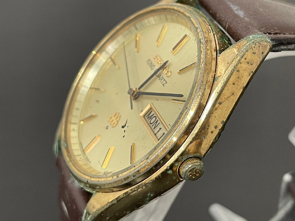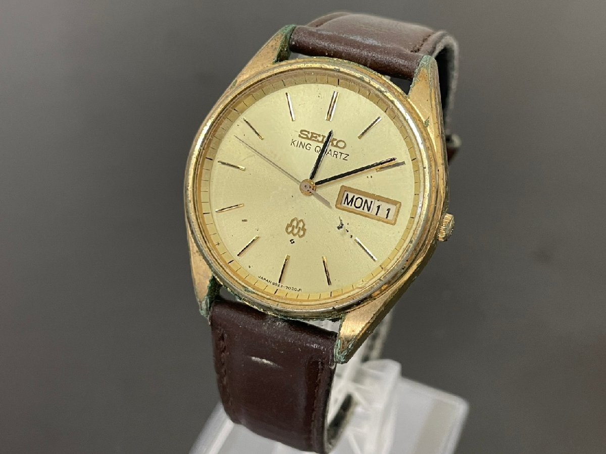 S111●SEIKO KING セイコーキング クォーツ ラウンド 腕時計 メンズ デイデイト ゴールド 9923-7028 茶ベルト●