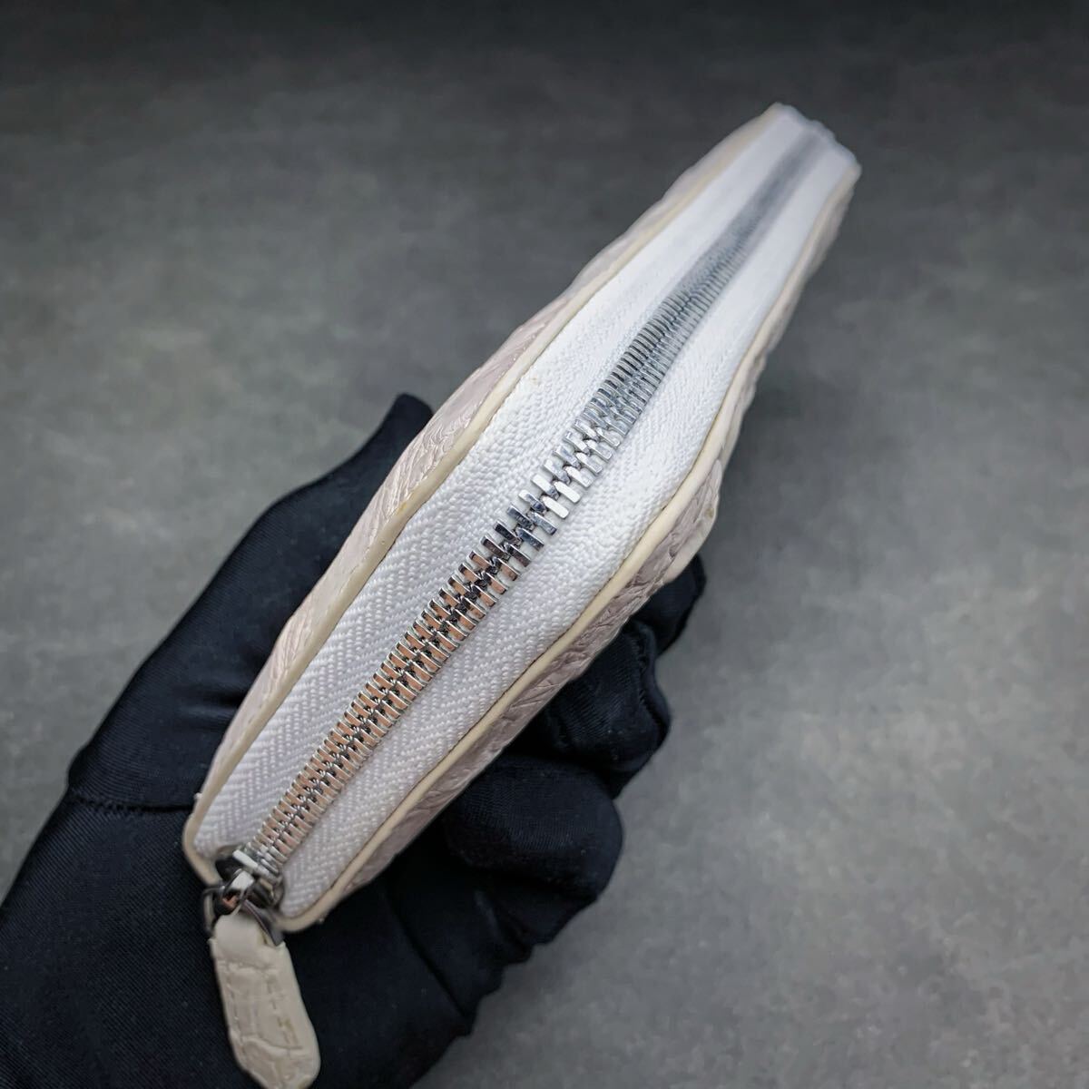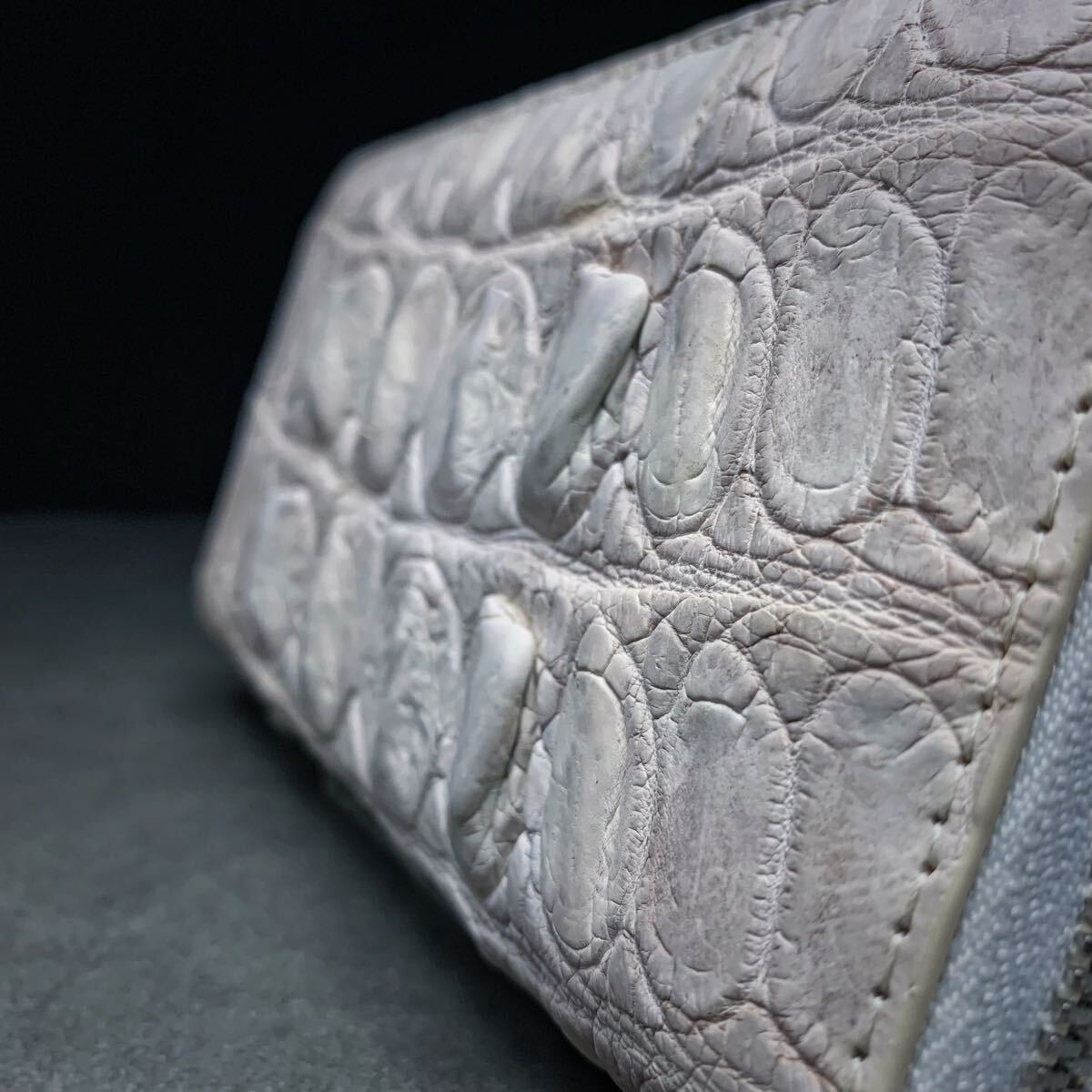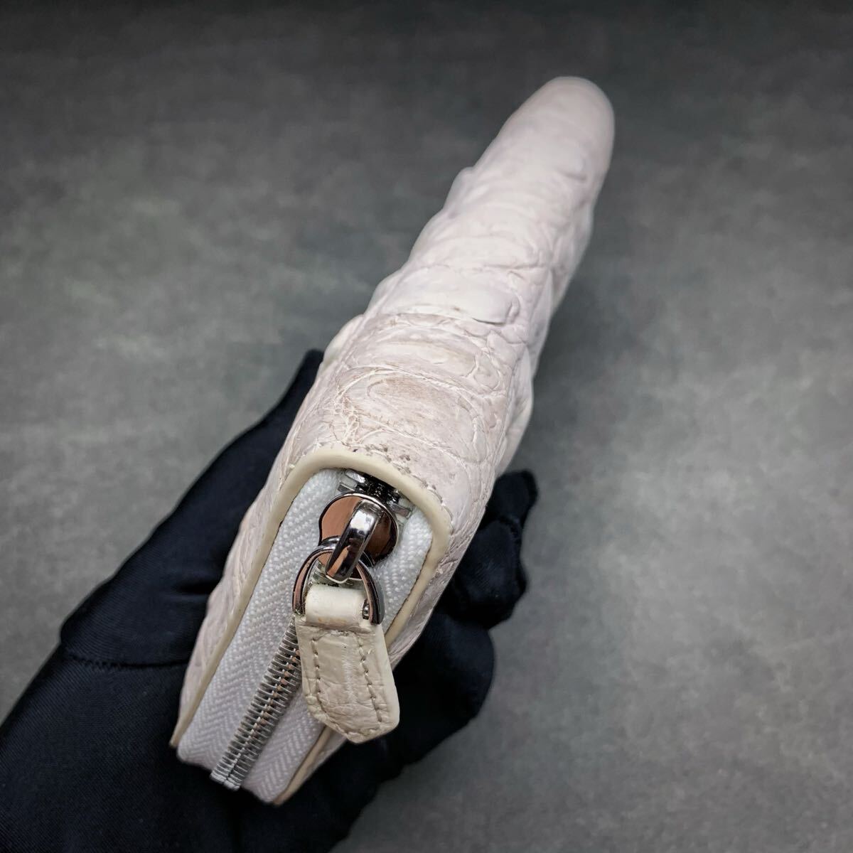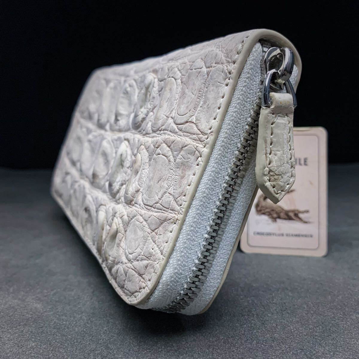 クロコダイルと呼ばれている品種のワニ革は人気が高く、独特の模様と凹凸が魅力で、高級ブランド品を中心にクロコダイルが多く使われています。今回はワニ革の代表格である<シャムクロコダイル>の背革部のラウンドファスナー財布を出品します。