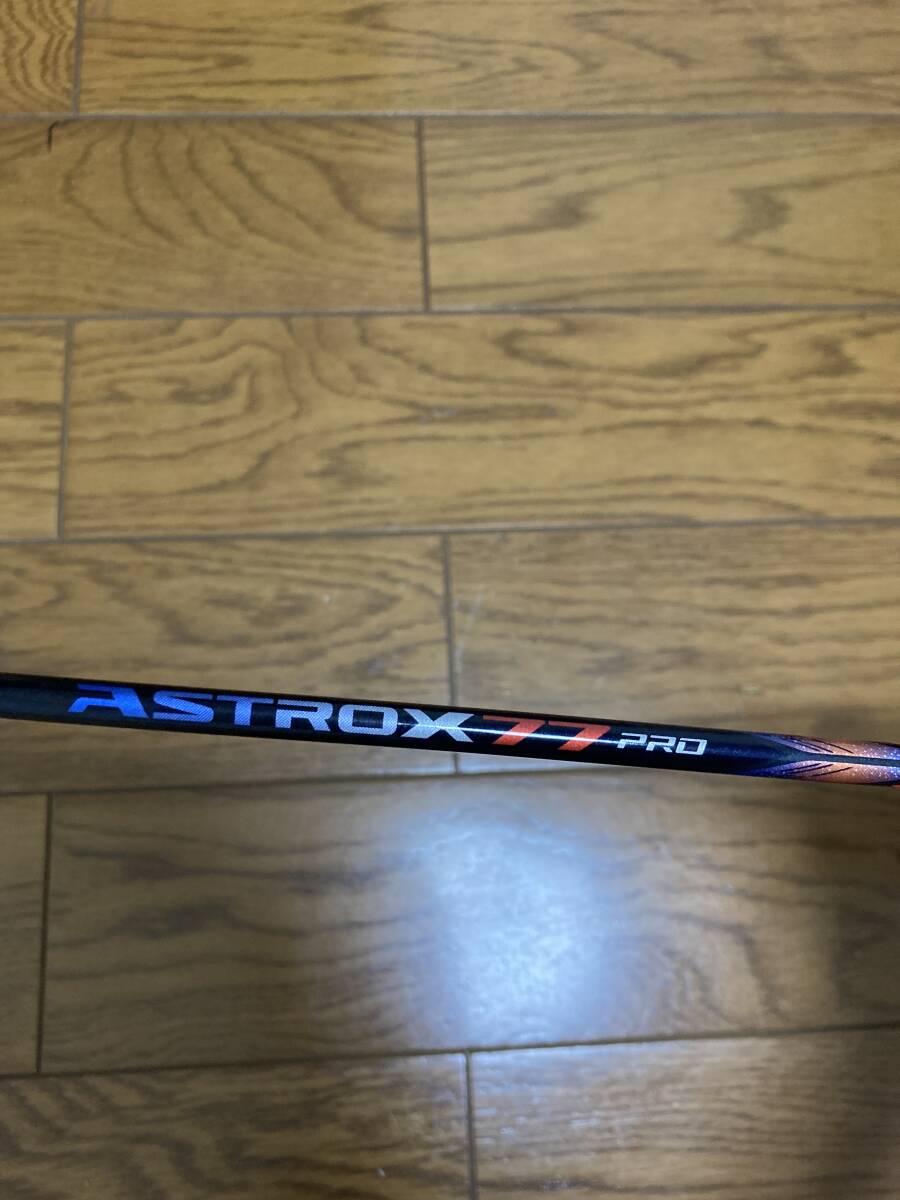 アストロクス77Proの4UG5です。元グリップは剥がしてあります。塗装剥がれはないものの、擦れ等で文字が少々、かすれている所はあるものの状態は良好だと思います。予めご了承ください。ガットは24で張ってますがおまけ程度に考えてください。ソフトケースもおまけで付けます。