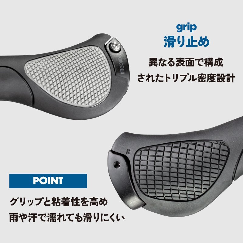 人間工学に基づいた設計により、握りやすく疲れにくいデザインのエルゴグリップ。 手の平にしっかりとフィットしてしっくりくる握り心地。 グリップ表面の凸凹が滑り止めになり汗や雨に濡れてもグリップ力を向上させます。 手首の疲れや、腱鞘炎で悩んでいる方におすすめです。 掌の広さから親指まで心地よく握られ、体の重みが手の平にうまく分散し、痛みと疲れを大幅低減。 クロスバイクやマウンテンバイク・ミニベロなどフラットハンドルの自転車に最適。 [エルゴデザイン] 長時間のライディングに向いているエルゴ形状は、手首や掌の疲れの軽減と高いフィット感が期待できます。 手の平に接する面積が大きい形になっているので手にかかる力を分散し、痛みと疲れは大幅低減。 人間工学(エルゴノミクス)に基づいたデザイン。 [ロックオンタイプ] ロックオンタイプ(ネジ固定)で交換作業の短縮や角度調整の微調整が素早くできます。 [滑り止め] グリップ表面には異なる凸凹パターンを施しグリップ力を向上。 汗や雨で濡れても滑りにくく手に吸い付くようなグリップ力を発揮。 [様々な自転車に対応] ハンドルバーの直径:22.2mm。ほとんどのタイプの自転車に適しています。 ※一部、特殊なハンドル径のハンドルでは使用できませんので、ご注意下さい。 [TPR素材] 耐久性と耐摩耗性、耐滑り性、耐衝撃性に優れています。 手に吸い付くようなグリップ感。 商品内容グリップ、エンドキャップ、六角工具 サイズ長さ13cm, 幅最大5.5cm, 内径φ2.22cm 重量約206g/ペア 材質PP、TPR 対応フィットハンドルバーの直径20-22.2mm |