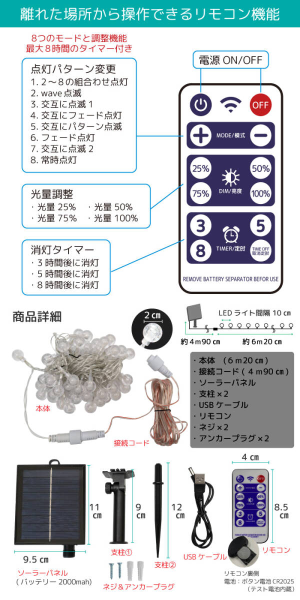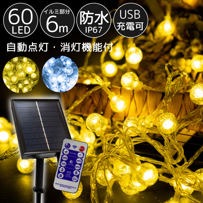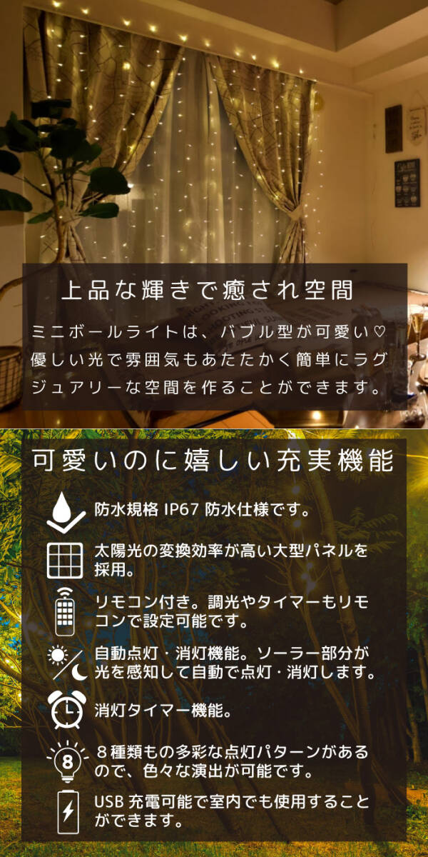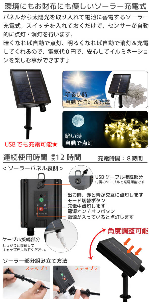 | ご自宅や店舗のイルミネーションに屋外OK! 可愛いバブル型がおしゃれな空間を簡単にアレンジできます♪ 【商品詳細】 ■商品コード:FJ3977 ■LED60球/バブル 丸形 ■本体:約6m20cm・接続コード:約4m90cm ■配線カラー:クリア ■リモコン付き ■自動点灯・消灯機能付き ■消灯タイマー付き ■点灯パターン:8種類 ■ソーラー充電式:連続使用時間12時間(最大) ■充電時間:8時間 ■ソーラーパネルバッテリー:2000mah ■LEDカラー ・ゴールド ・ホワイト ※発送時に点灯チェックを行っておりますが、まれに点灯不良箇所がある場合が御座います。 その際は商品到着日より7日以内に限り御対応させて頂きますのでお早めに御連絡願います。 但し、点灯不良灯数が5%以下の場合は対象外となりますので予め御理解御了承の上御購入願います。 |