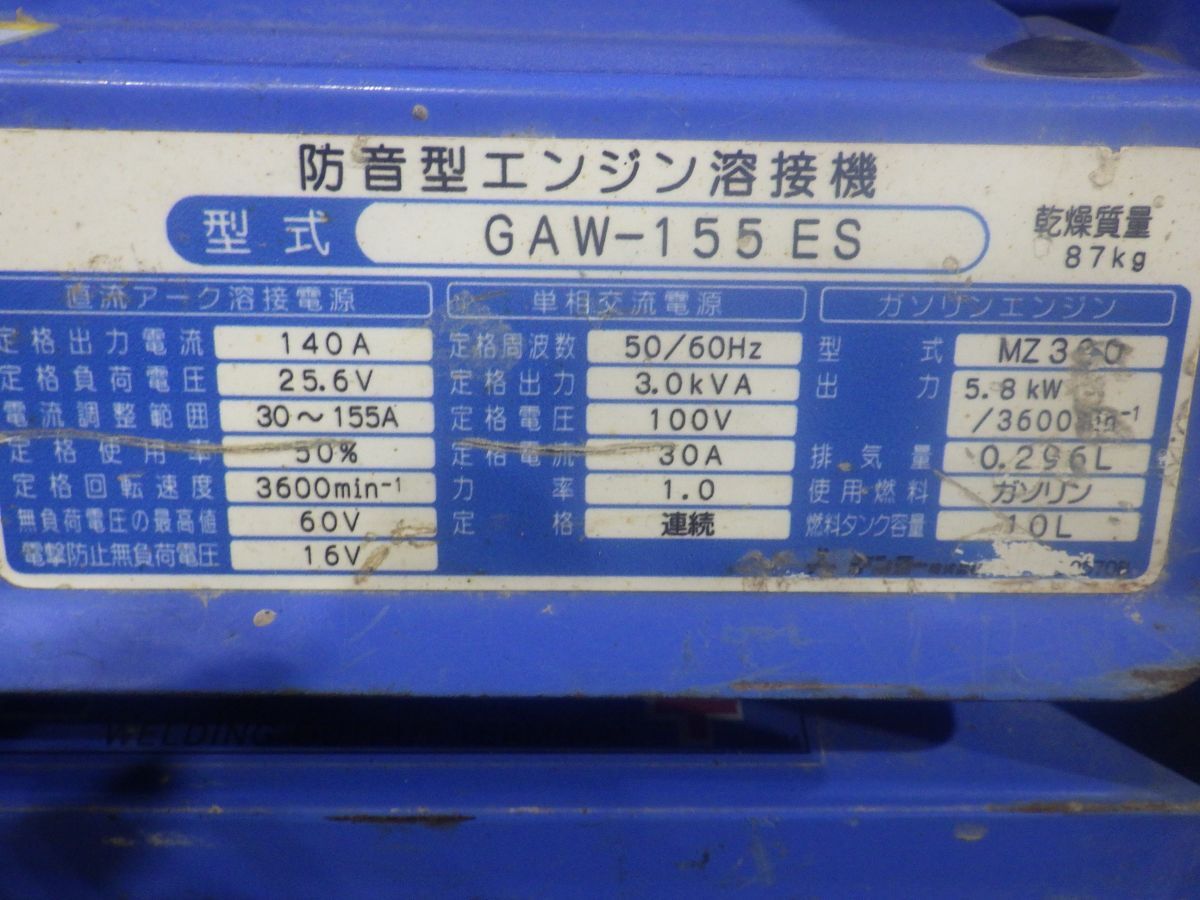 えf3133▼ デンヨー Denyo 小型 エンジン 溶接機 超低騒音型 GAW-155ES 定格出力3.58kW 定格電流140A 30~155A アイドリングストップ | |||