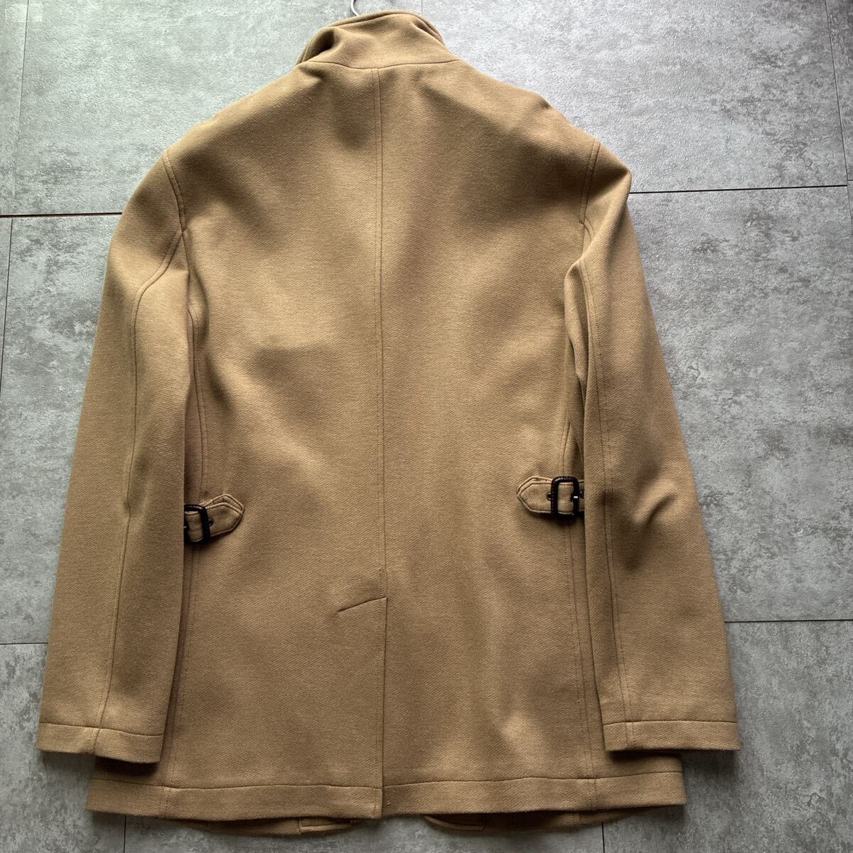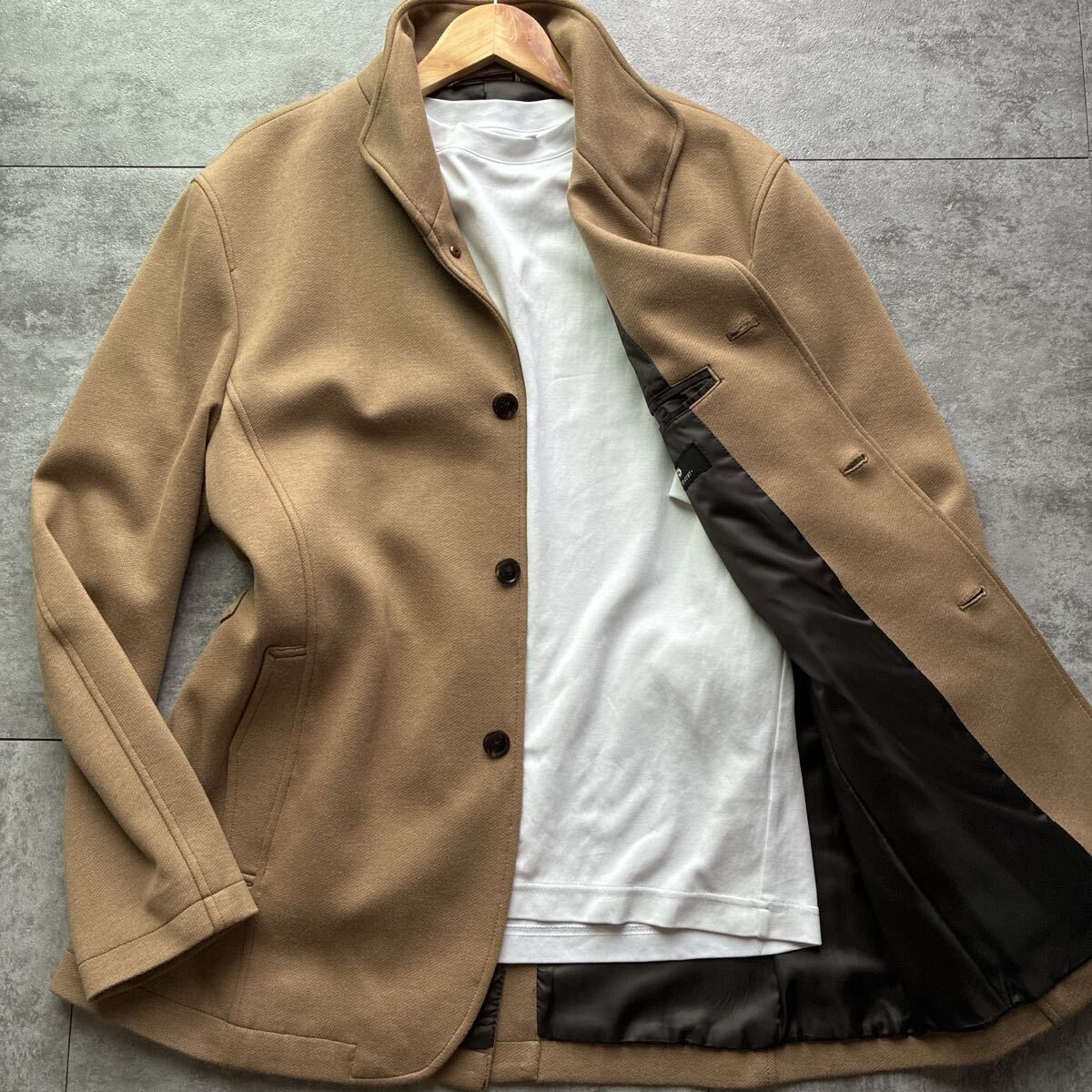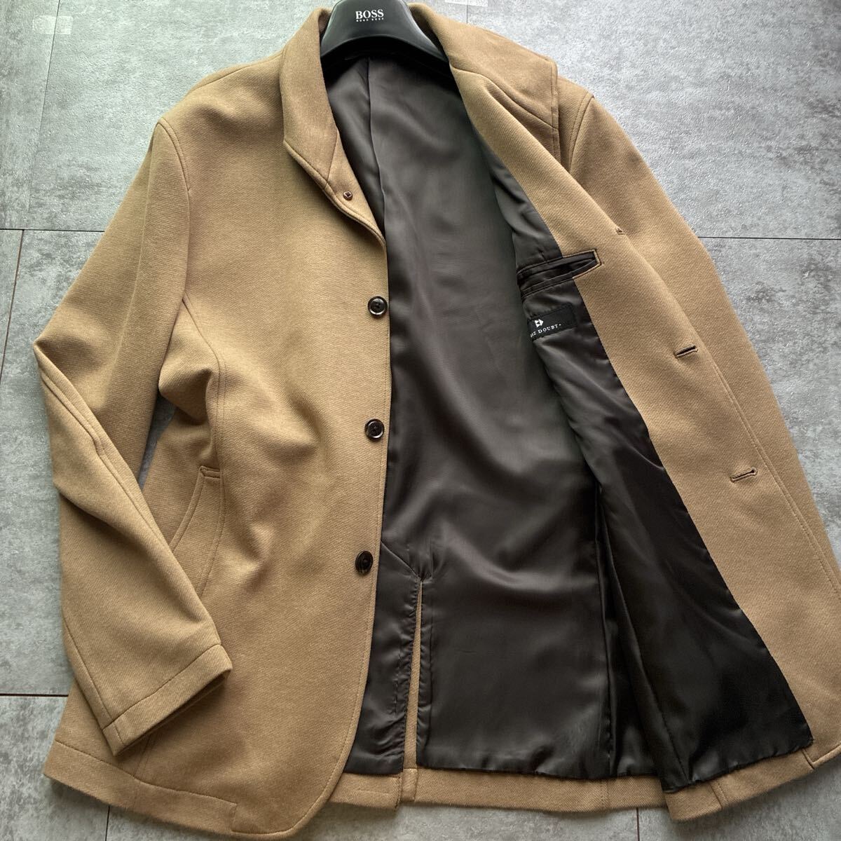 BIZ DOUBT(ビズダウト)のジャケットコートです。落ち着いたキャメルベージュカラーで、ビジネスからカジュアルまで幅広く対応できる万能アイテムです。