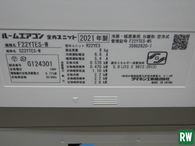 | 【6畳用】ルームエアコン ダイキン 内機:F22YTES-W 外機:R22YES 100V 2021年製 壁掛形 冷房 |