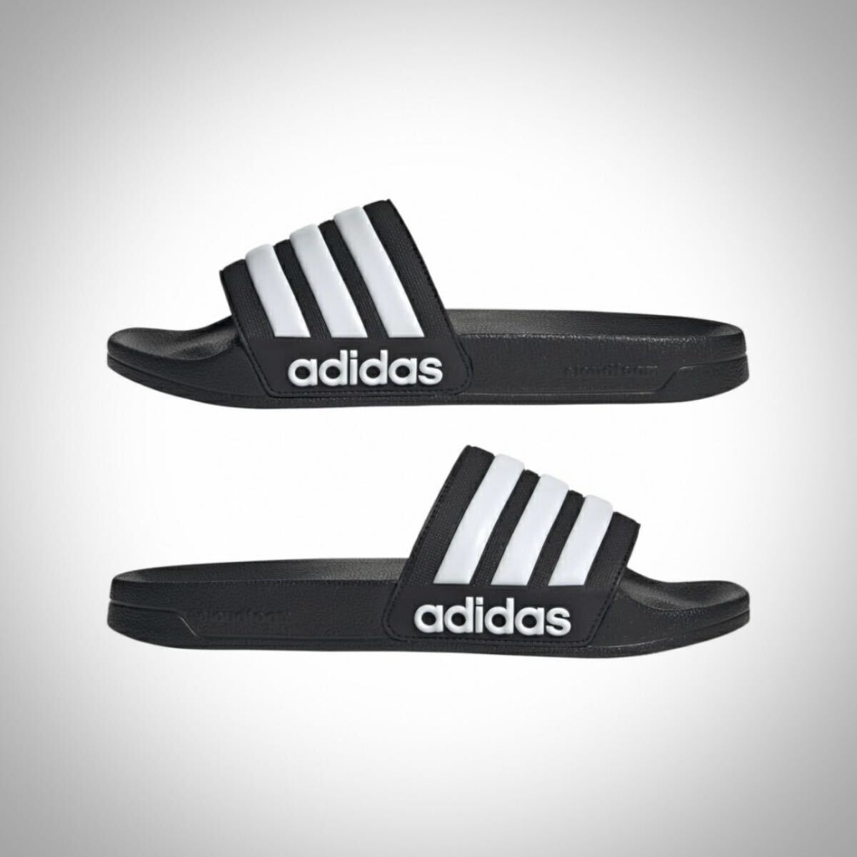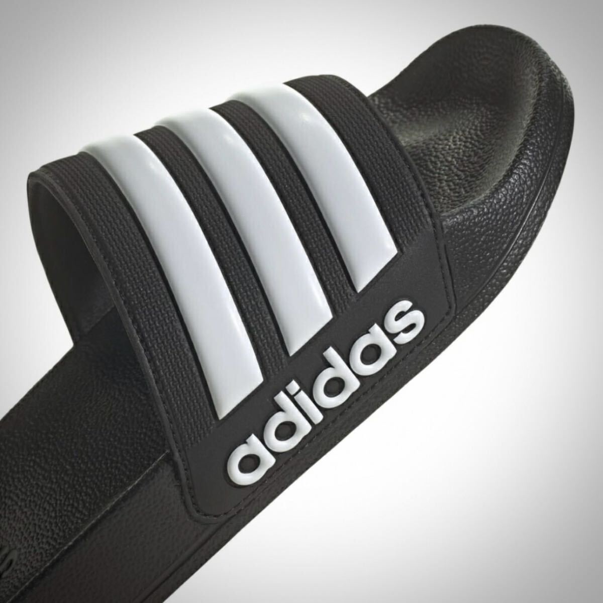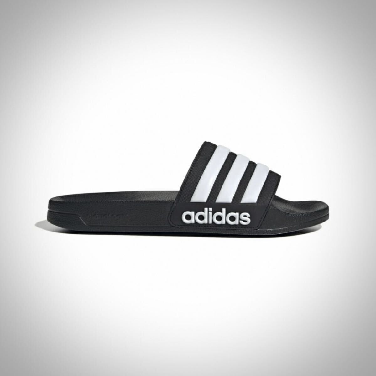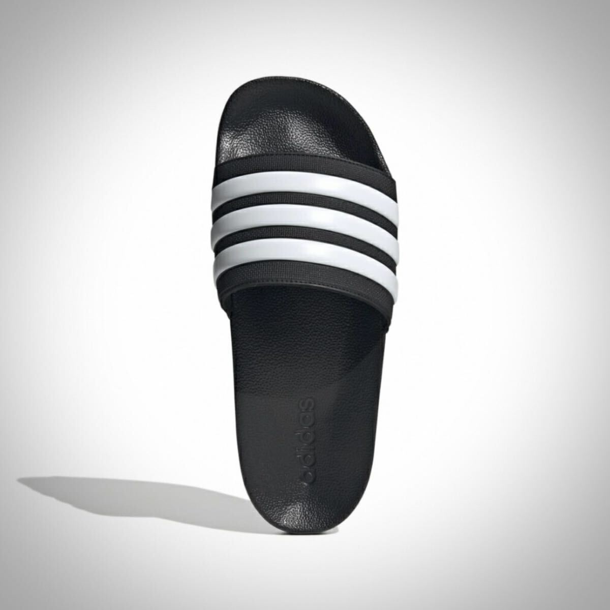 アディダスロゴとスリーストライプスをあしらって、アイコニックなアディレッタスタイルを完成させている。