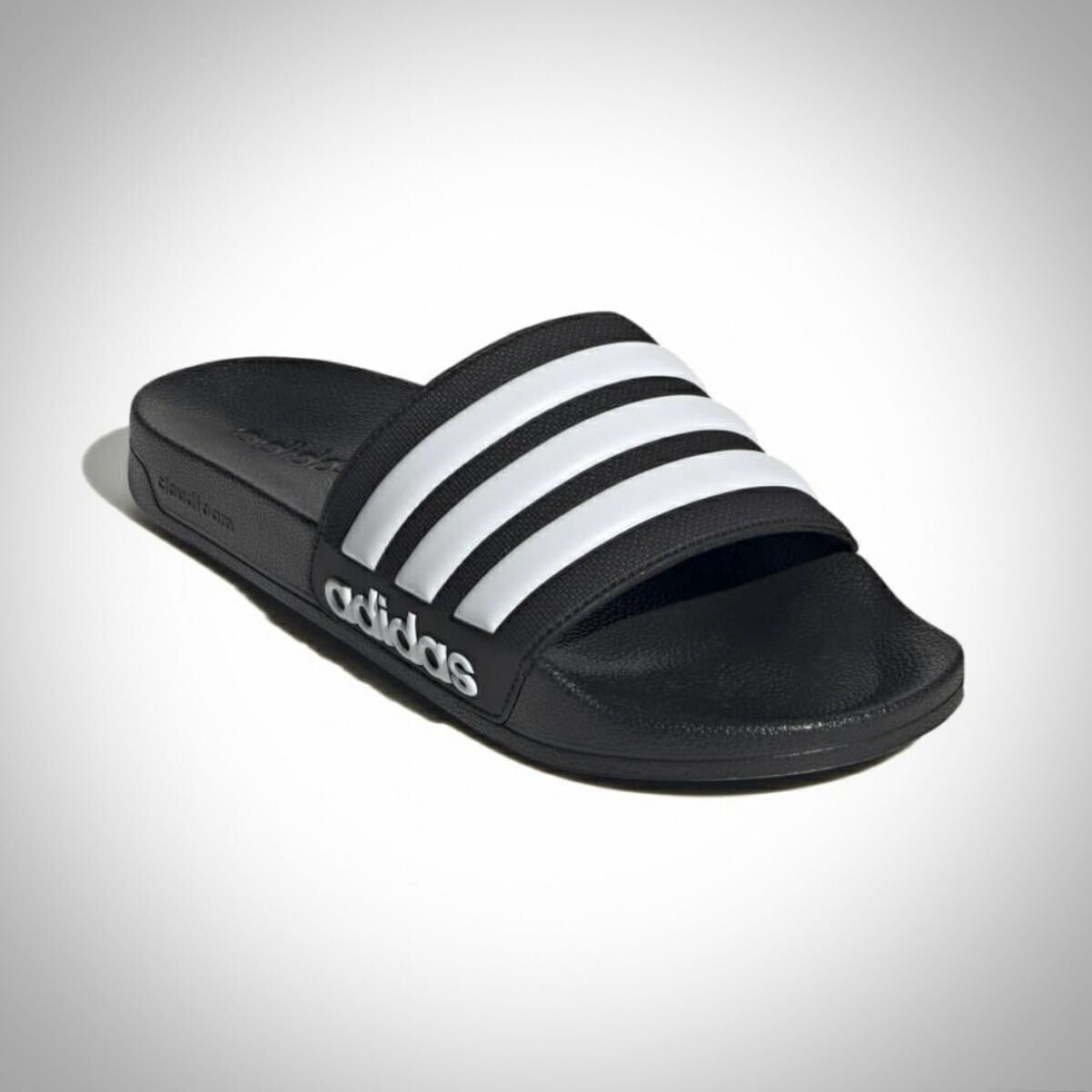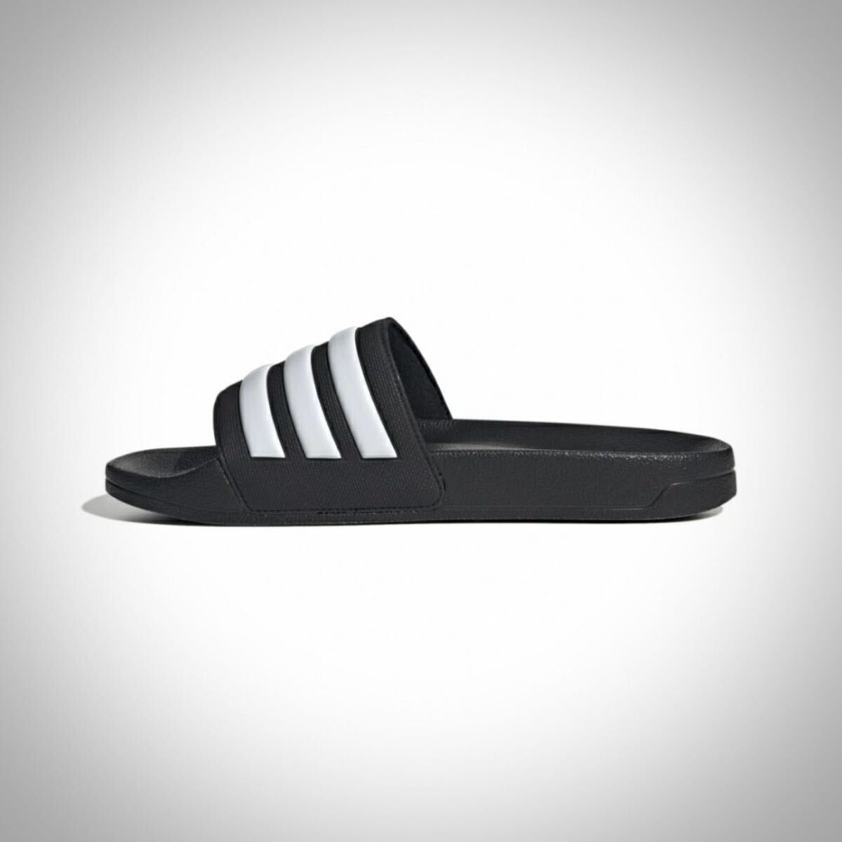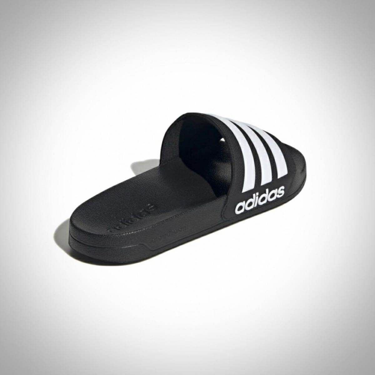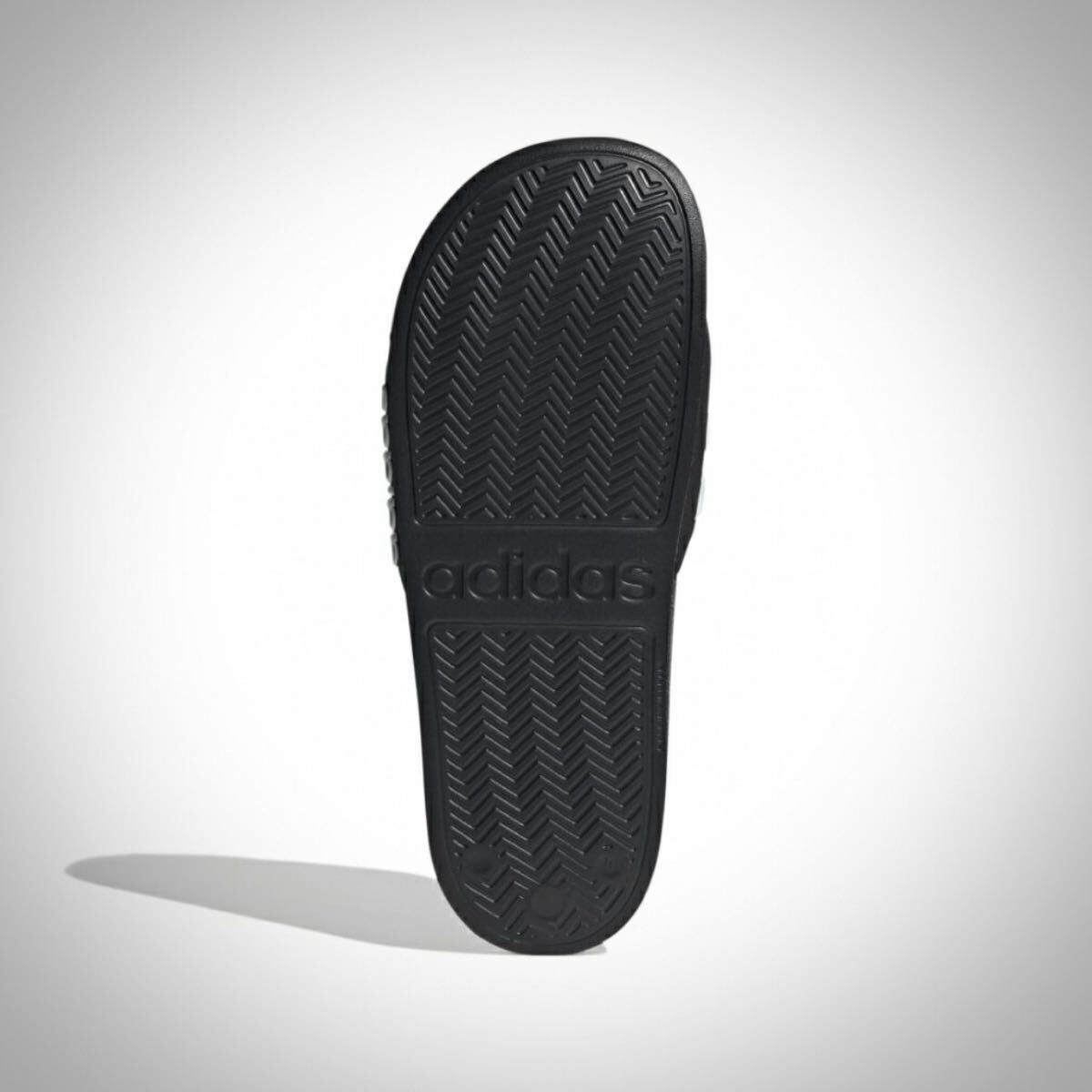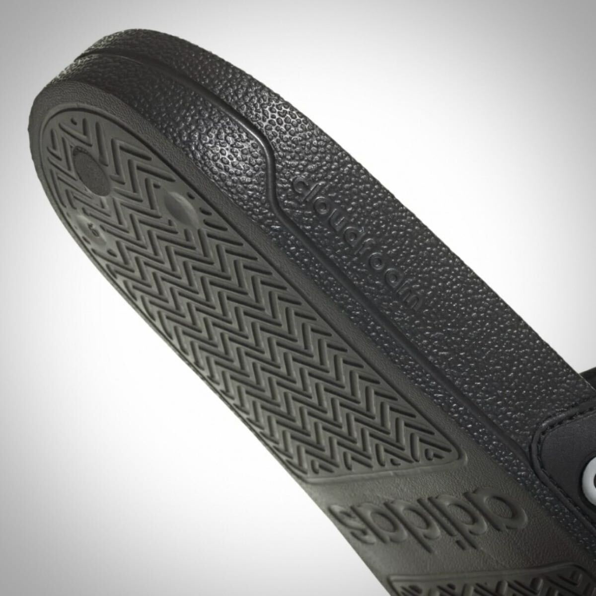 アディダスロゴとスリーストライプスをあしらって、アイコニックなアディレッタスタイルを完成させている。