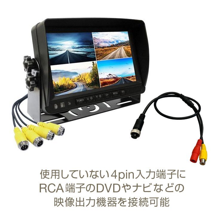 4pin入力端子のモニタ等にRCA端子のカメラやDVD、ナビなどの映像出力機器を接続する場合等にも活躍します。
