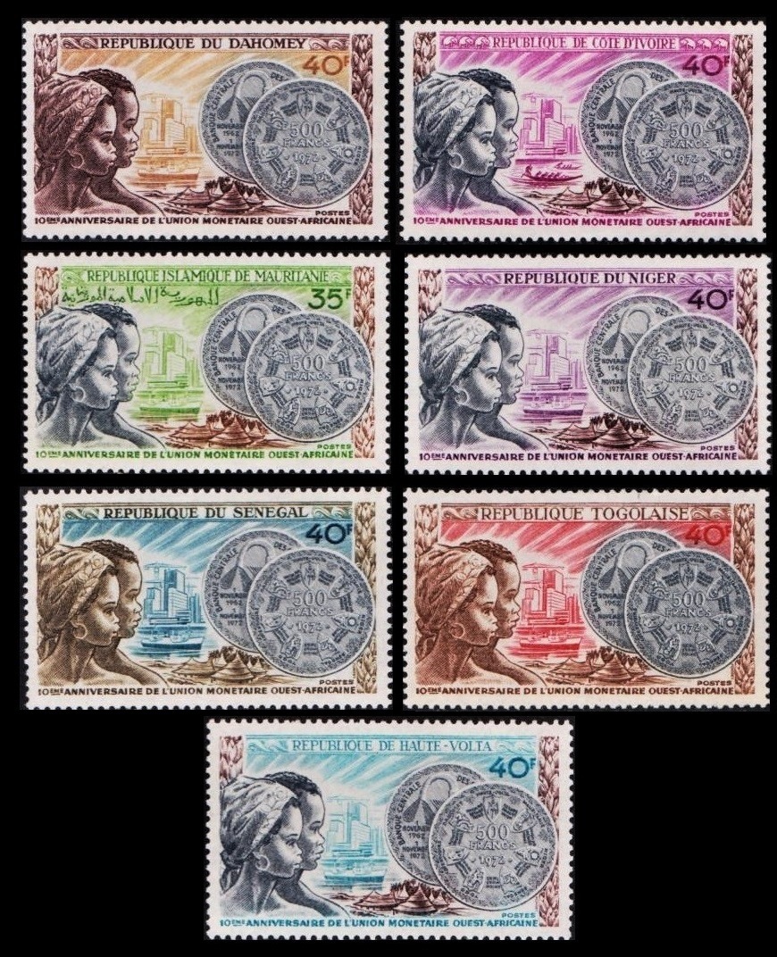 西アフリカ通貨同盟の共通デザイン、全7カ国7枚完です。