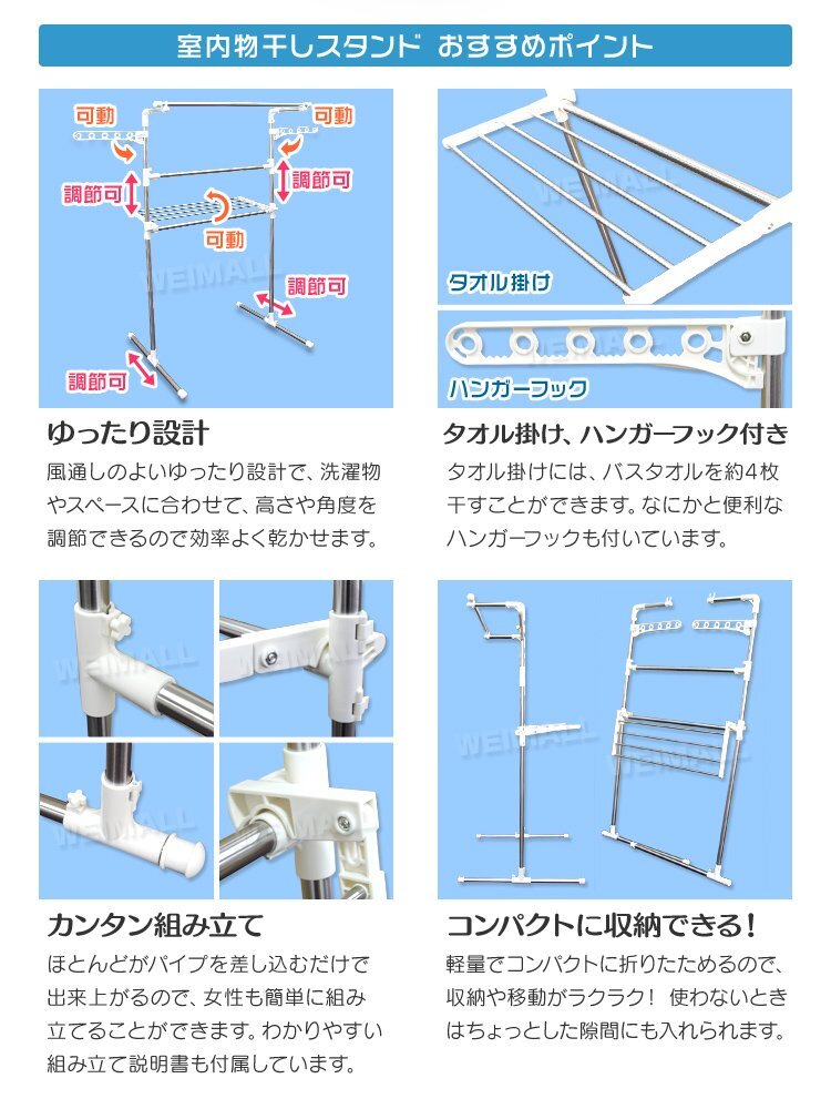 一人暮らしや省スペースに最適な室内物干しです。 工具不要で簡単組立式、はめこむだけで楽に組立ができます。 ステンレス製なので、丈夫でサビに強く安心してご使用頂けます。 干すスペースを増やせる追加ハンガー掛け付き! 更にタオルハンガー付きです! 折りたたみやすく、コンパクトに収納が可能♪ ■商品コード:HDA00100 ■商品仕様 内容:本体 ×1 サイズ:(約)幅80~142×奥行63×高さ140cm(使用時) (約)幅89×奥行11×高さ140cm(収納時) 重量:(約)2.6kg 耐荷重:全体(約)15kgまで 材質:ステンレス巻きパイプ、ABS樹脂他 ■注意事項 ・座面の上に立ったり、脚をかけたり、飛び乗ったりしないでください。 ・直射日光またはストーブ等の熱は避けてご使用ください。 ・本製品を改造、分解しないでください。 ・本製品を用途以外で使用しないでください。 ・使用中にガタつきなどがみられる際は、ネジを締め直してください。 ・商品は、モニターによって色合いが異なって見える場合があります。 ・仕様・デザインは改良のため予告なく変更することがあります。 ■保証期間 7日間 ※商品到着後7日以内の初期不良・破損のみご対応させていただきます。 【新品未使用品です】 |