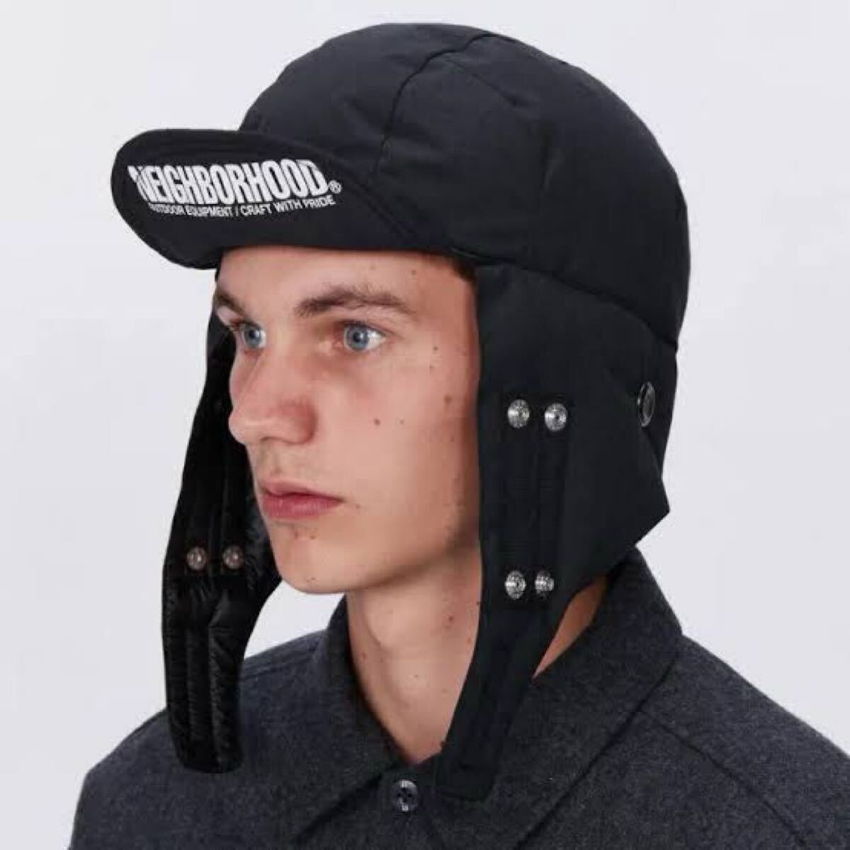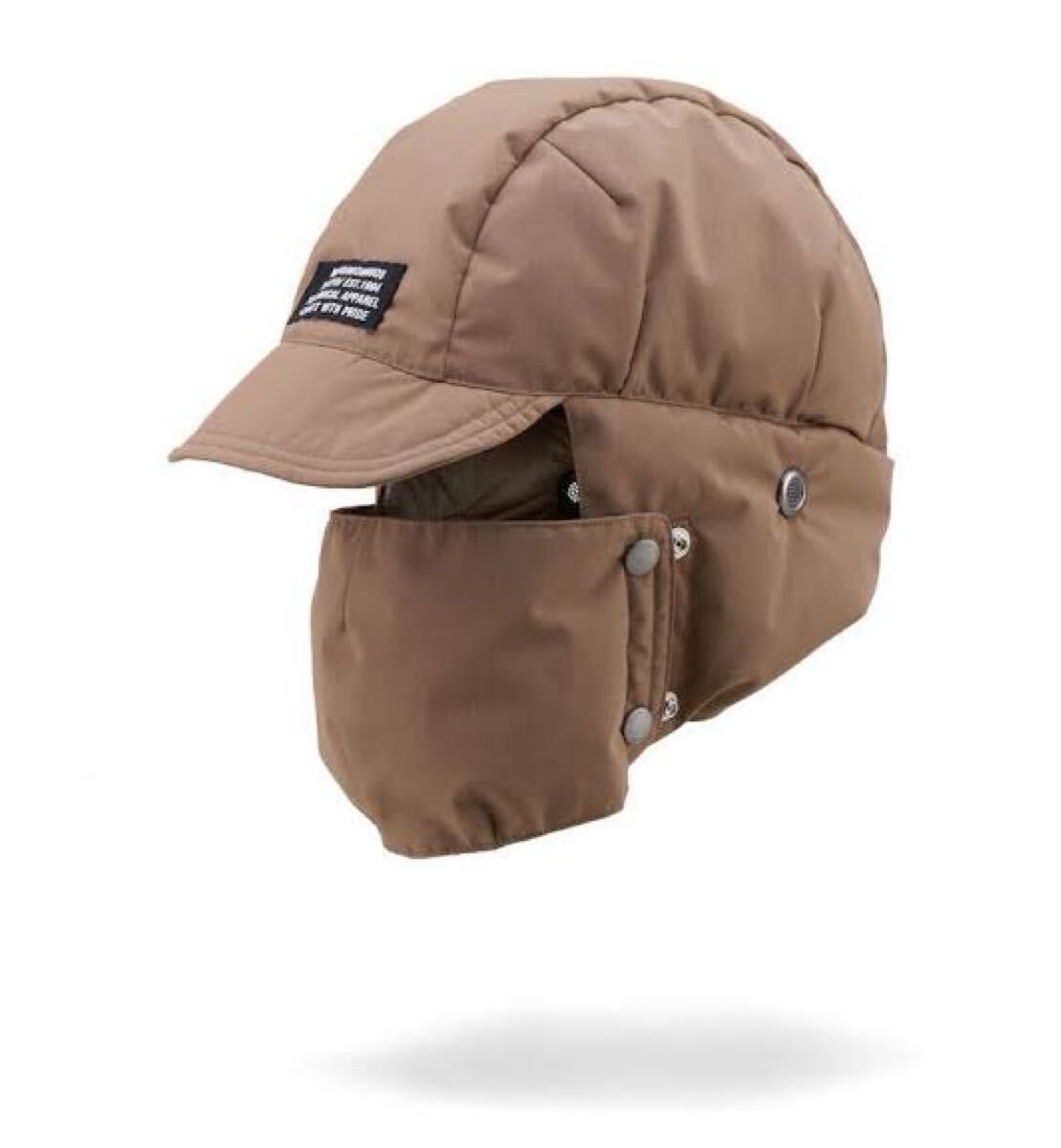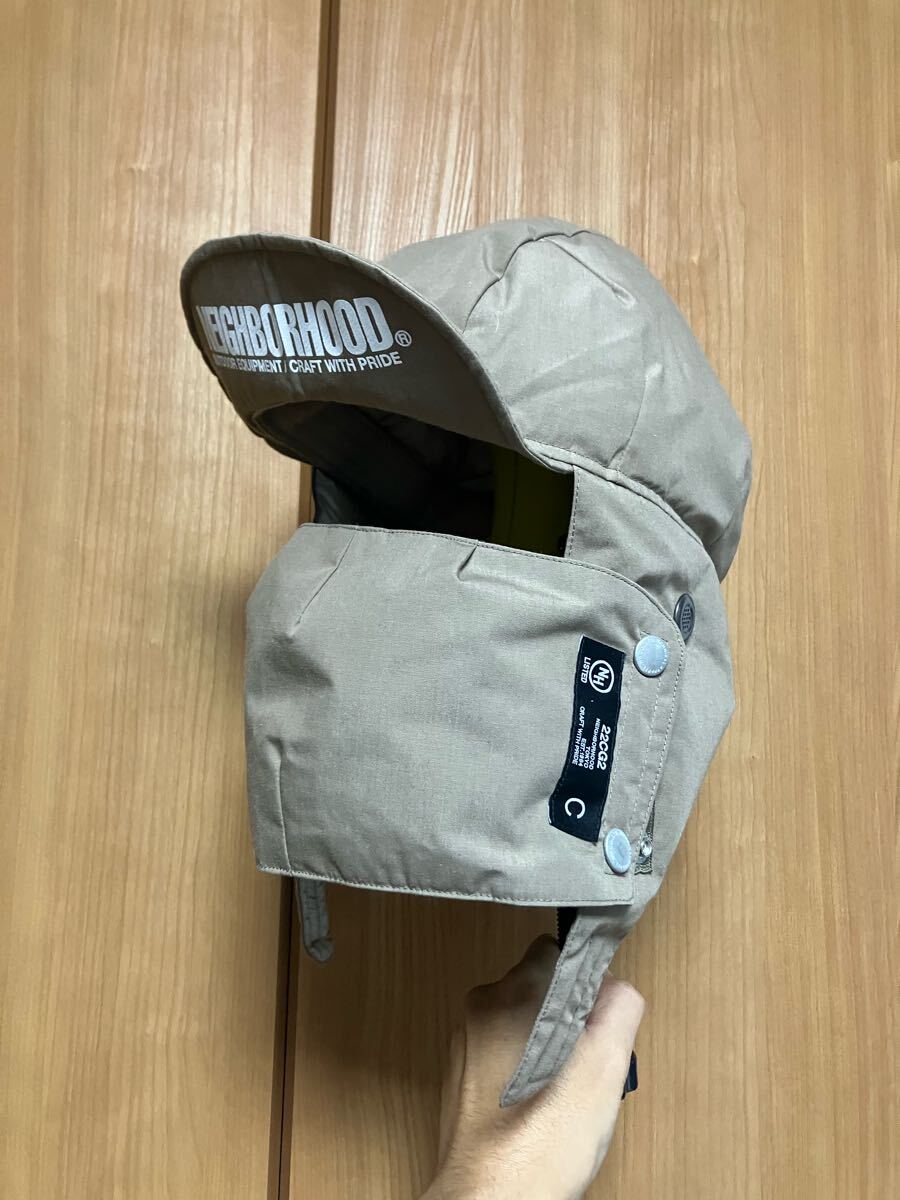 NEIGHBORHOOD HARAJUKU表地にNANGAがオリジナルで開発した難燃素材のTAKIBI生地を使用したダウンキャップ。ベルクロ留めの顎ストラップ、スナップ留めの外付けマスクが付属するデザイン。裏地には10デニールのリサイクルナイロン素材、外付けマスクの内側には肌触りの良い東レのソーラーセンサーを採用。バイザー裏にCIロゴのラバープリント。