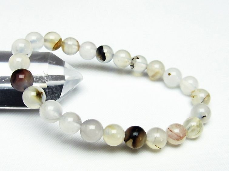 ■商品名: デンドリック アゲート ブレスレット ■商品ID: T108-5710 ■商品重量:約 17.6g ■商品サイズ:内周約:161mm(±5mm)粒直径約:8mm(±0.5mm) 【アゲート(瑪瑙)】 和名では瑪瑙(めのう)といい、アゲートの模様が馬の脳のように見える事からこのような名前が付けられました。 アゲートは赤、緑、青、黄、黒など、様々な色に着色されることで石本来のパワーがさらにアップするといわれており、着色により魅力を増す天然石はアゲートだけとも言えます。 さらにはアゲートを組み合わせるとペアになっているペアアゲート(トレジャーメノウ)は龍穴を生み出すとされ、風水的にも良いといわれています。 アゲートは古来より日本やインドやチベットなどで魔よけやお守りとされてきました。 失敗や不幸を遠ざけ金運や仕事運、成功運とも結び付けてくれる効果のほか、安産のお守りにも良いとされています。 さらに家庭円満や対人関係をスムーズにするなど、オールマイティな効果を持った石です。 ⇒ アゲートをもっと詳しく ◆ワンポイント情報 アゲートはカルセドニーの変種で、染色がされていなくともそれぞれの種類に多様な色があります。 ざっと仲間を挙げてみてもオニキス(黒)、サードニクス(橙色)、ブルーアゲート(青)、グリーンアゲート(緑)、イエローアゲート(黄)、ブルーレースアゲート(縞青)、モスアゲート(縞緑)、天眼石(縞黒)、カーネリアン(橙色)、ジャスパー(多様な縞)などとても多くの特徴と色合いを持っています。 |
