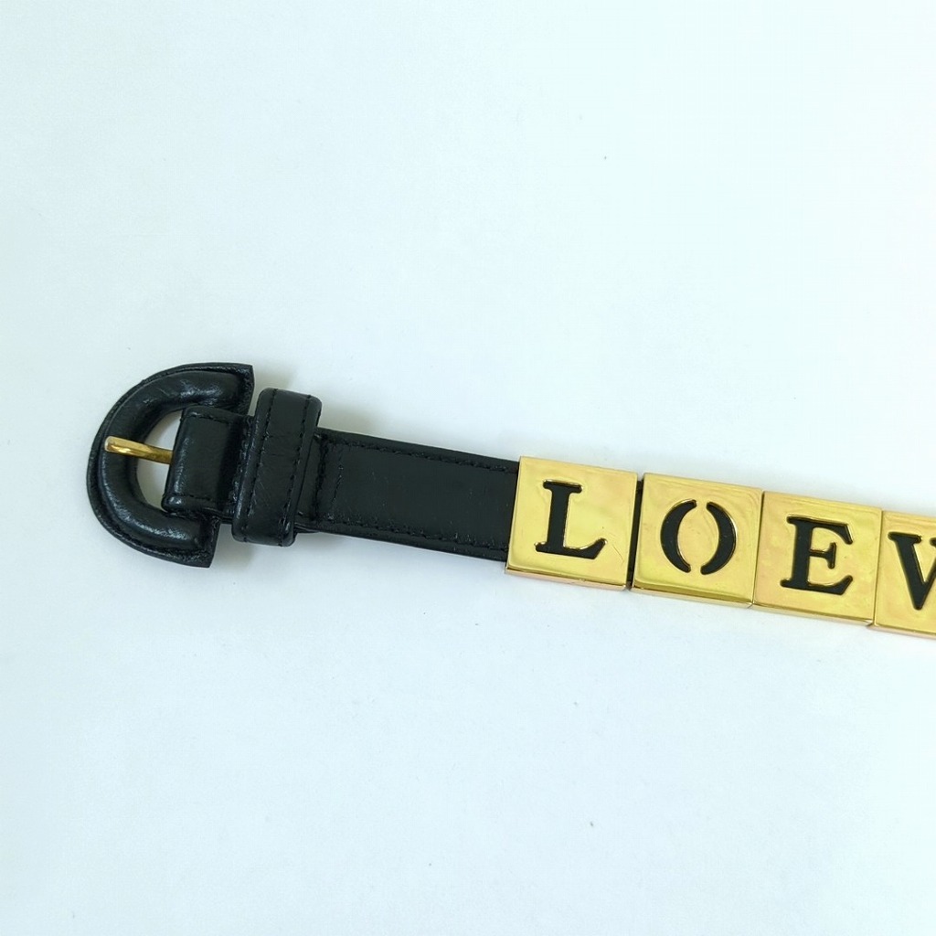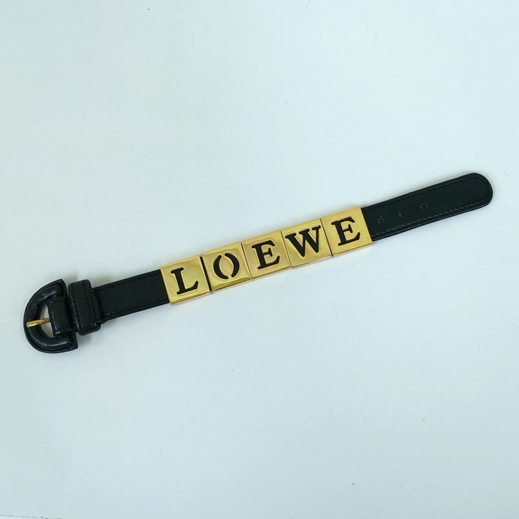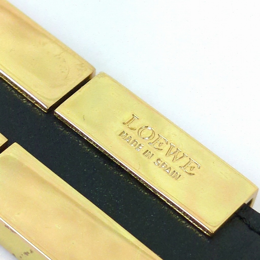 1006-7oji9240O ロエベ レザー キューブ チャーム ブレスレット ブラック ゴールド金属 スペイン製 【コンディション】 金属に小傷や少し変色があります。レザーに少しすれ傷あります。 中古品ですので写真の状態をよくご覧ください。 【サイズ】 全長:23.5cm 着用サイズ:約17.5cm~19.5cm レザー:幅約1.7cm ロゴの部分(金属):縦約2cm、横約10cm 多少の誤差はご了承ください。 【付属品】 なし