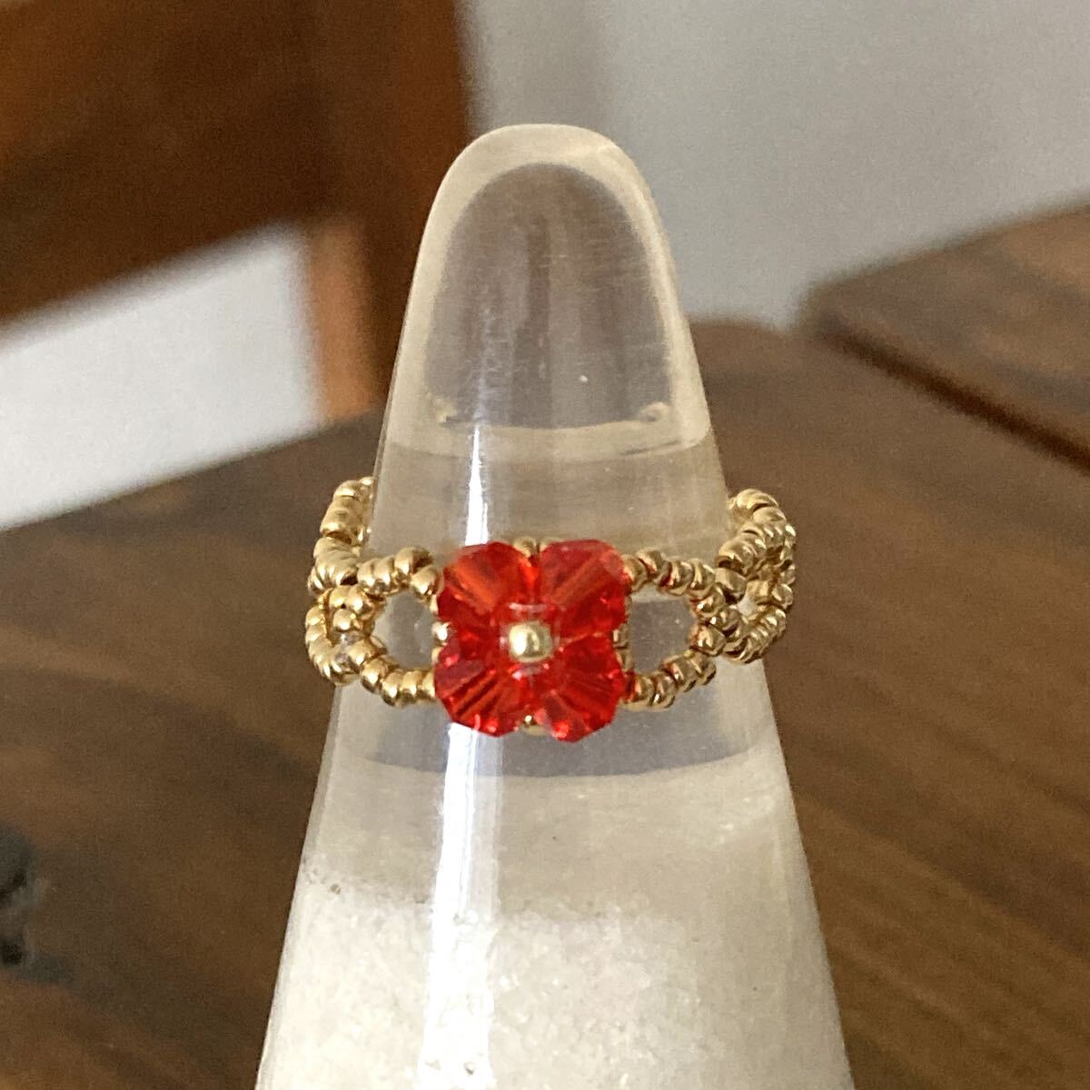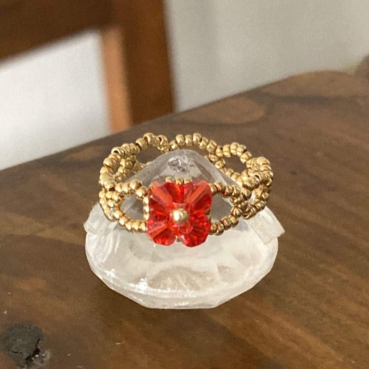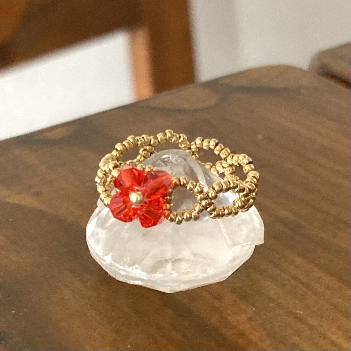 13-15号 ビーズ リング 指輪 ハンドメイド スワロフスキーのお花ひとつリング 赤×ゴールド です。
