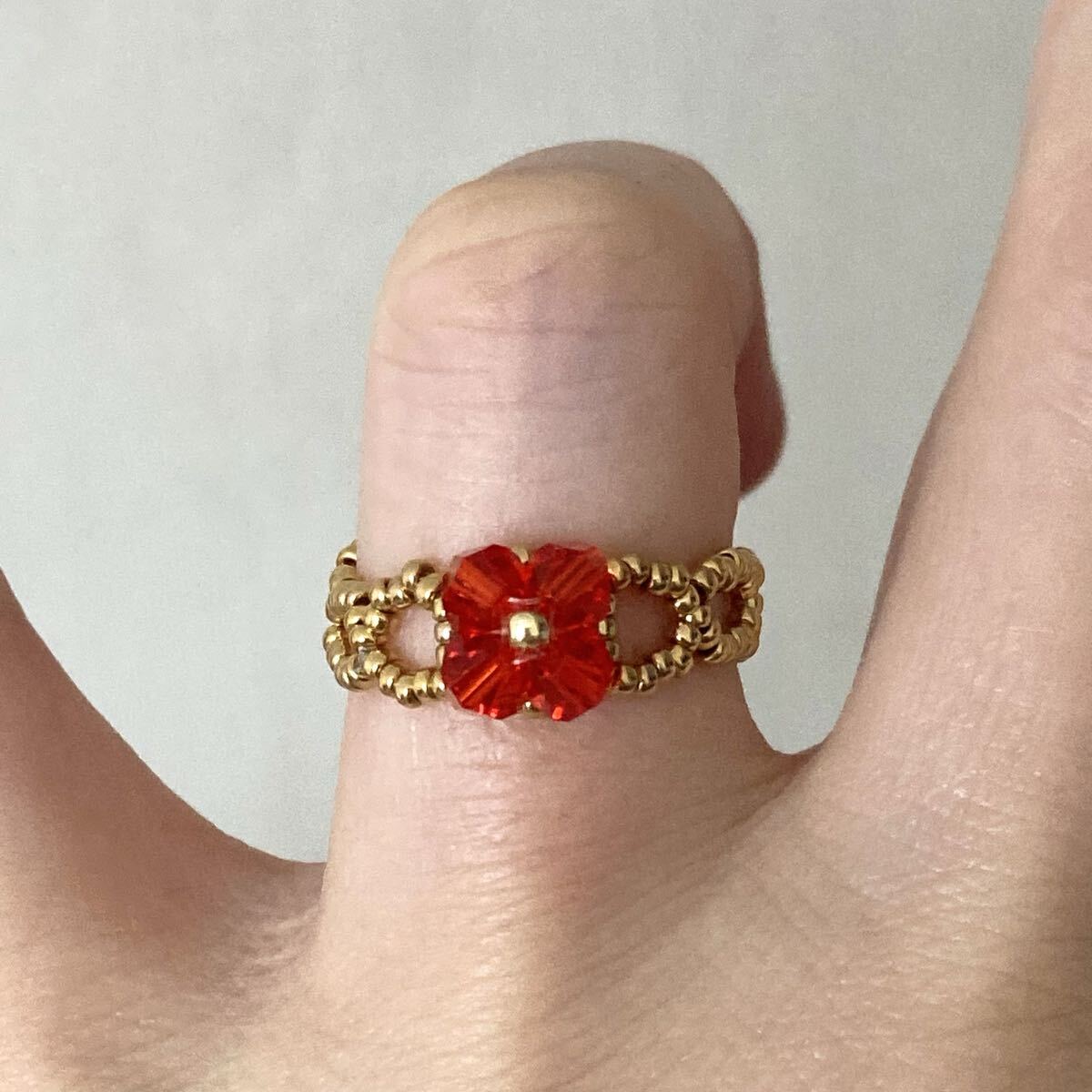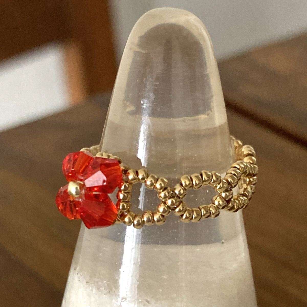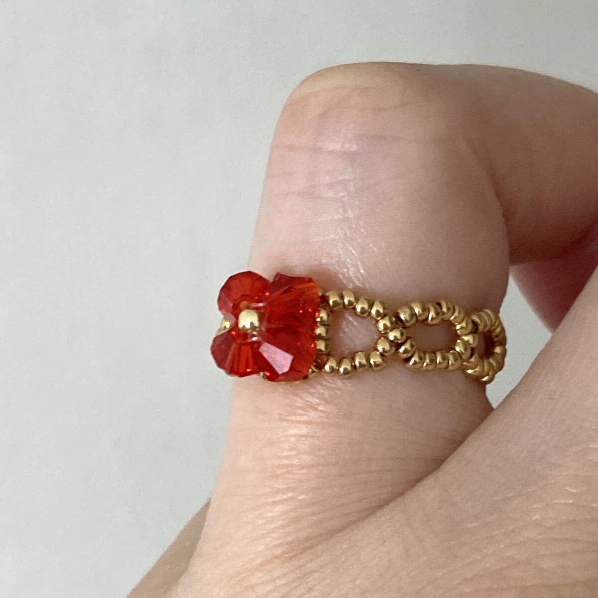 13-15号 ビーズ リング 指輪 ハンドメイド スワロフスキーのお花ひとつリング 赤×ゴールド です。