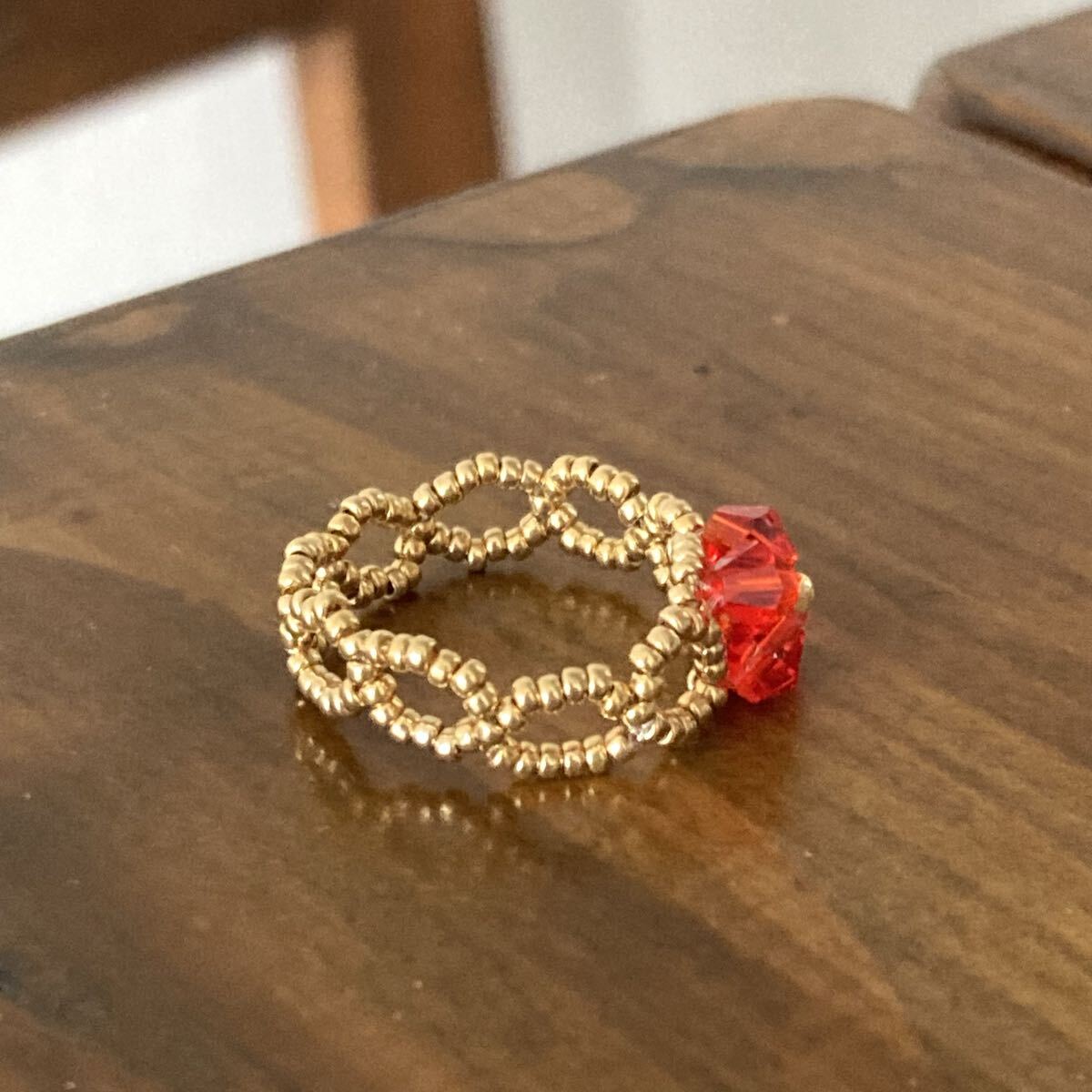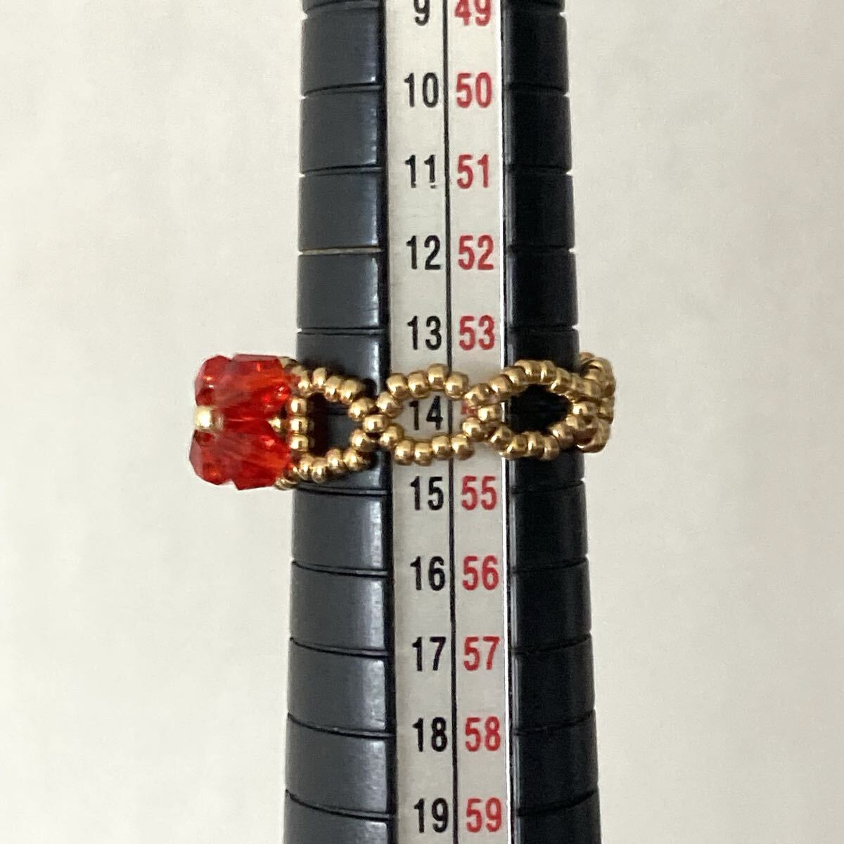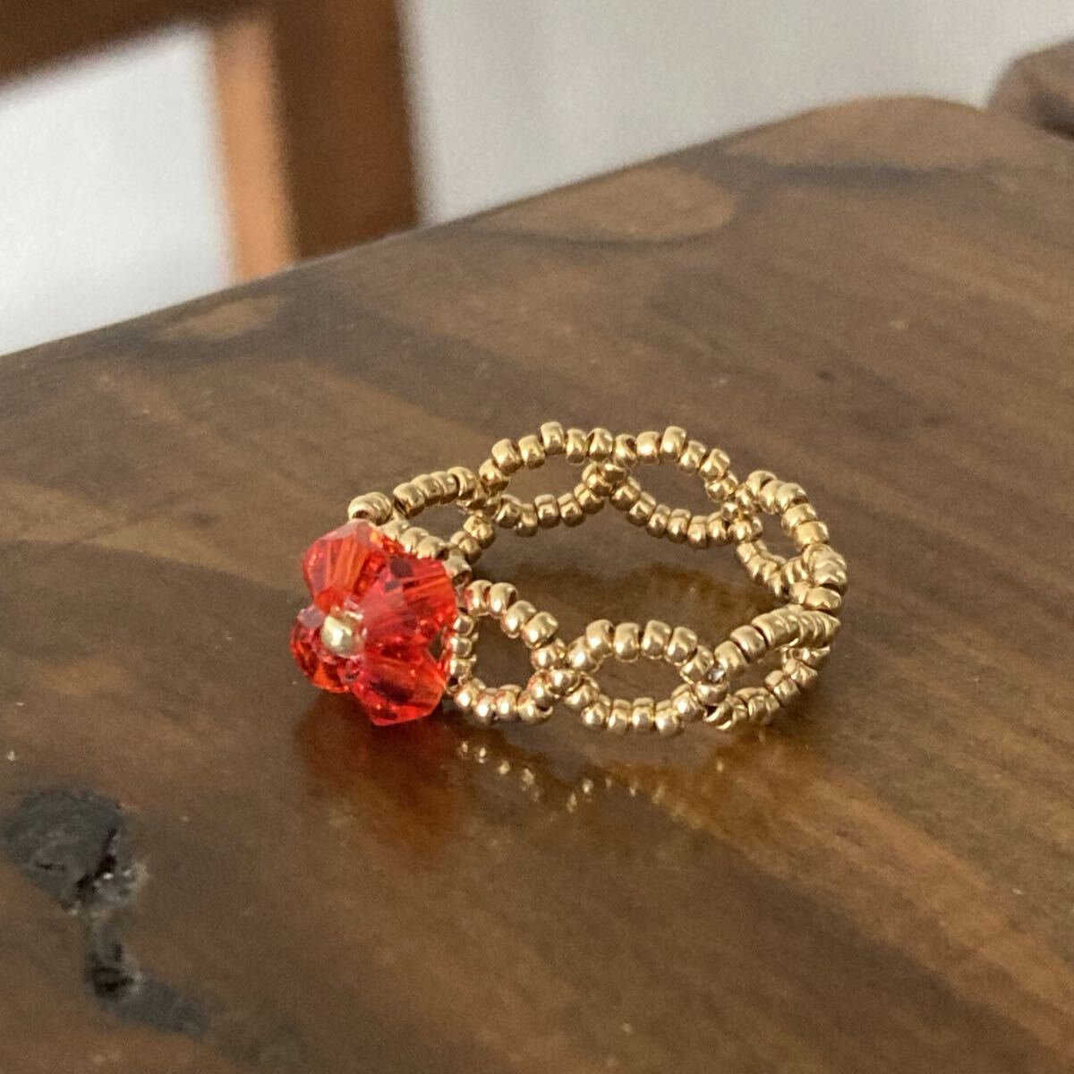 4mmの明るめの赤のスワロフスキー、ゴールドカラーの特小ビーズで作ったリングです。