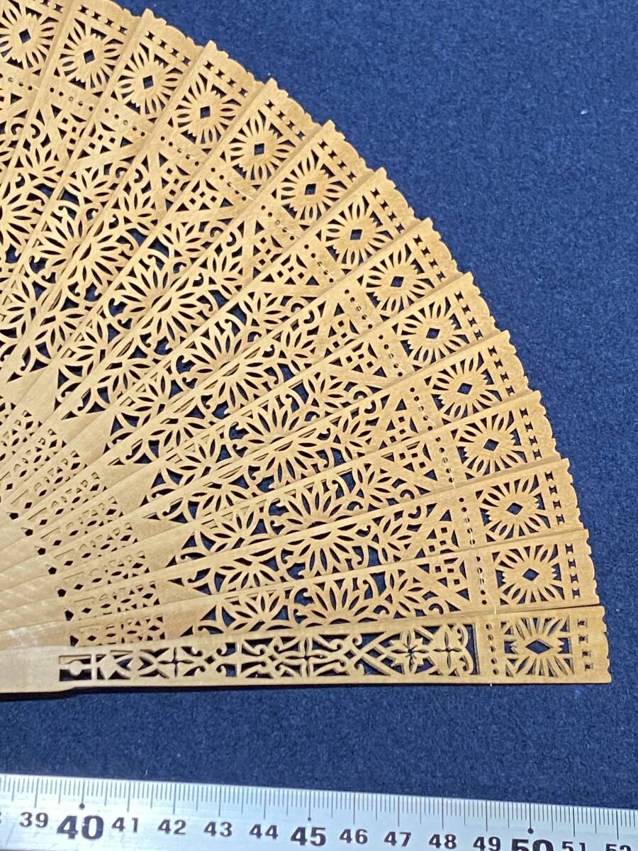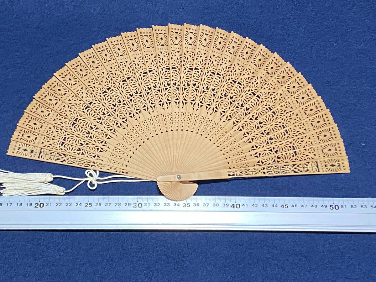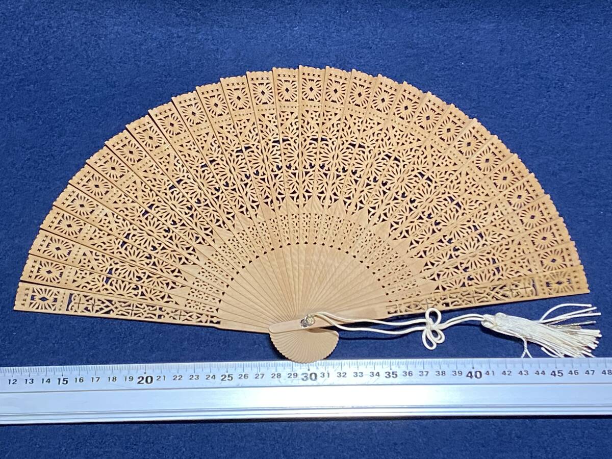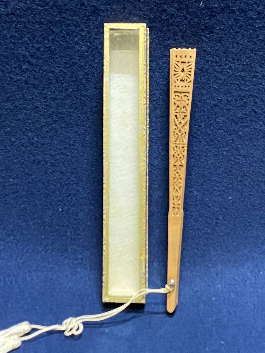 この品は、中国製の白檀(香木)による透かし彫り扇子で、共箱入りの高級工芸品。木彫による幾何学模様や彫刻が施されており、アンティーク・骨董品としての評価が可能。