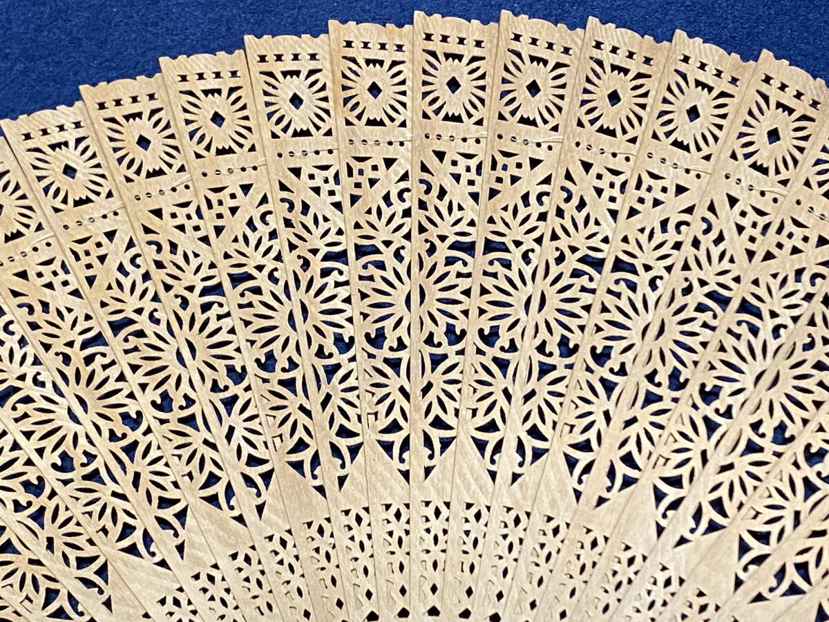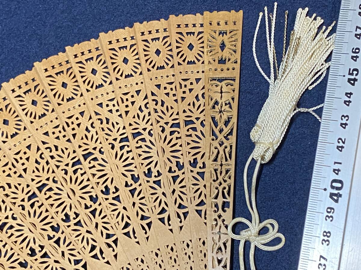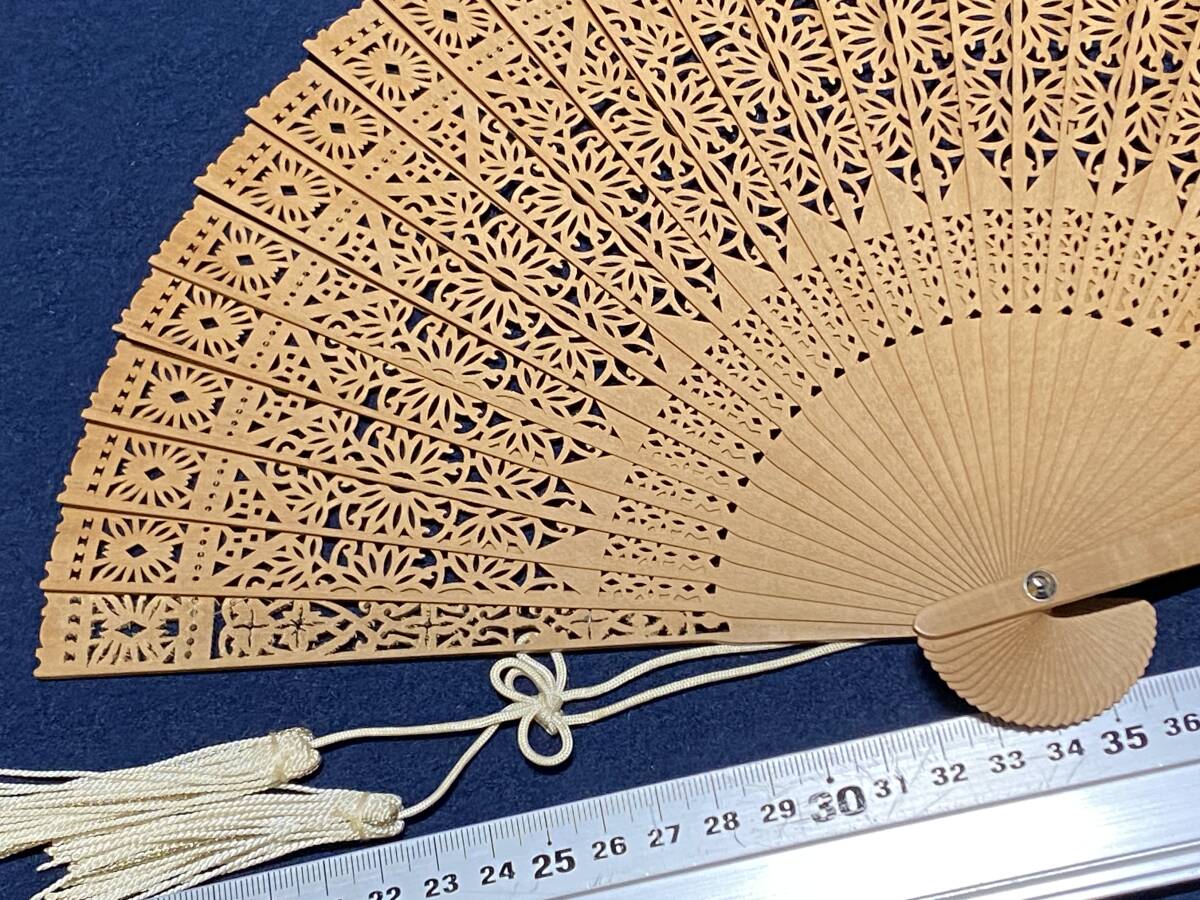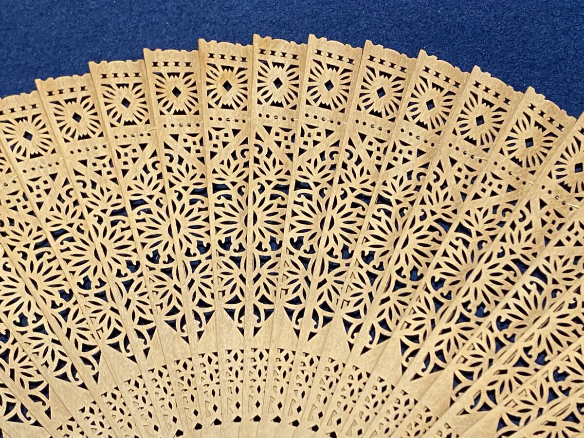 この品は、中国製の白檀(香木)による透かし彫り扇子で、共箱入りの高級工芸品。木彫による幾何学模様や彫刻が施されており、アンティーク・骨董品としての評価が可能。
